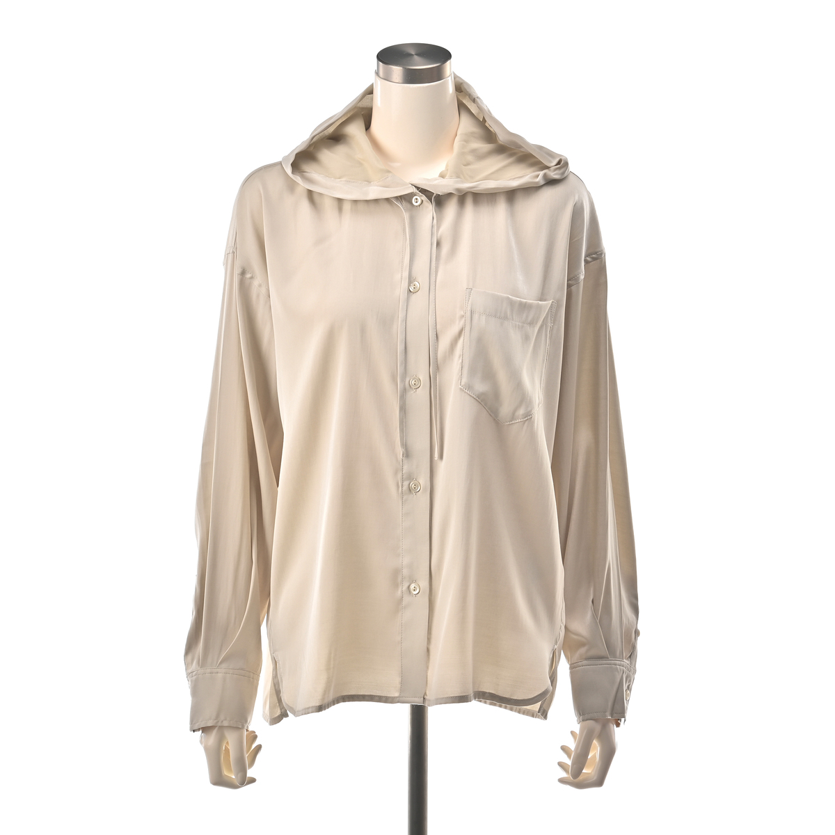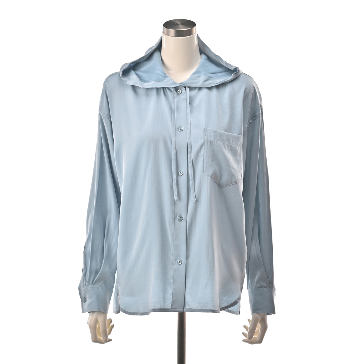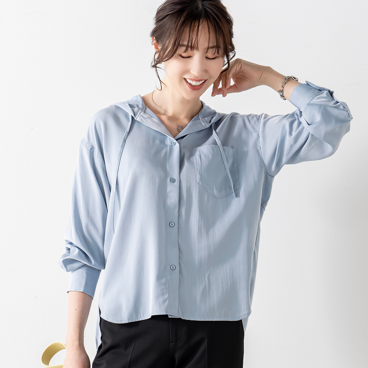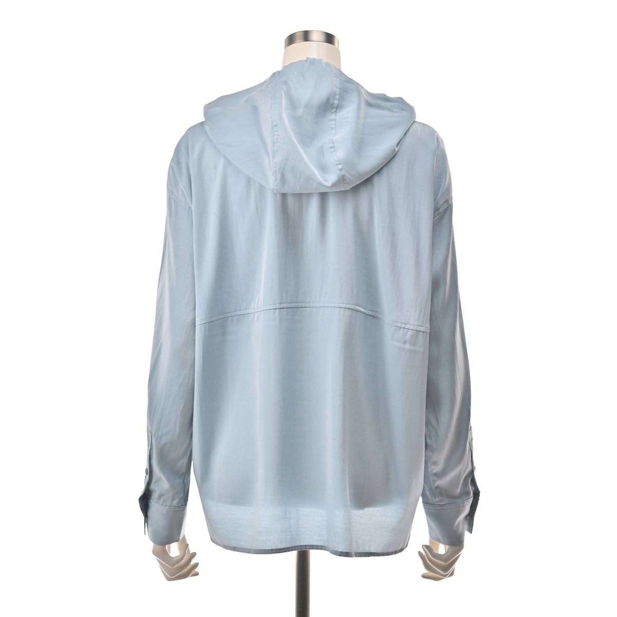 レーヨン混のとろみ素材を使った、軽やかな着心地のフードシャツです。滑らかな風合いと繊細な綾目が生む控えめな光沢で、カジュアルになりすぎず洗練された印象に。フードは首元に柔らかく馴染み、自然な抜け感を演出します