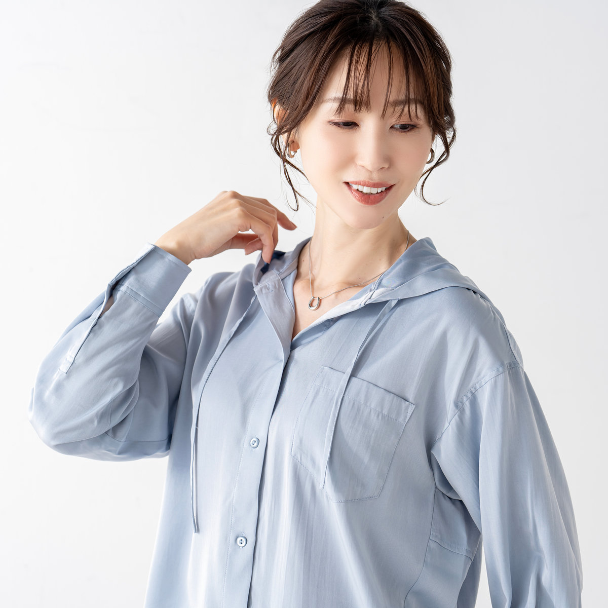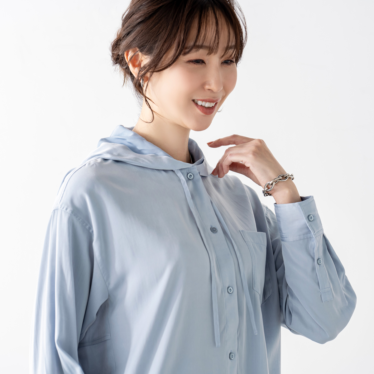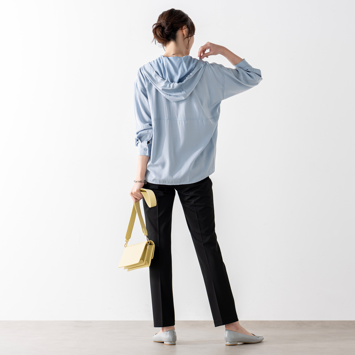 レーヨン混のとろみ素材を使った、軽やかな着心地のフードシャツです。滑らかな風合いと繊細な綾目が生む控えめな光沢で、カジュアルになりすぎず洗練された印象に。フードは首元に柔らかく馴染み、自然な抜け感を演出します