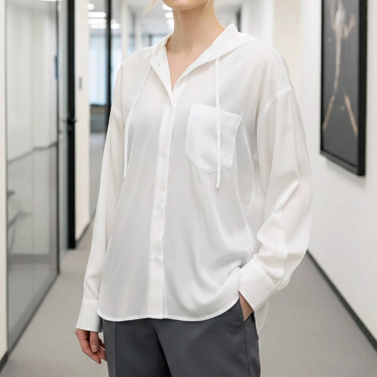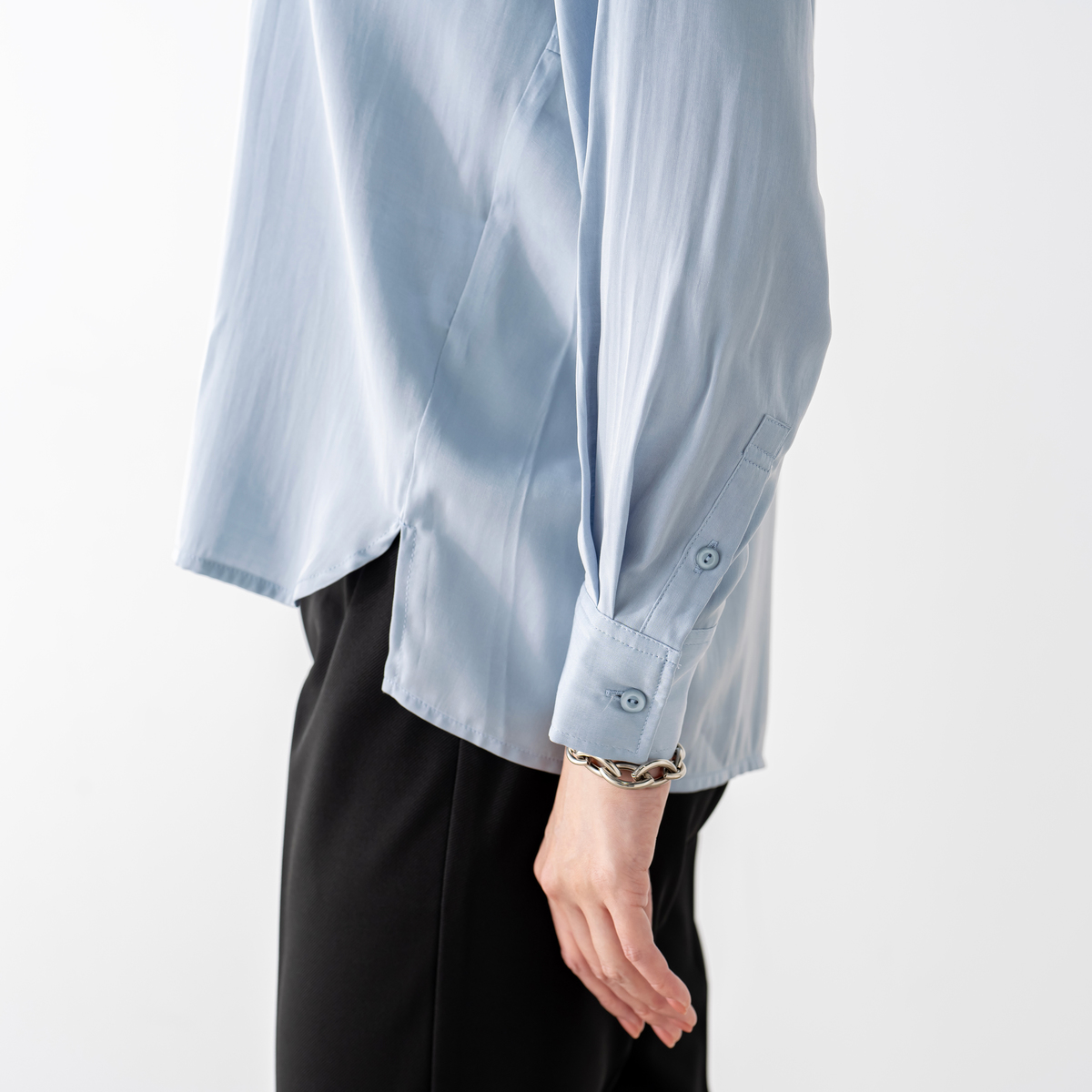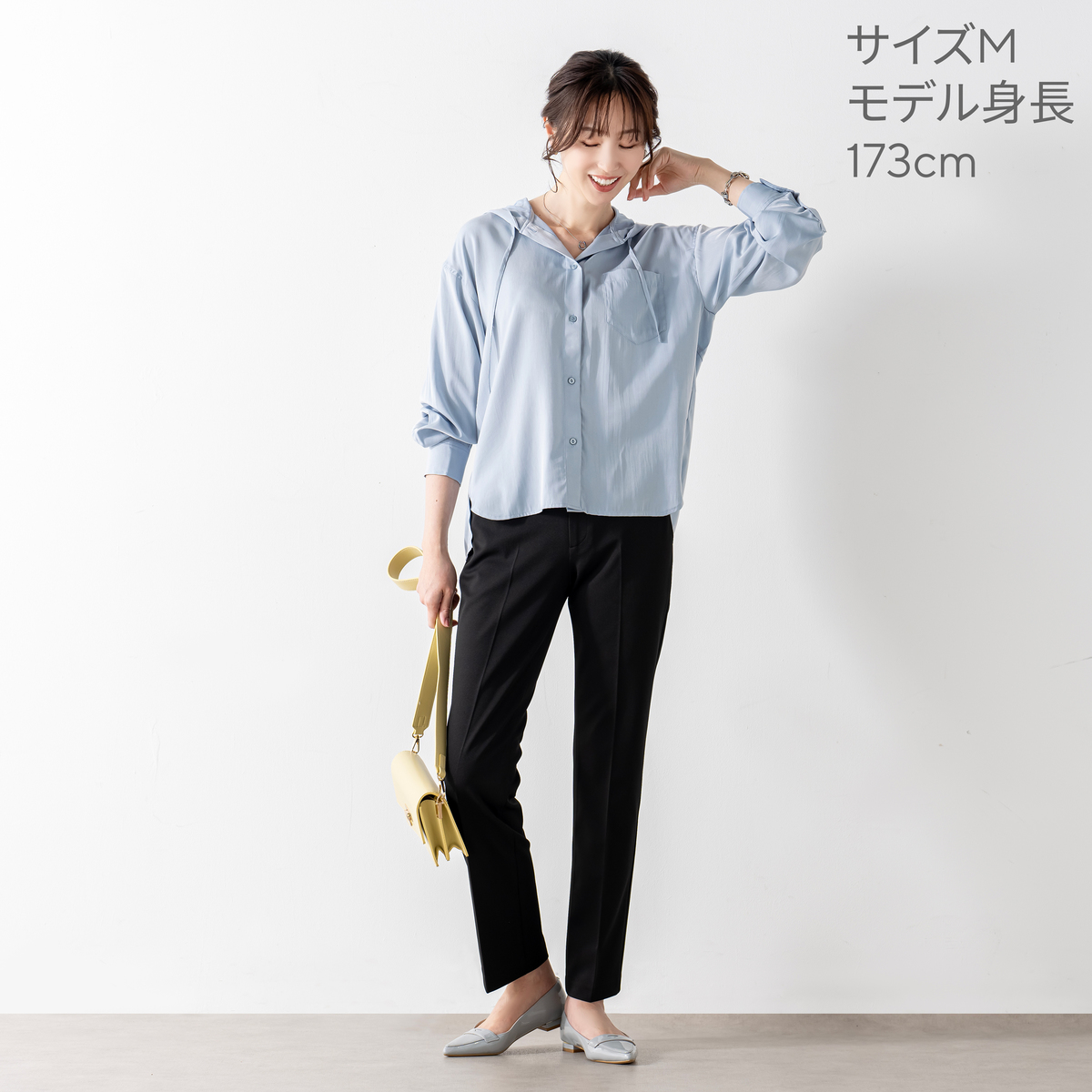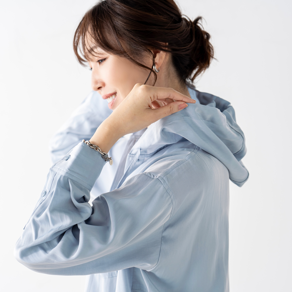 レーヨン混のとろみ素材を使った、軽やかな着心地のフードシャツです。滑らかな風合いと繊細な綾目が生む控えめな光沢で、カジュアルになりすぎず洗練された印象に。フードは首元に柔らかく馴染み、自然な抜け感を演出します