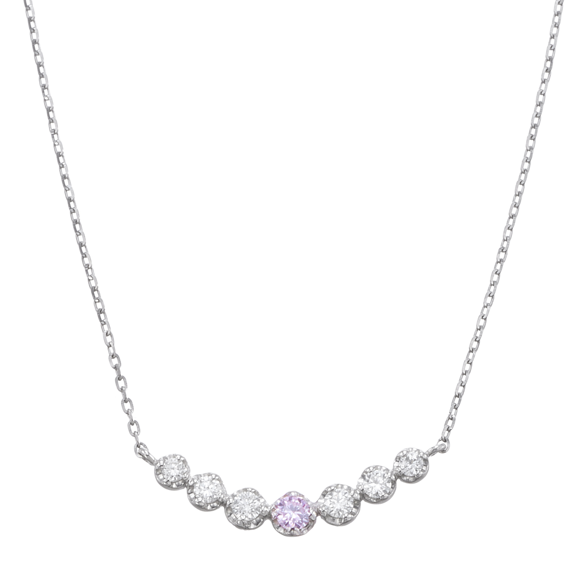 センターにピンクダイヤを1石、サイドに3石ずつダイヤモンドを配し、デコルテに添うようにデザインしたペンダントです