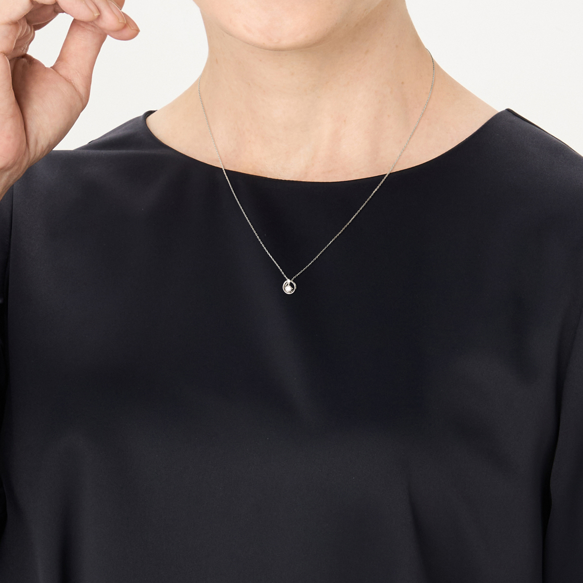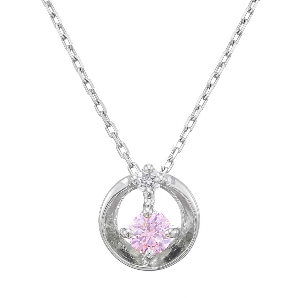 丸いモチーフのセンターに、0.06ctUPのピンクダイヤモンドをセット。ダイヤモンドもセッティングした、可愛らしいデザインのペンダントです
