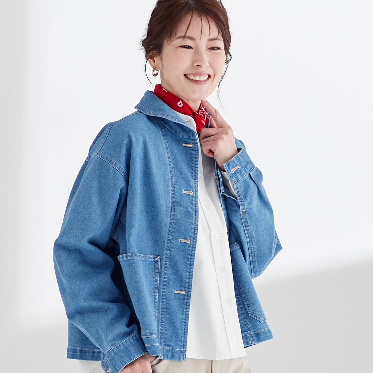 上品さをまとえるショールカラージャケット。丸みのある襟元が顔まわりを柔らかく見せ、コンパクトなショート丈でワイドパンツやスカートとの組合せもしやすいデザインです。配色ステッチをやや濃いトーンで効かせ、カジュアルな装いにも立体感を添えました。レイヤードにも取り入れやすい一着です
