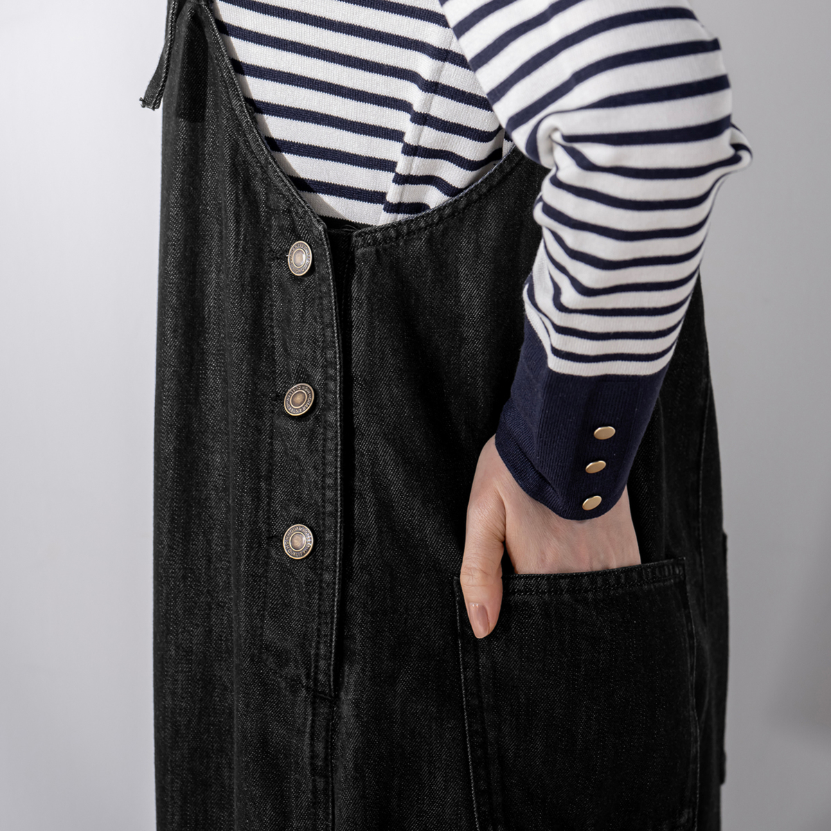 落ち感のある柔らかなデニムを使用したオーバーオール。太めのスラブを含んだ本格的な素材感と、バイオウォッシュによる自然な表情が特徴です。ほどよい厚みで長い季節着用でき、毛玉になりにくい点も魅力。肩紐は調整可能で、すっきりとした印象を意識しました