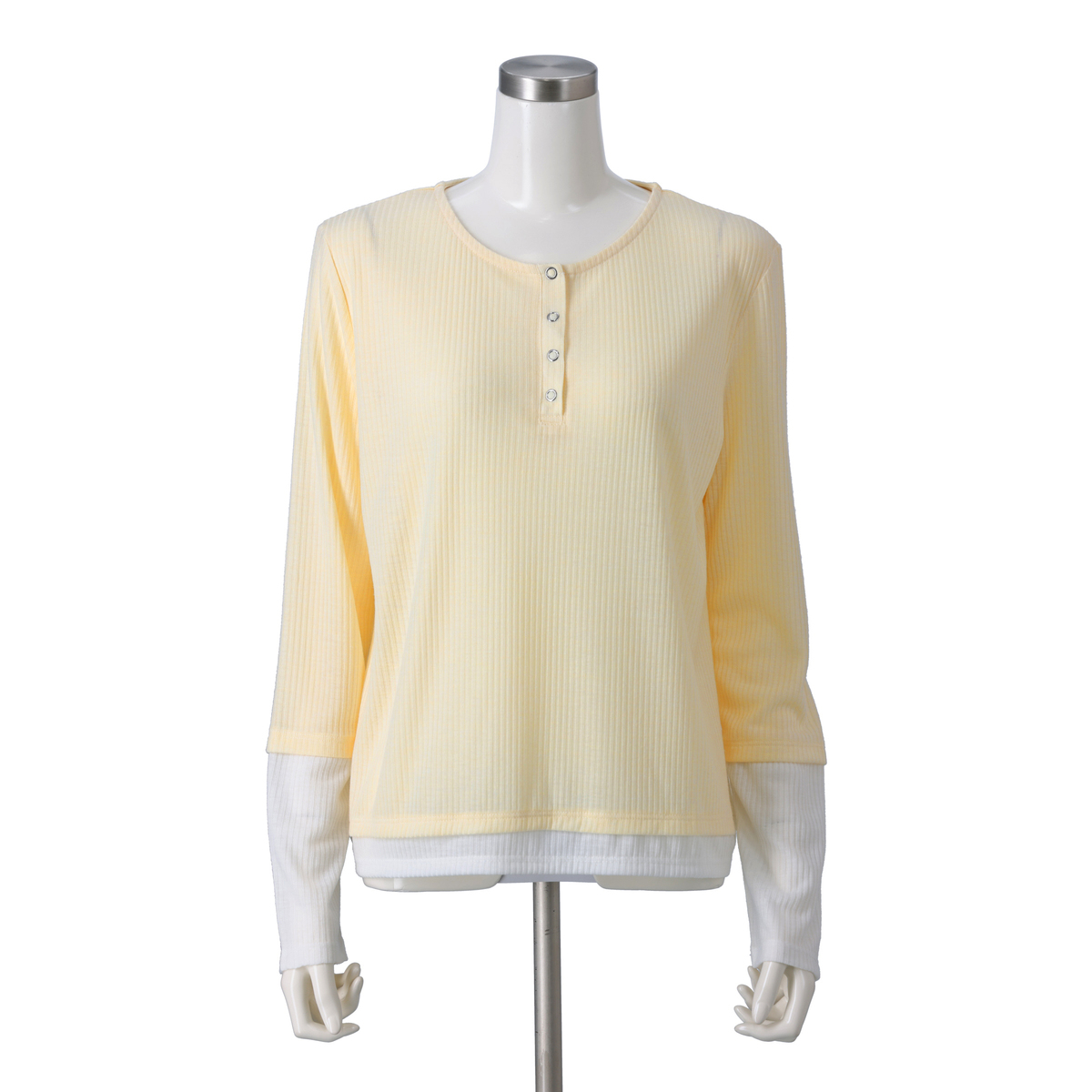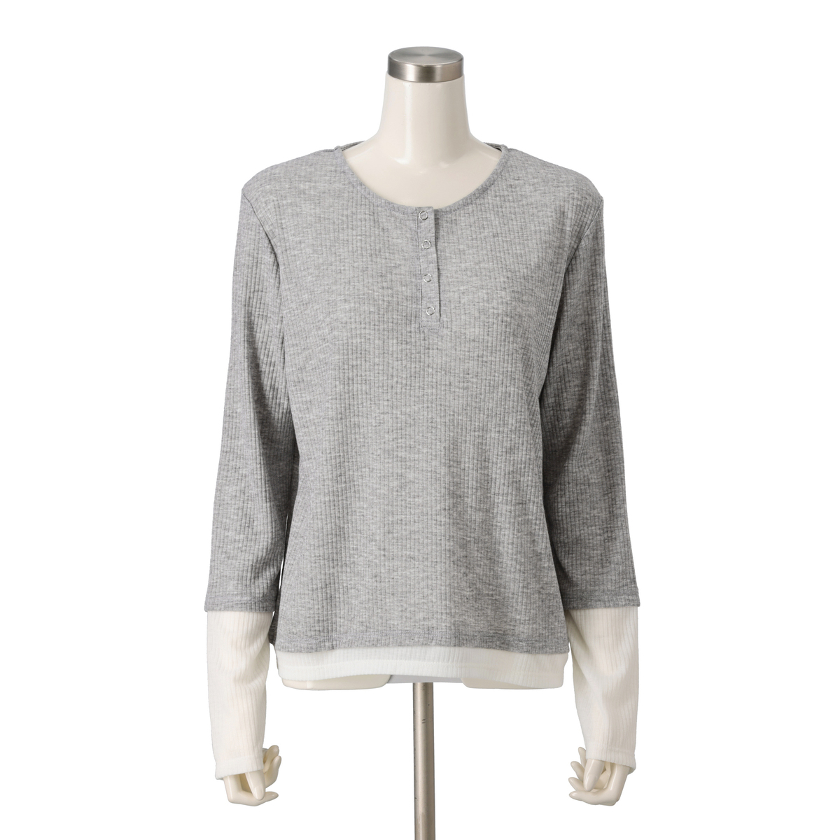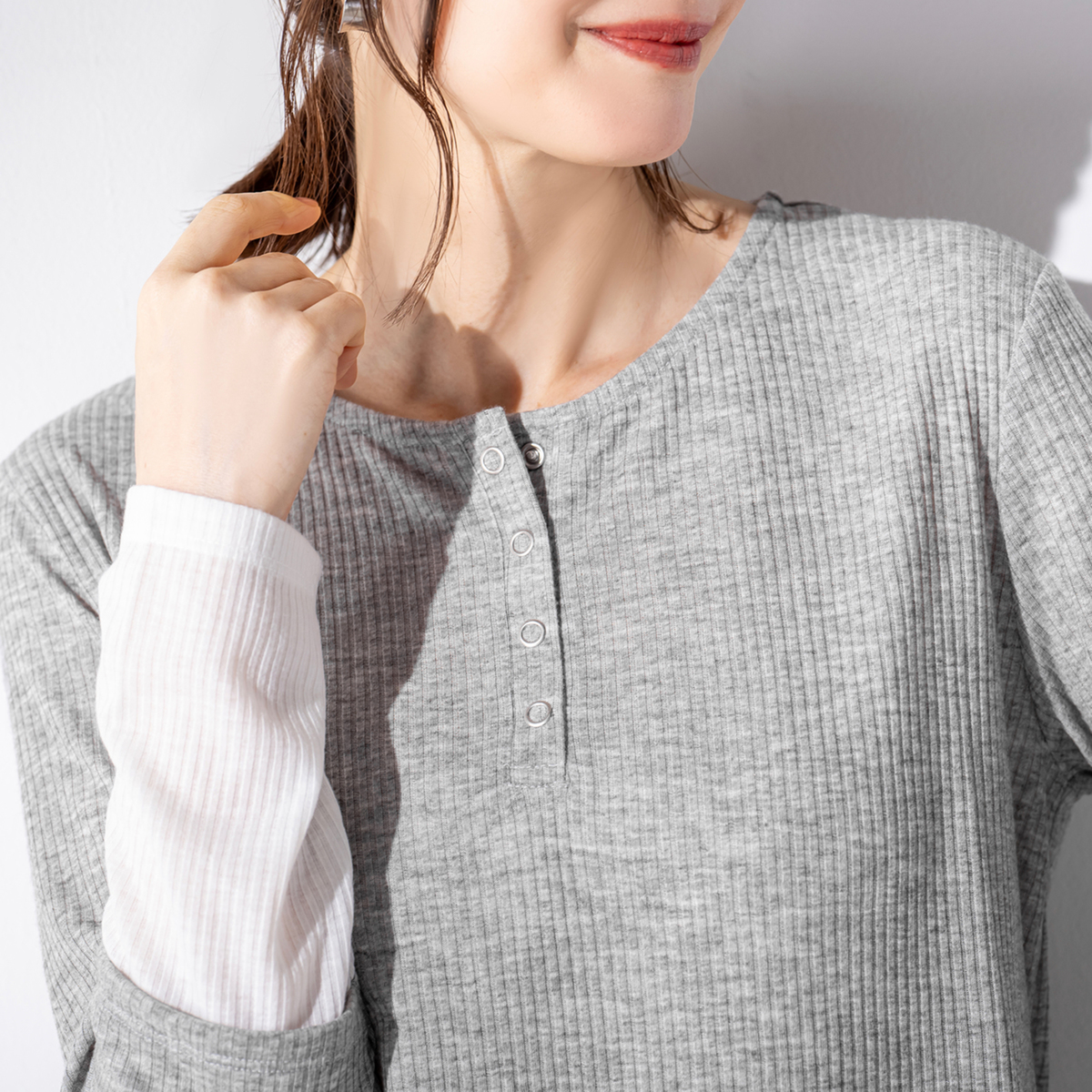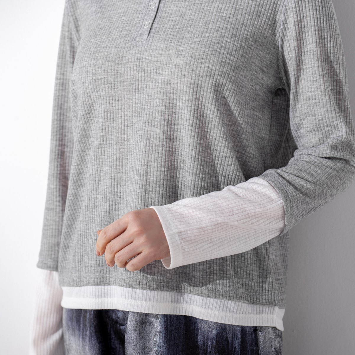 なめらかなリブ素材を使用したプルオーバー。程よいシアー感とフィット感で、すっきりとした着こなしを演出します。袖口と裾のバイカラー切替がアクセントになり、ヘンリーネックにはシルバーカラーのスナップボタンを採用。留め方次第で印象を変えられます