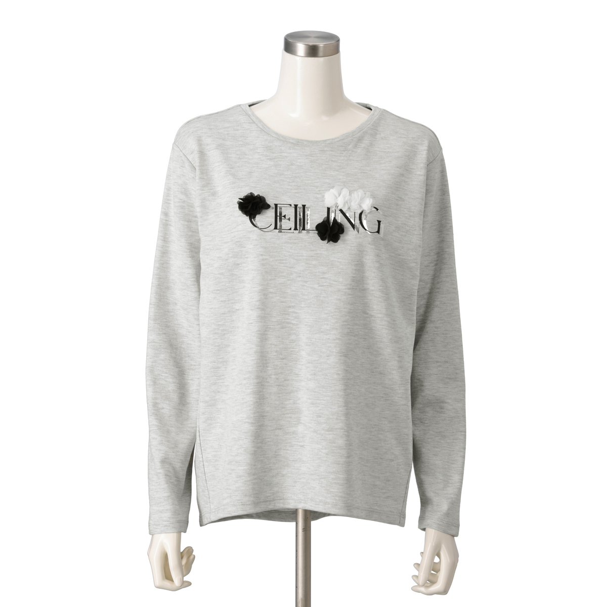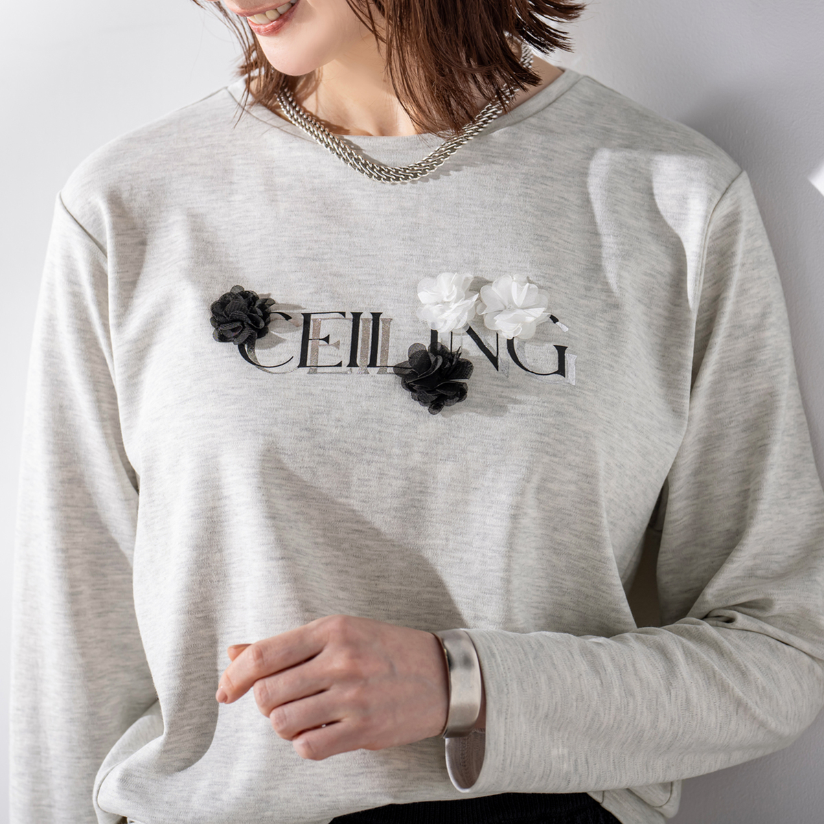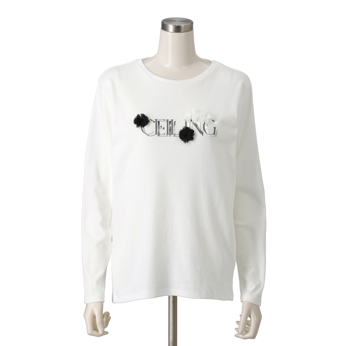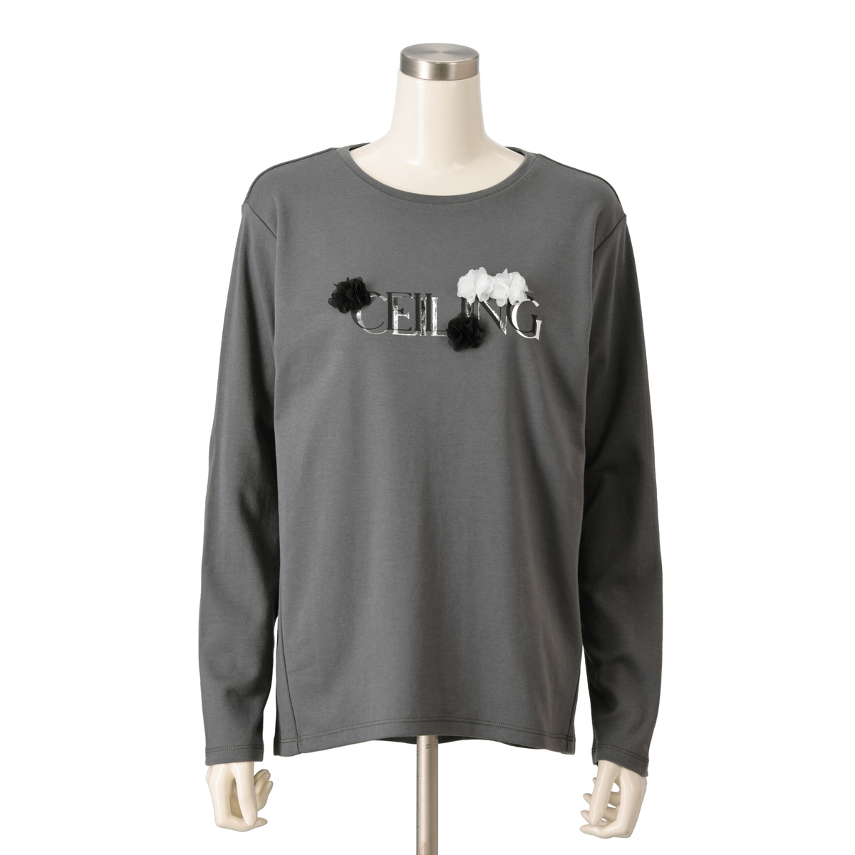 立体的なフラワーモチーフ刺繍と、こだわりの箔ロゴプリントが目を引くTシャツです。前後差のあるラウンドヘムが腰まわりを自然にカバーし、前振りの脇切り替えがすっきりとした印象をプラス。ゆとりのあるシルエットで1枚でもインナーでも活躍します