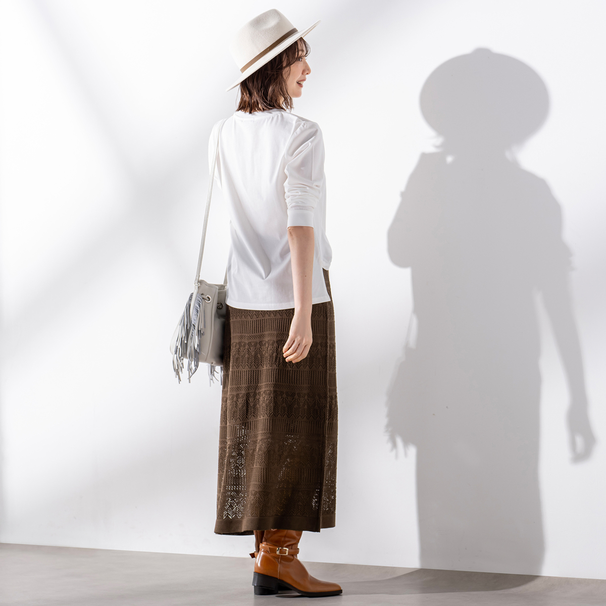 光沢のある糸で編み立てたレース編みのナロースカート。ティアードのような段差が奥行きを生み、細かな編み柄の透け感が特徴です。重ねる色を変えることで印象の違いを楽しめ、コーディネートの幅が広がります
