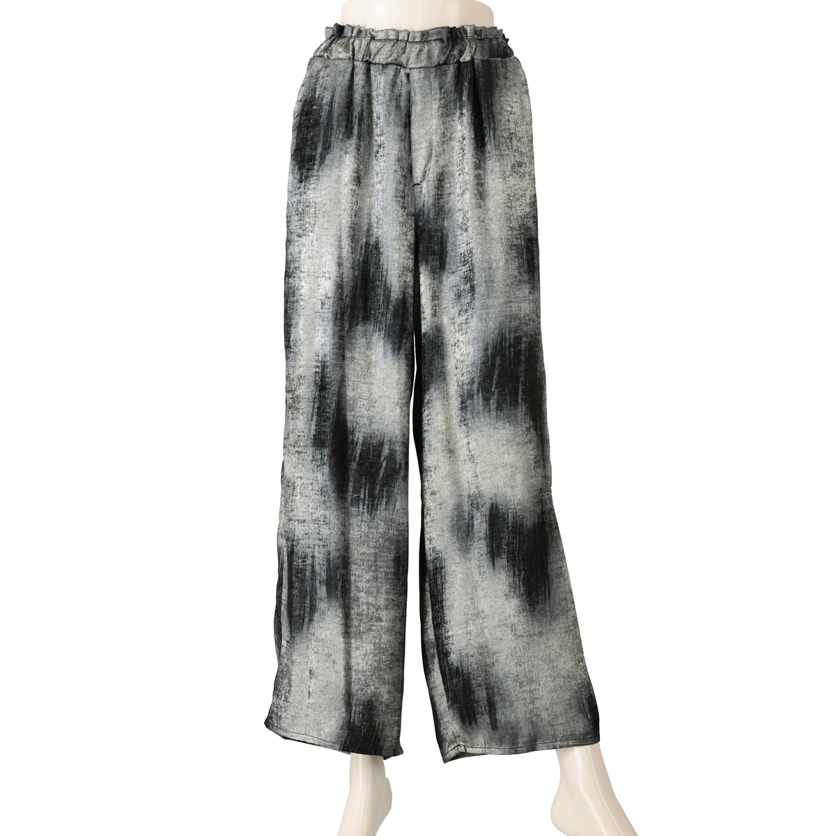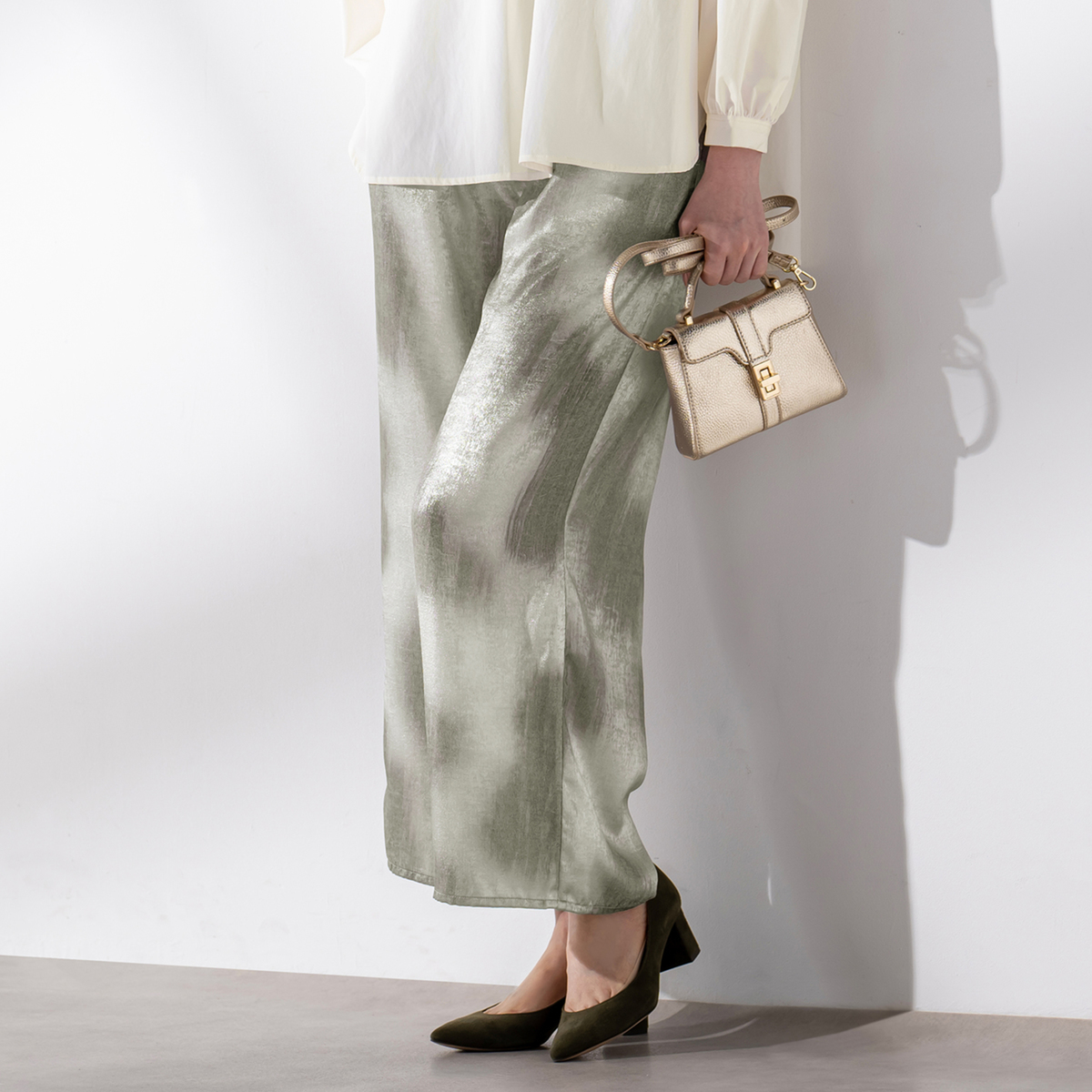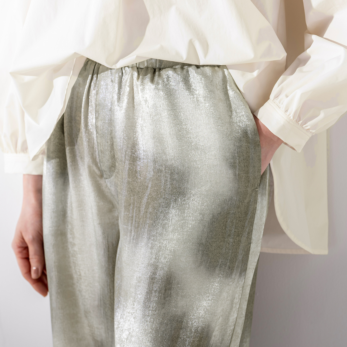 てろっとした光沢が特徴のソフトなパンツ。さらっとしたサテン素材に、マーブル柄の箔プリントを施し、程よく存在感のある仕上がりです。ウエストは総ゴム仕様でリラックスした穿き心地。チュニックやワンピースと組合せて裾から見せる着こなしもおすすめで、毛玉になりにくいのも日常使いに嬉しいポイントです