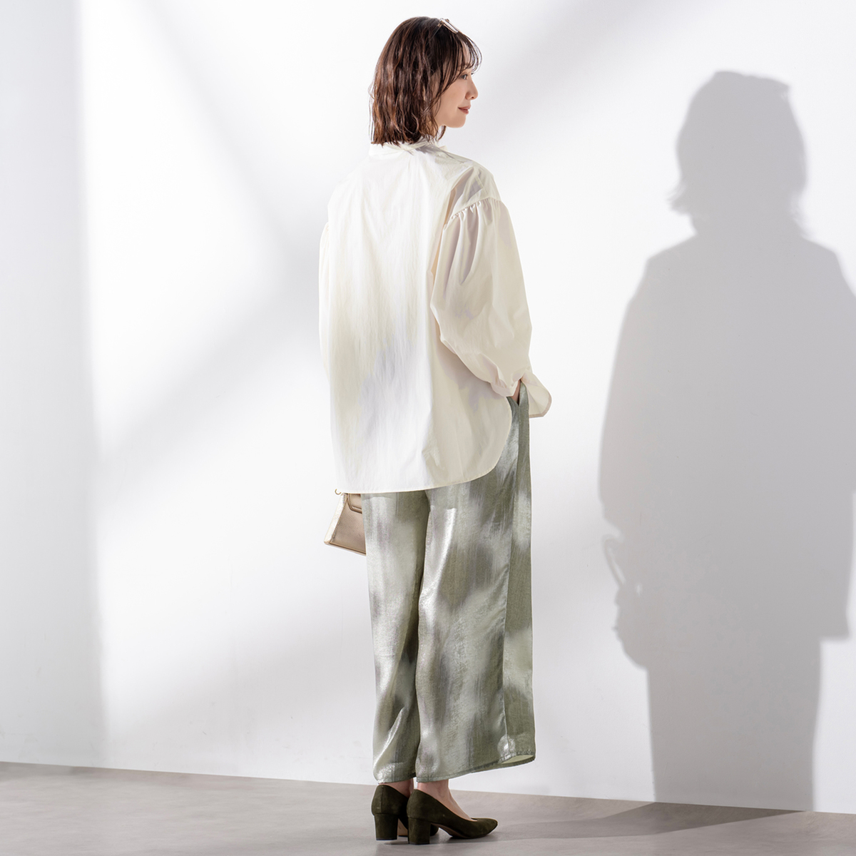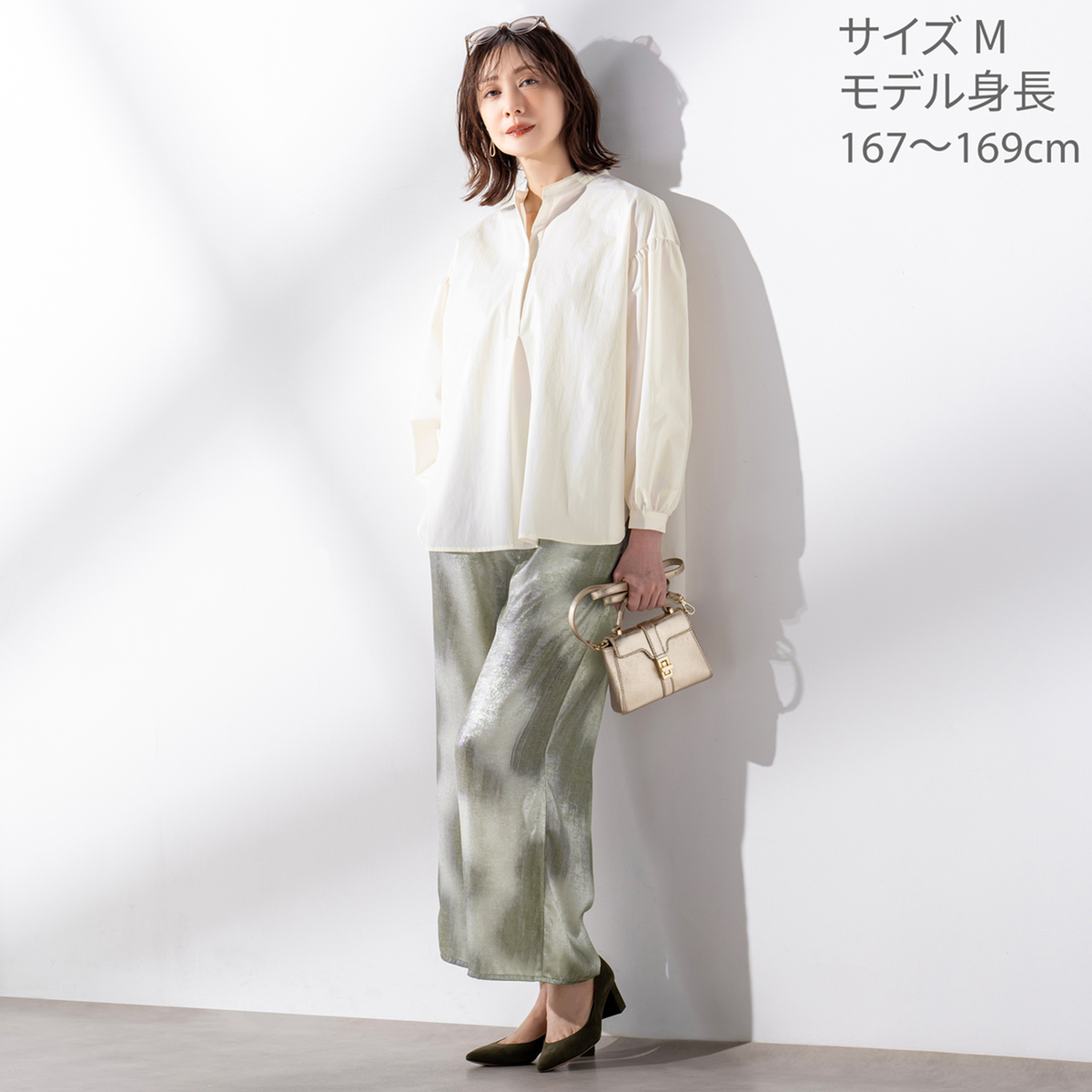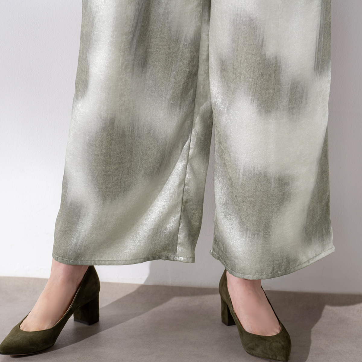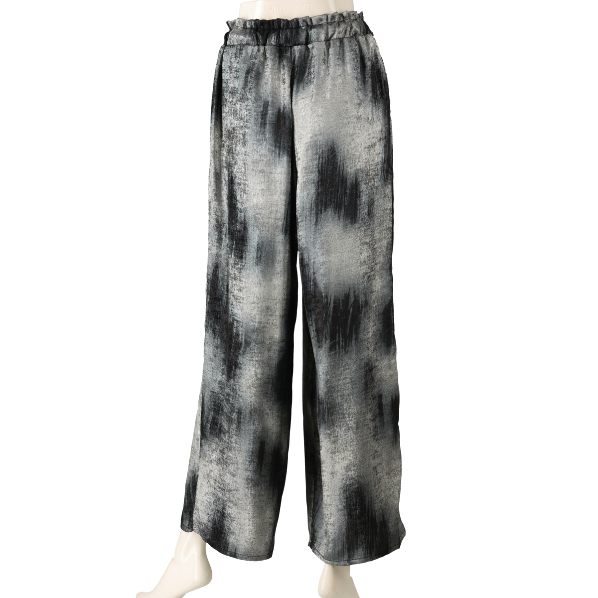 てろっとした光沢が特徴のソフトなパンツ。さらっとしたサテン素材に、マーブル柄の箔プリントを施し、程よく存在感のある仕上がりです。ウエストは総ゴム仕様でリラックスした穿き心地。チュニックやワンピースと組合せて裾から見せる着こなしもおすすめで、毛玉になりにくいのも日常使いに嬉しいポイントです
