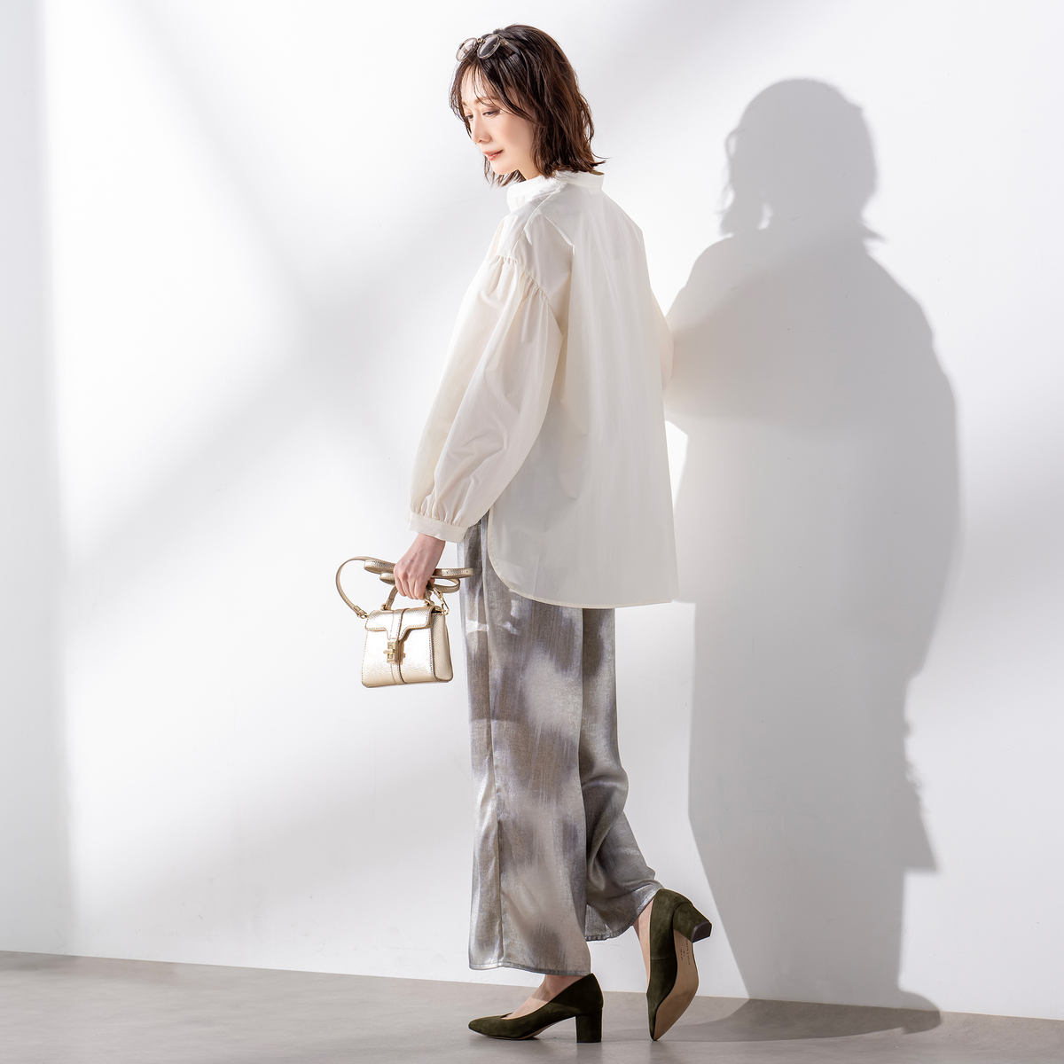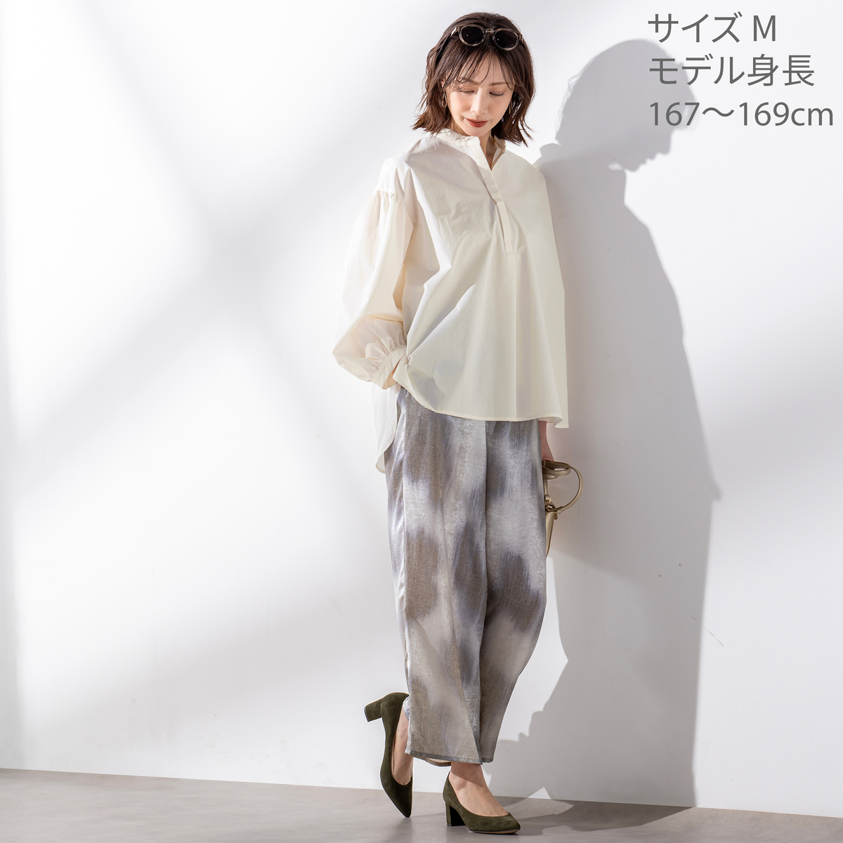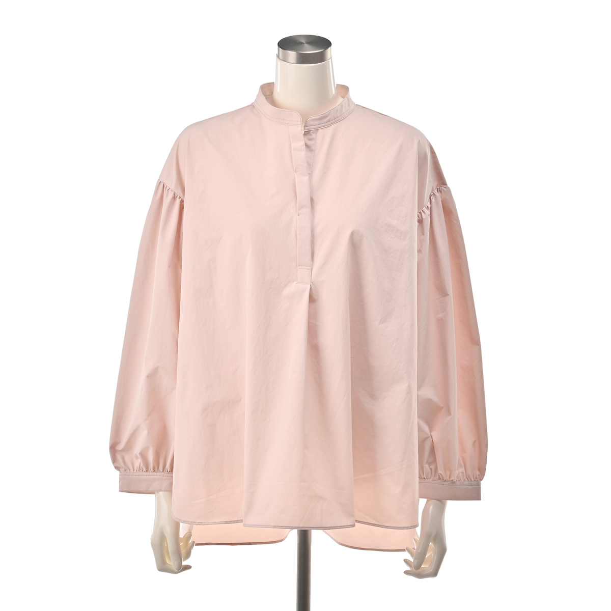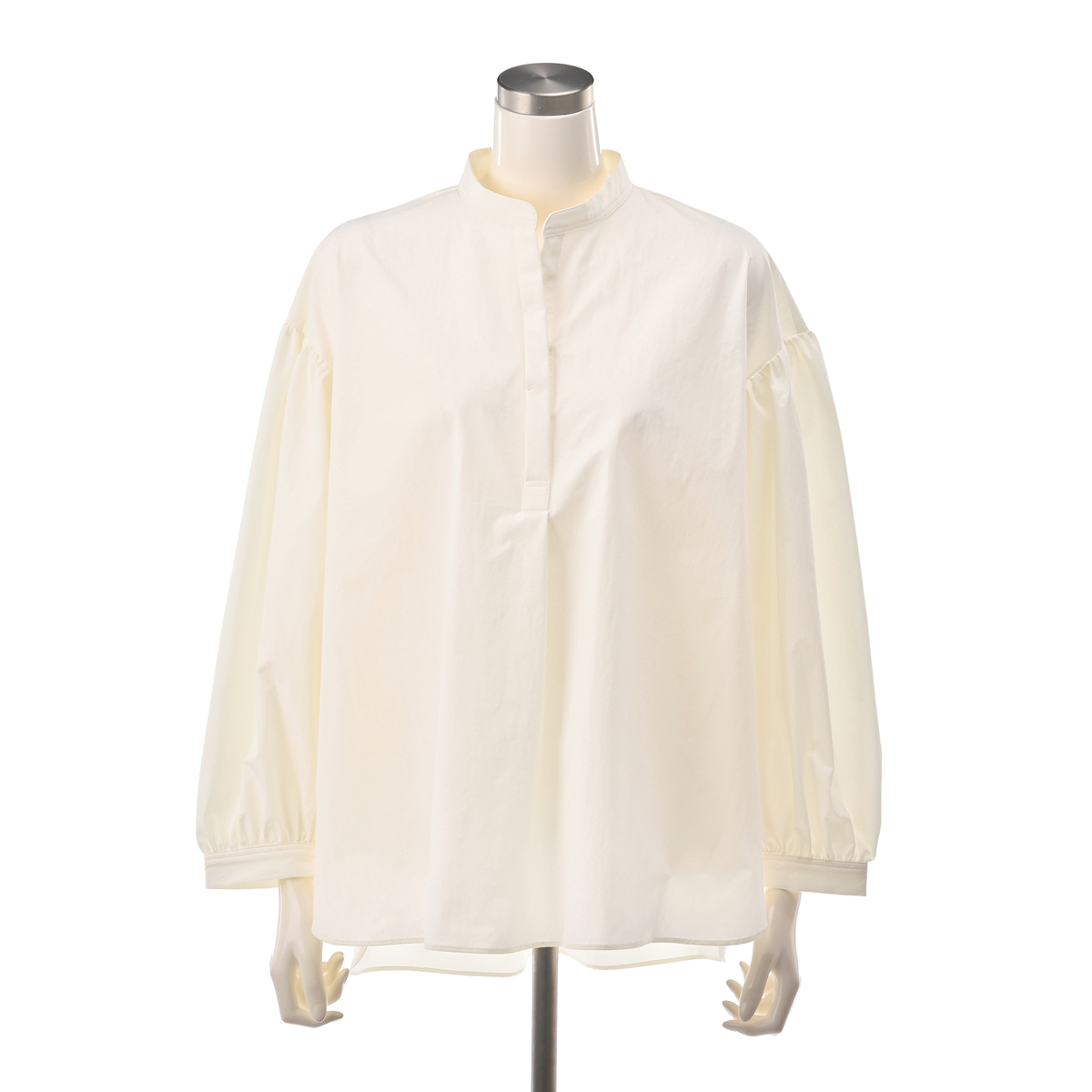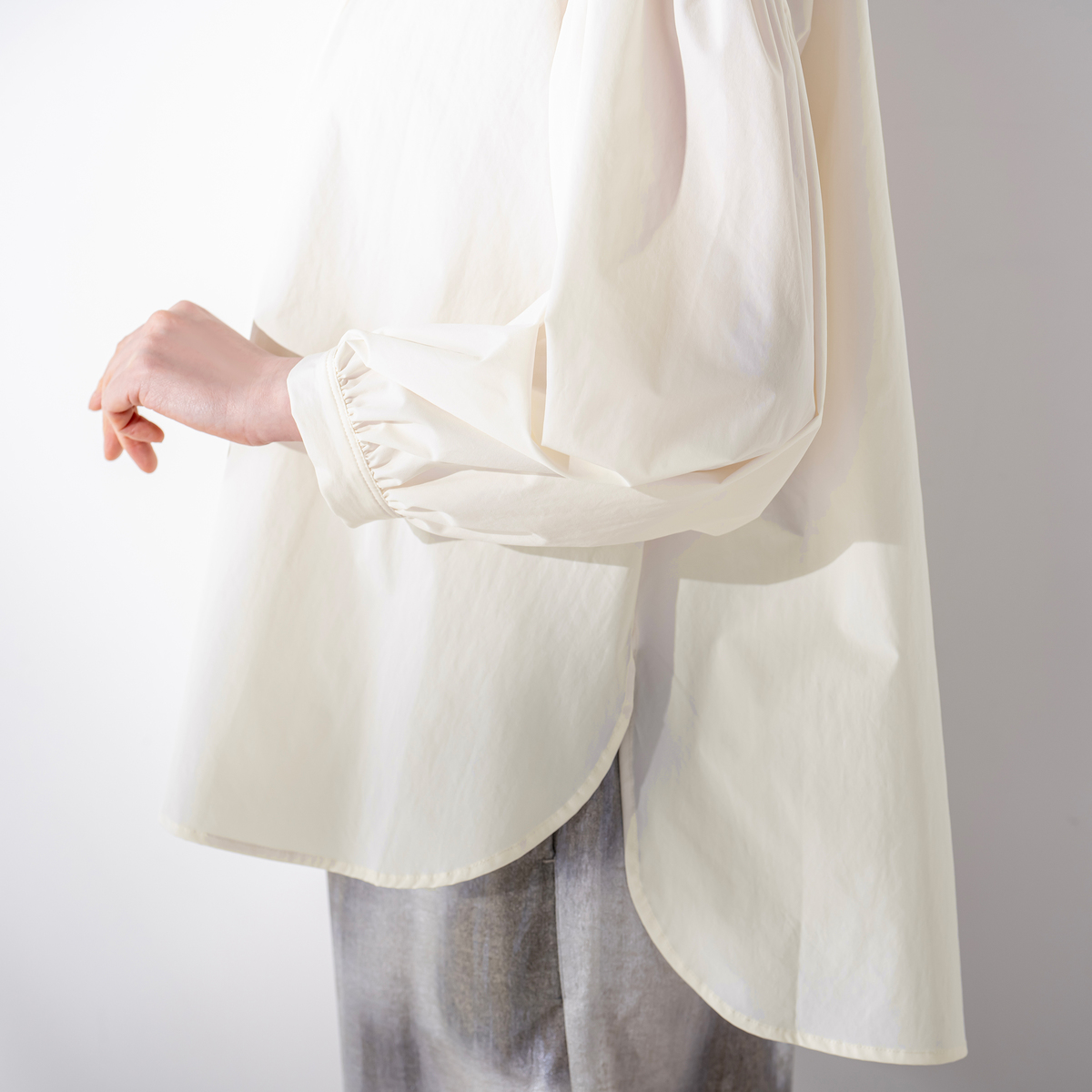 ハリ感のある素材を使ったブラウス。たっぷりとした袖の立体感がトレンド感を演出しつつ、全体はゆったりとしたシルエットで仕上げています。インナーとの組合せ次第で、ロングシーズン活躍します