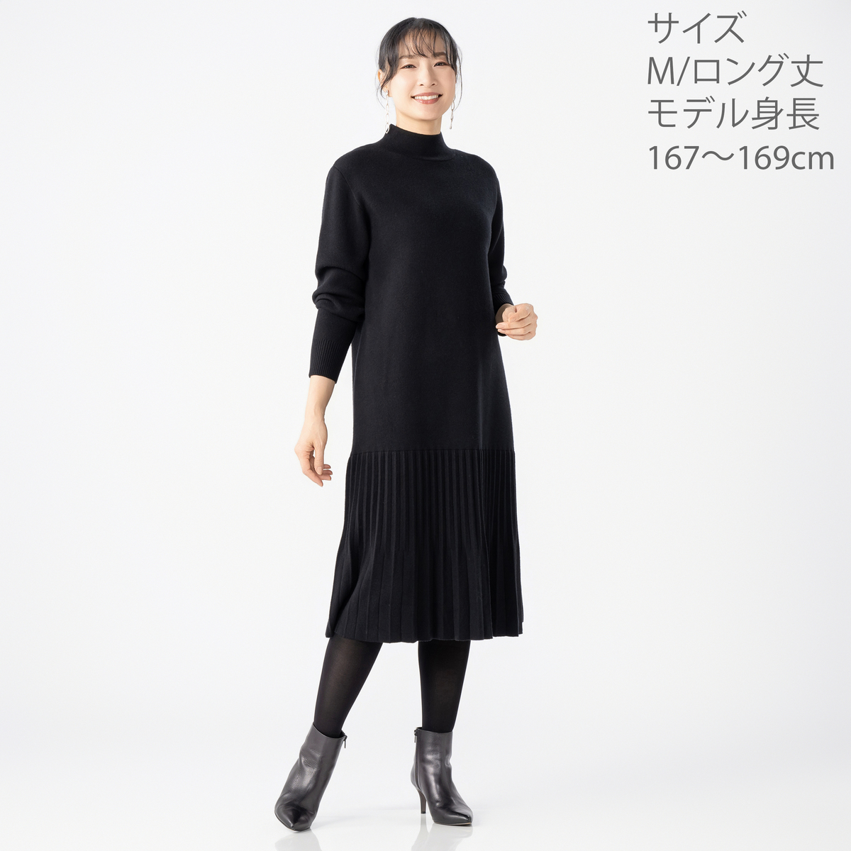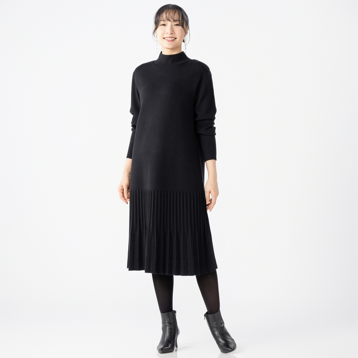 裾プリーツデザインのニットワンピース。レーヨン・ポリエステル・ナイロンをブレンドし、暖かさと軽やかさを両立しました。伸縮性があり、長時間の着用も快適。シンプルな身頃に対し、裾の編地切替プリーツ風デザインが歩くたびに揺れ、大人の華やかさを演出。1枚で洗練された着こなしが完成します