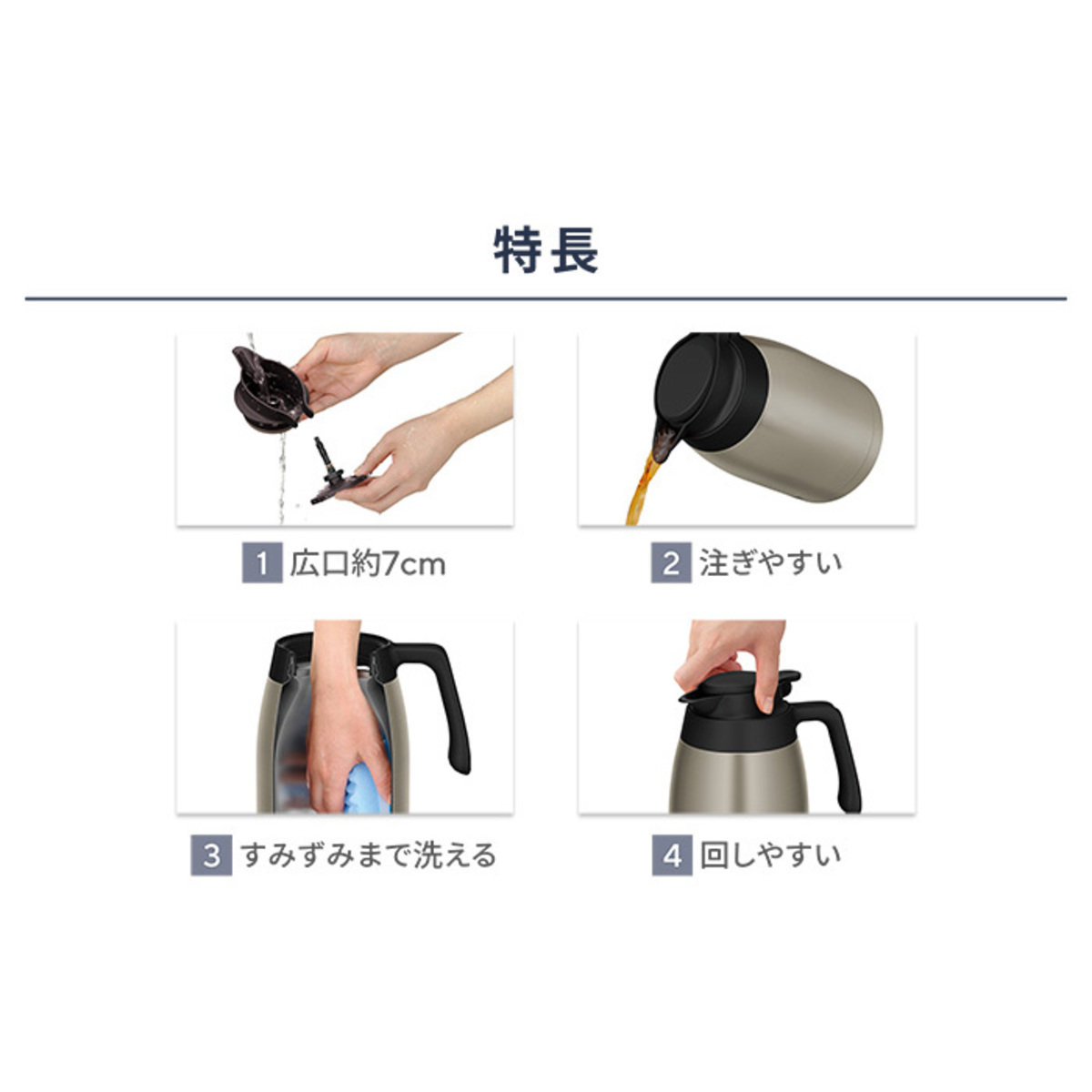 ステンレス製の真空魔法瓶で割れにくい卓上ポットです。中せんはつまみ部が大きくてしっかりと回せ、押すだけで注げるワンタッチレバーで片手でもラクラク。注ぎ口は少し丸めることで、水分などをたれにくくしました