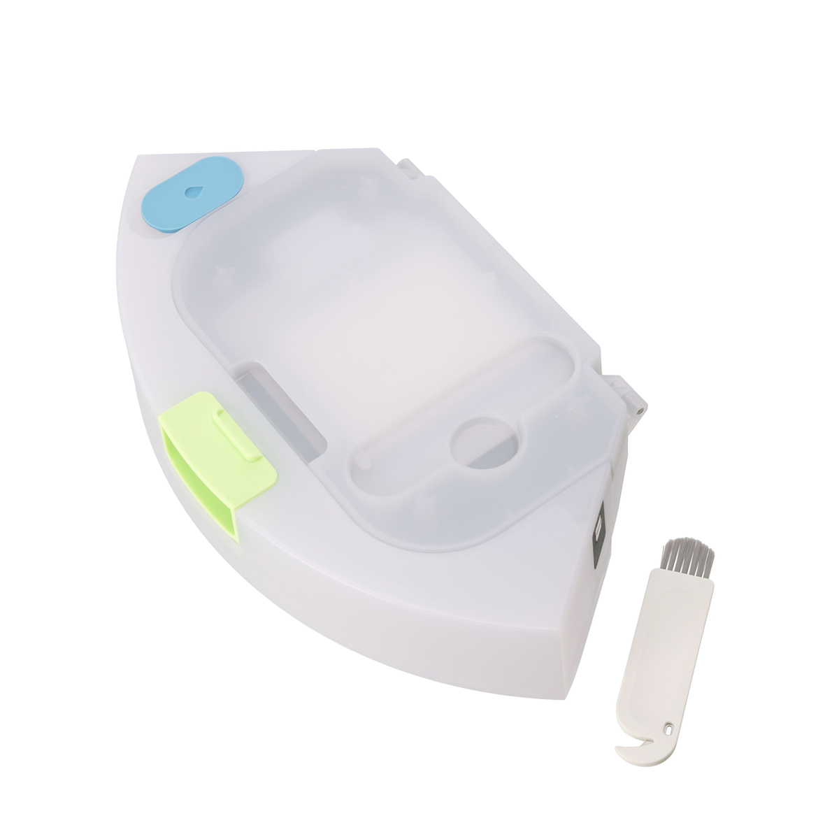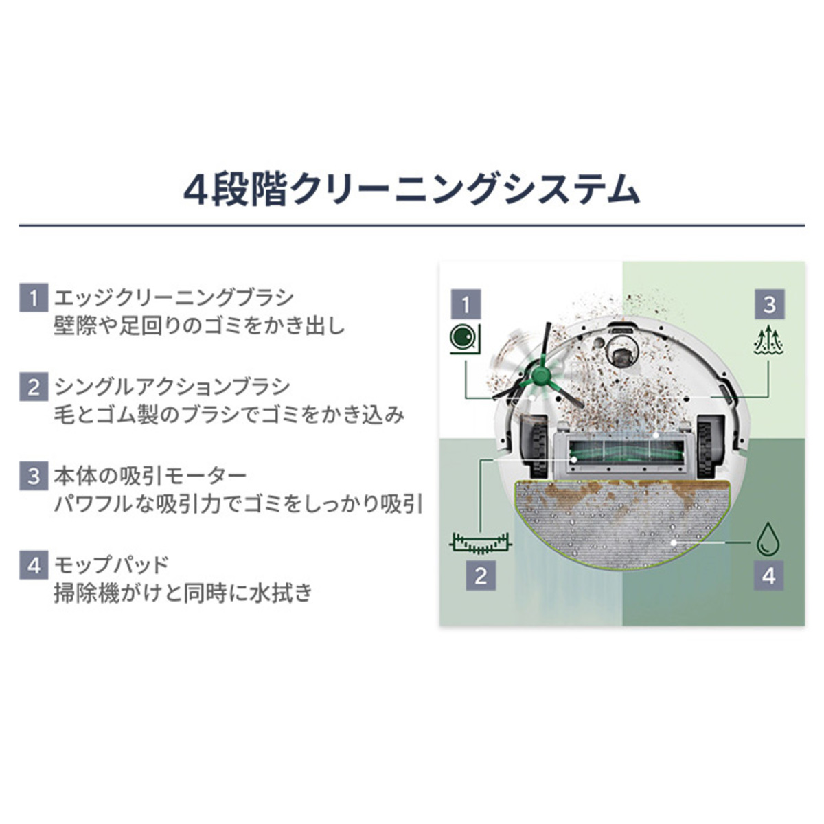エッジクリーニングブラシでごみをかき出し、シングルアクションブラシでごみを掻き込みながら、本体の吸引モーターでしっかり吸引、モップパッドで拭き掃除を行う4段階のクリーニングシステムを搭載しました