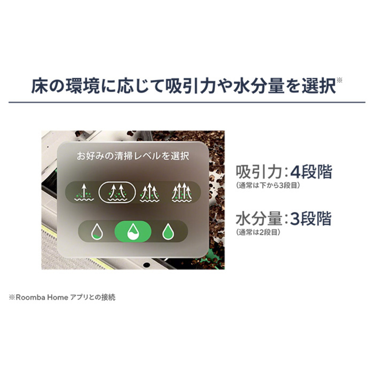 [商品内容] ・ロボット本体 ・バッテリー(内蔵) ・パッドプレート ・マイクロファイバーモップパッド ・充電ステーション ・電源アダプター [サイズ] 本体:奥行33.6×幅33.5×高さ10.4cm 充電ステーション:奥行7.4×幅13.6×高さ12.1cm [重量(約)] 本体:2840g 充電ステーション:490g [コード長さ] 2m [充電時間] 約4時間 [使用方法] ※取扱説明書は同梱しておりません。同梱の「Sefety Guide(安全上のご注意)」の1ページ目に記載されているQRコードを読み取っていただき閲覧をお願い致します はじめに 保護フィルムやクッション材を取り外す 充電ステーションを硬質な床面に設置する 充電ステーションを接続する エッジクリーニングブラシを取り付ける ロボットを起動する Roomba Homeアプリをダウンロードする [注意事項] ※取扱説明書は同梱しておりません。同梱の「Sefety Guide(安全上のご注意)」の1ページ目に記載されているQRコードを読み取っていただき閲覧をお願い致します ※ロボットをご使用になる前に、安全上のご注意をお読みください ※ロボットが落下する危険を防ぐため、充電ステーションは階段から1.5メートル以上離れたところに設置してください ※2.4GHz帯のWi-Fiを使用する必要があります ※水拭き機能について: 温水、対応していない洗剤、消毒剤などの液体はロボットの故障の原因となる恐れがあるので使用しないでください。当社のサポートサイト(global.irobot.com)に示されているように、冷水またはiRobot承認済みの洗剤のみを使用してください。掃除機がけと拭き掃除が完了したら、必ず水タンクを空にして、モップパッドを交換してください ※本商品(ロボット及び充電ステーション)の全機能をご利用いただくためには、iRobot専用アプリのご使用と、WiーFi接続による本商品のバージョンアップが必要となります。アプリの最新の端末や要件はApp StoreまたはGoogle Playからご確認ください。セットアップと操作には、2.4GHz帯のネットワークが必要です。セットアップ完了後、ロボットは清掃のために2.4GHz帯に接続したままにしてください ■取り扱い説明を十分にご確認の上、ご使用下さい 【中国製】