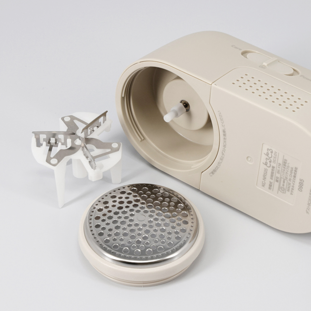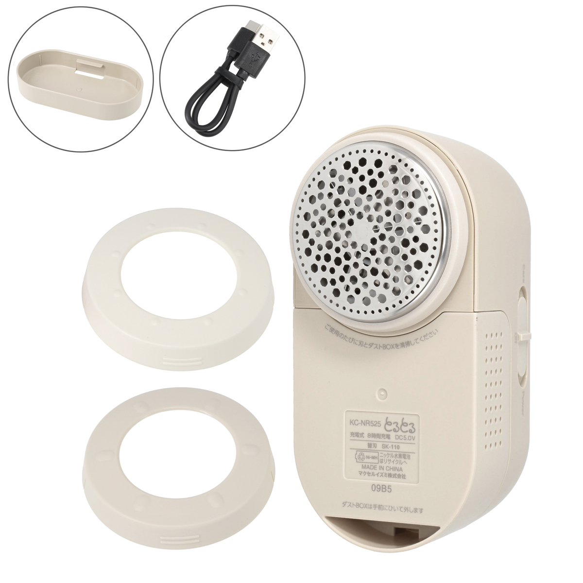 [商品内容] ・本体 ・ふわふわリング Short ・ふわふわリング Long ・充電用USBケーブル(TypeーA to C) ・スタンド ※ACアダプターは付属しておりません [サイズ] 幅6.1×奥行6.8×高さ12.3cm ※スタンドは除く [重量] 約180g(外刃・内刃セット、ふわふわリング装着時、スタンドは除く) [充電時間] 8時間充電で衣類1枚4分として約38分使用可能 [使用方法] 【充電方法】 1.スイッチをOffにする 2.USB Type-Cコネクタを本体にしっかりと差し込む3.USB Type-Aコネクタを本体にしっかりと差し込む 4.USB Type-A コネクタを市販のACアダプターに差し込む 5.コンセントにACアダプターを差し込む 6.充電完了後、コンセントからACアダプターを抜き、USB Type-Cコネクタを本体から抜く 【使用前に】 外刃と内刃は正しく取り付ける 【毛玉の取り方】 1.刃部に破れや変形がないか確認する 2.平らなところにおいて毛玉を取る場合:セーターや洋服、毛布など、毛玉を撮りたい部分を平らなところにおき、しわをのばす 服を着たままで毛玉を取る場合:セーター、洋服など、毛玉を取りたい部分のしわをのばす ◆平らなところでの毛玉取り スイッチモード:CareまたはPower ふわふわリング:使用する または使用しない ◆着衣状態での毛玉取り スイッチモード:Care ふわふわリング:必ず使用する 3.ふわふわリングを選ぶ ふわふわリングを使用しない場合ははずす 【調節目安】 Long:毛足の長い生地、極太の毛糸のセーターなどShort:毛足が中程度から短い生地、並太の毛糸のセーターなど ふわふわリングなし:ジャージ、トレーナーなど 【ふわふわリングの着脱方法】 取り付け方:ふわふわリングをカチっというまではめこむ 取り外し方:両手を指かけに指をかけて、ふわふわリングを引っ張る 4.用途に応じてスイッチをCareまたはPowerにするCare:おしゃれ着等の繊細な衣類の毛玉を風合いを残しながら取るとき、また着衣状態で毛玉を取る時に適する 5.刃部を強く押し付けずに、浮かせ気味にゆっくりと毛玉を取る 【着衣時の使い方】 着衣状態で使用する際は必ずしわを伸ばして、軽い力で毛玉をとる 6.使用後、スイッチをoffにする ■取り扱い説明を充分にご確認の上、ご使用下さい 【中国製】 [注意事項] ※生地に刃を強く押しつけたり、何度も反復しない ※モヘヤ・アンゴラなどの毛足の強い製品に使用しない ※生地にしわがある状態で使用しない ※からまった繊維が小さく、玉状になっていないものを取らない ※靴下等の伸縮性の高いもの及びレース、刺?部分に使用しない ※縫い合わせ部分や編み込みの部分など生地が凹凸になっている部分に使用しない ※高額・貴重な衣類に使用しない ※分解・修理・改造をしない ※本体を水につけたり、水をかけたり、水洗いしない ※お手入れの際はUSBケーブル・ACアダプターをコンセントから抜く ※濡れた手で抜き差ししない ※充電用USBケーブルが傷んでいるときは使用しない ※充電用USBケーブルを傷つけたり、無理に曲げたり、引っ張ったり、ねじったり、束ねたり、重い物を乗せたり、挟み込んだり、加工したり、本体に巻き付けた状態で保管しない ※ご使用の前に刃の破れや変形がないか確認し、異常がある場合は使用しない ※ダストBOXをはずした状態でスイッチをCareまたはPowerにしない ※内刃の刃先は鋭いので取扱いに注意する ※外刃をはずす時や取り付ける時は必ずスイッチをOffにする ※外刃は薄いので表面を強く押したり、固い物にぶつけないようにする ※コネクタにビンやゴミ等を付着させない ※毛玉取り以外の用途に使用したり、業務用として使用しない ※落としたり、ぶつけたりしない ※外刃と内刃セットは正しく取り付ける ※子供の手の届くところに置かない ※他の商品のUSBケーブルは取付できない場合があります ※本体の汚れは水で薄めた中性洗剤を布に含ませ、固く絞ってから拭き取る ※シンナーやベンジン等を使用するとプラスチック部分を傷めるとともに火災や関電のおそれがあるためおやめください ※周辺温度が5℃以下または35℃以上の場所、直射日光が当たる場所、暖房器具や白熱灯などの発熱体の近くでは充電しない ※充電時間が短くなるとともに火災や感電、本体の変形などが起こる場合があります ※充電中の外出はおやめください