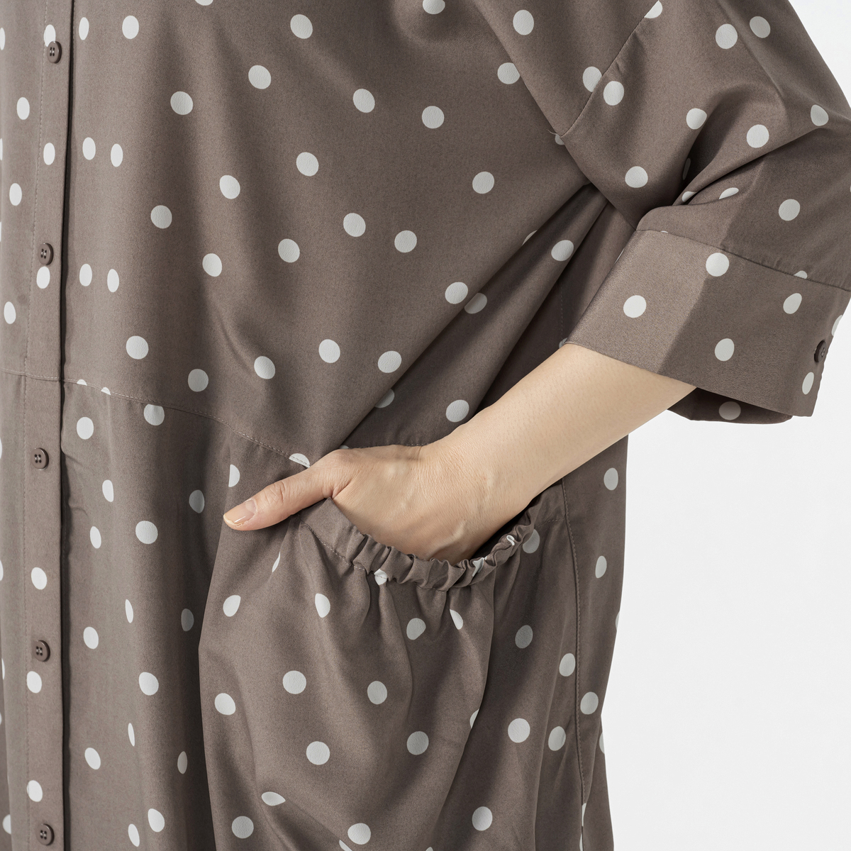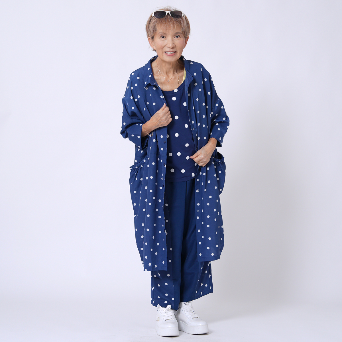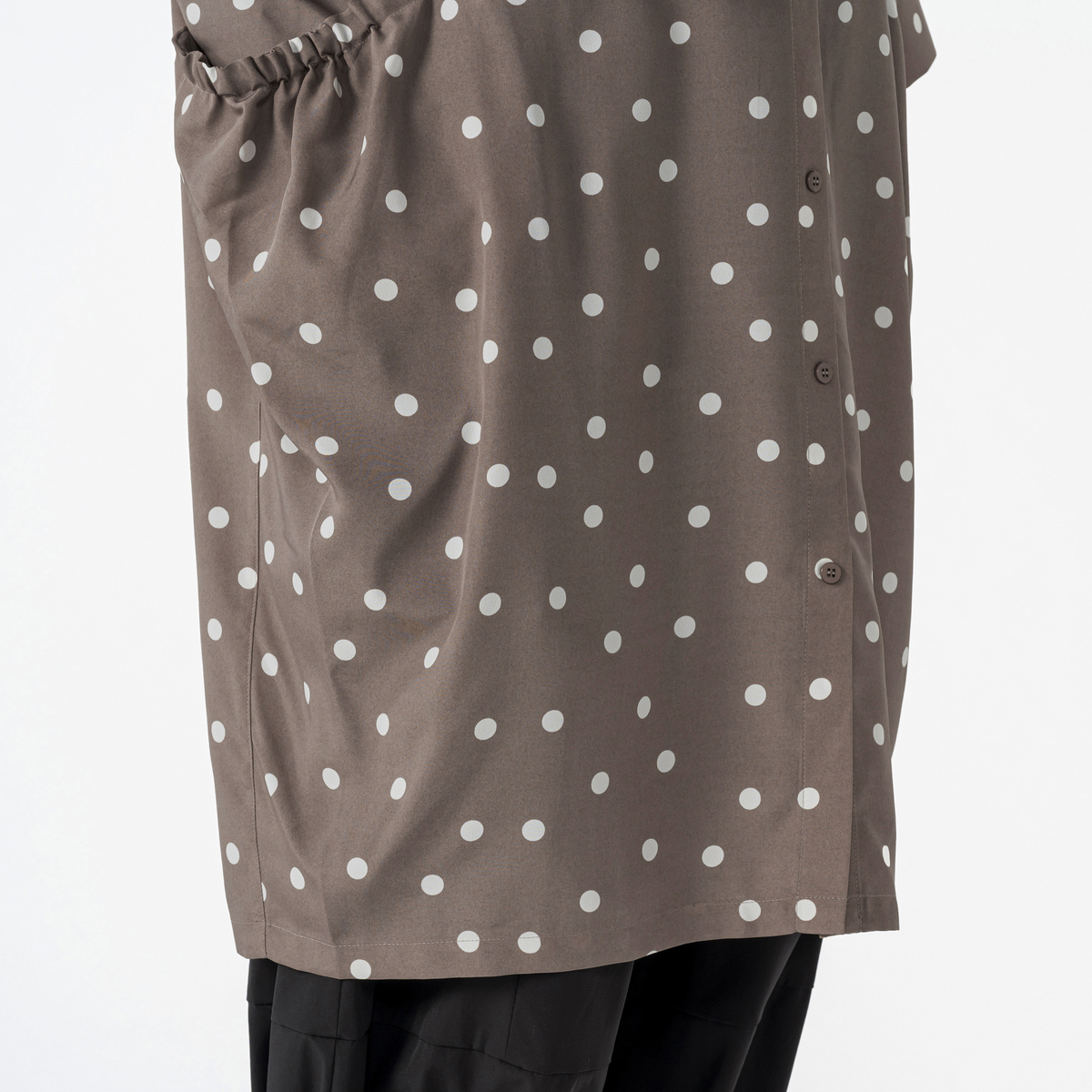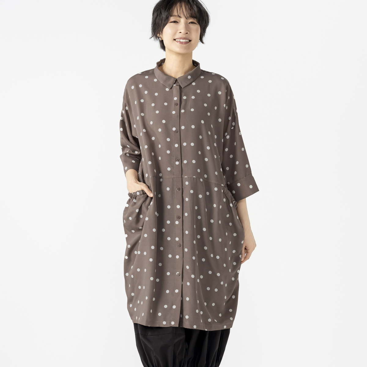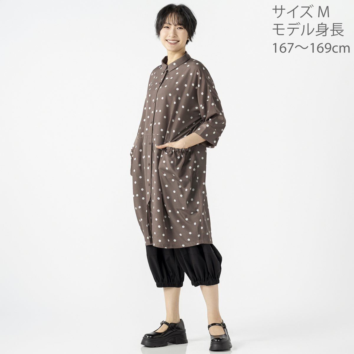 [商品寸法(ヌード)cm] サイズ バスト 着丈 S : 134(74〜82) 94.5 M : 140(81〜89) 96.5 L : 146(88〜96) 97.5 LL : 152(95〜103) 98.5 3L : 160(102〜110) 99.5 サイズ 裄丈 S : 60 M : 61.5 L : 63 LL : 64.5 3L : 66 [素材] ポリエステル100% [仕様] ボタン・ホック:有 ファスナー:無 ポケット:有(両脇) スリット:無 [お手入れ] 洗濯機洗い可 [注意事項] ※商品寸法の誤差は多少発生します。ご了承下さい ※洗濯後はすぐに脱水し、形を整えて干して下さい。長時間、水につけたままにしないで下さい ※濃色製品は着用中の摩擦により色移りすることがあります。また、雨や汗等で濡れた状態で着用すると色移りすることがあります。その際はお早めに洗濯をして下さい ※洗濯・クリーニングの際、色落ちすることがありますので他の物と分けて洗って下さい ※デリケートな素材を使用していますので、爪やアクセサリーなどの引っ掛かりによりキズがつきやすくなっております。縫目や生地を強く引っ張らないよう注意して下さい ※過度な引っ張りを受けると縫い目が開くことがありますので、取扱いには注意して下さい <ブラウス(ブラックドット・ネイビードット・ローズグレードット)> ※この製品は生地の表面にプリントを施しています。生地の構造上、細かなひきつれが見られる場合がありますが、製品の特徴としてご理解下さい ※強い力が加わると細かなひきつれや、糸返りによる筋が発生します。摩擦や引っ掛かりにご注意下さい 【中国製】