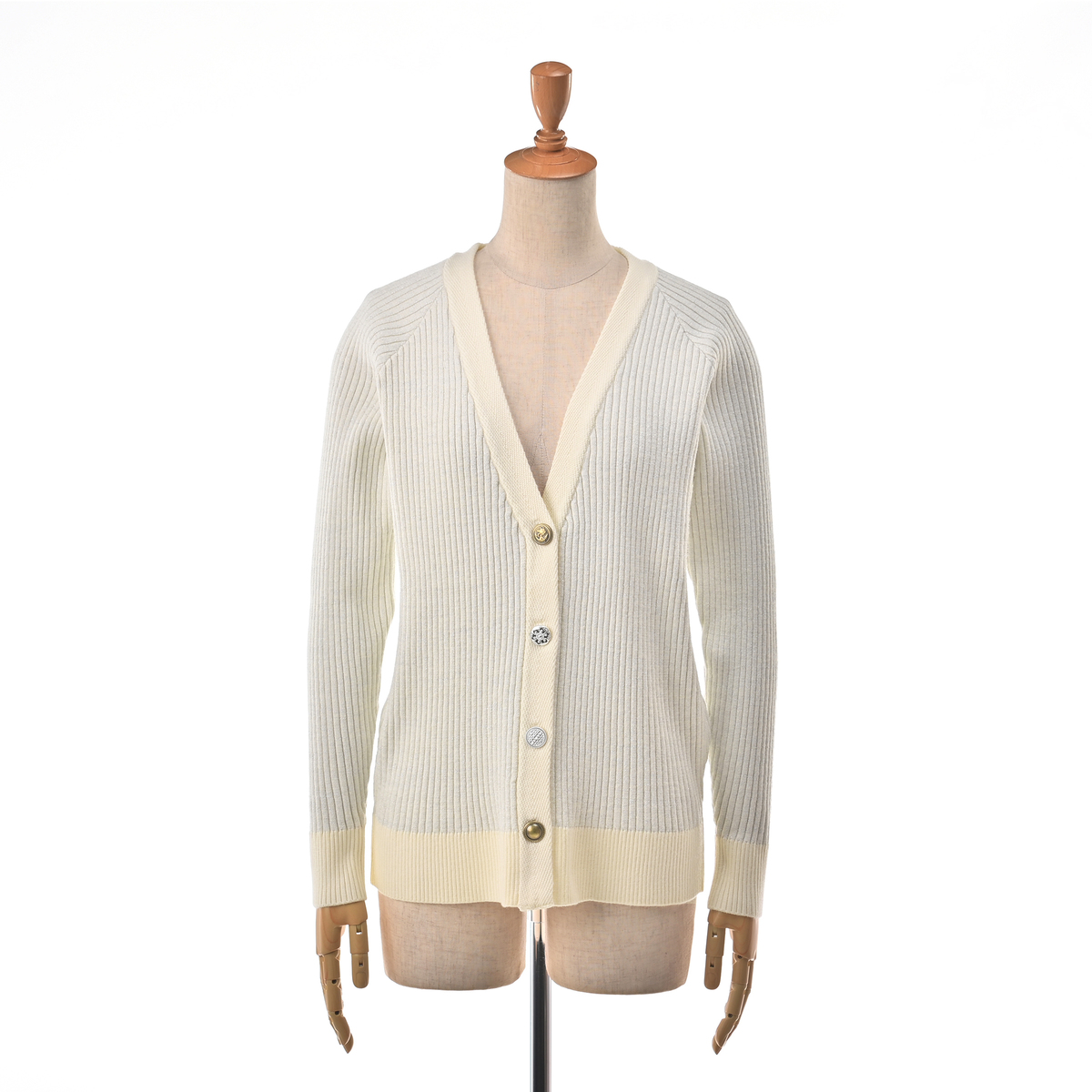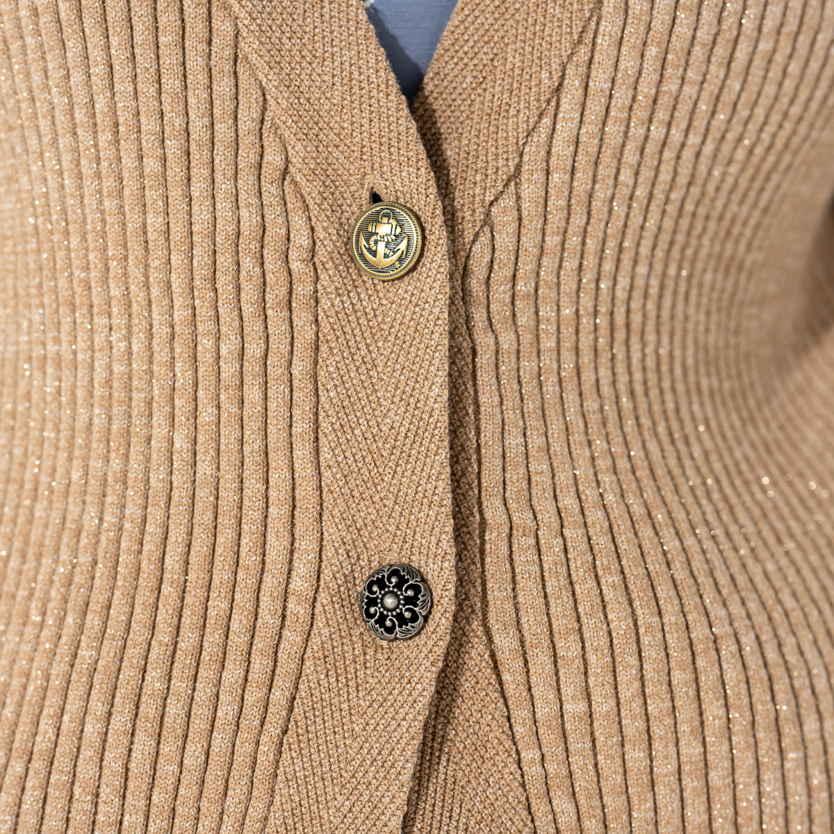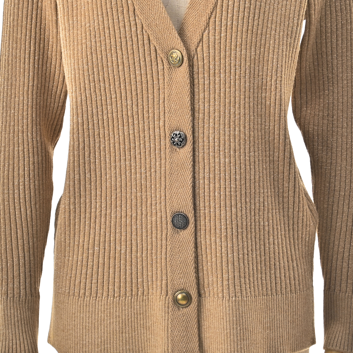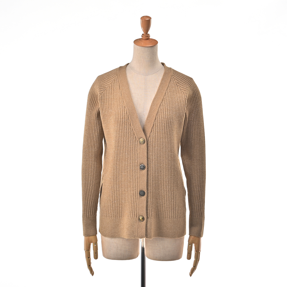 ラメ糸を引き揃えたリブニットカーディガン。前立てに4種類のメタル調ボタンをあしらい、アクセントになっています