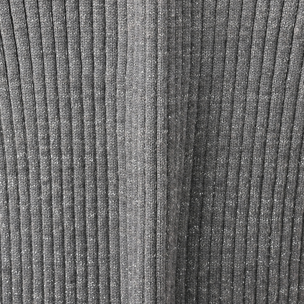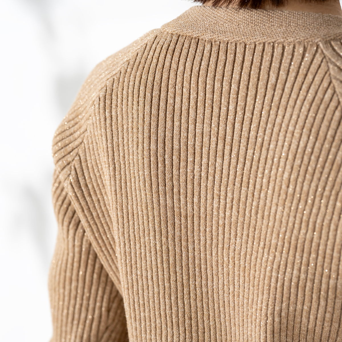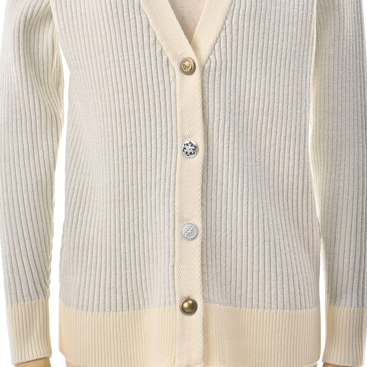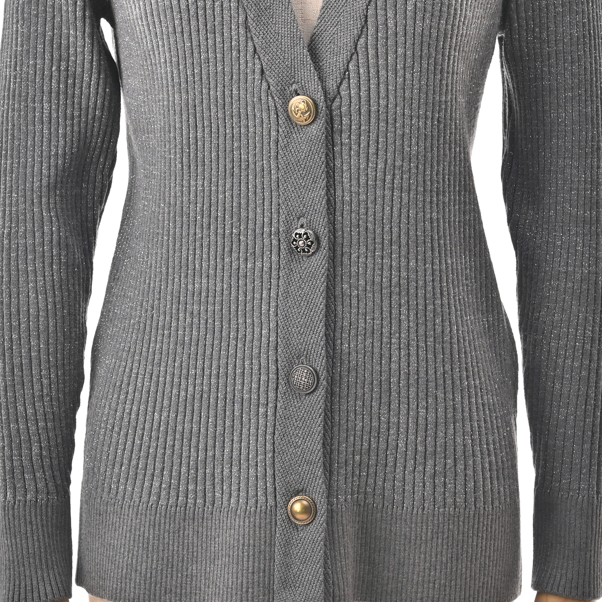 ラメ糸を引き揃えたリブニットカーディガン。前立てに4種類のメタル調ボタンをあしらい、アクセントになっています