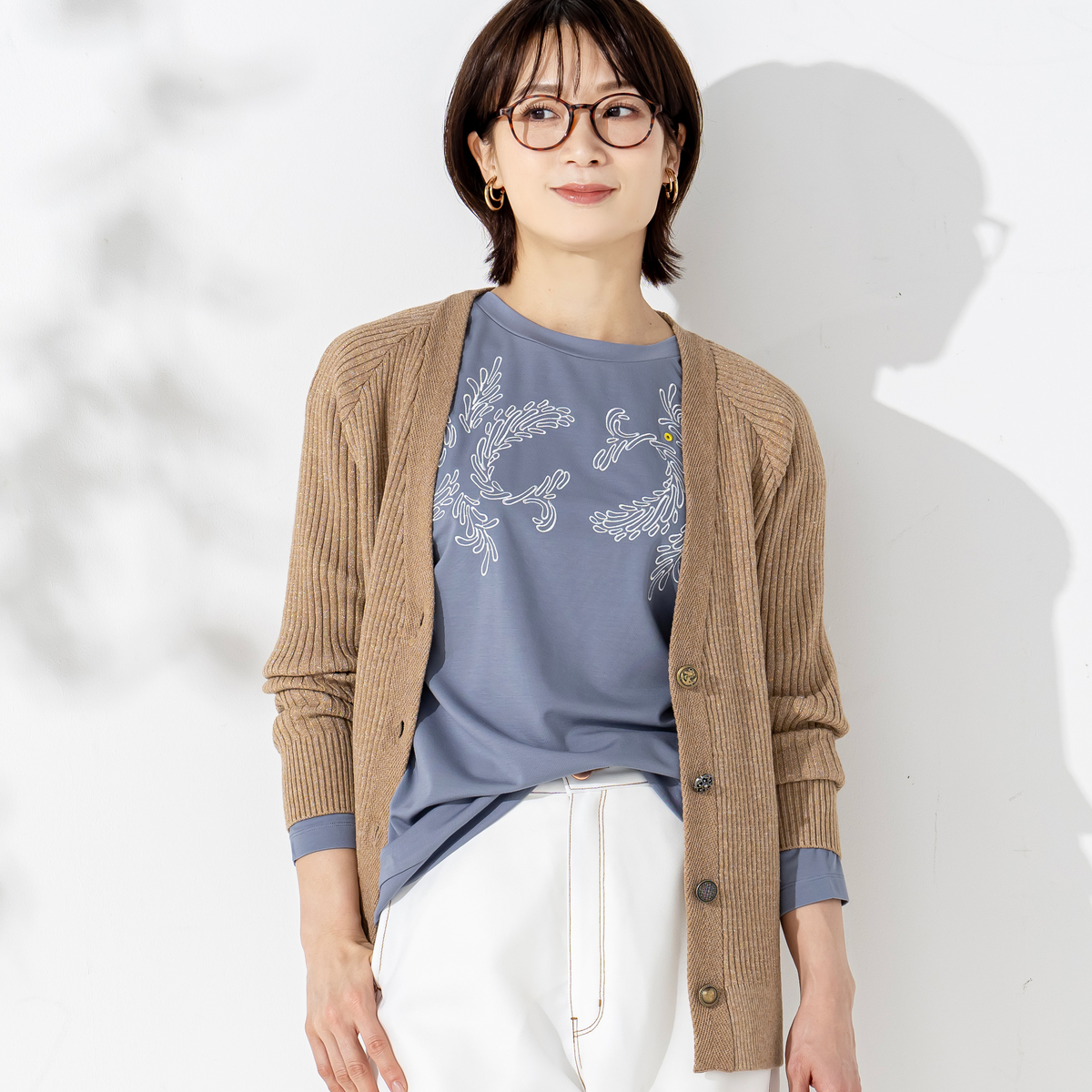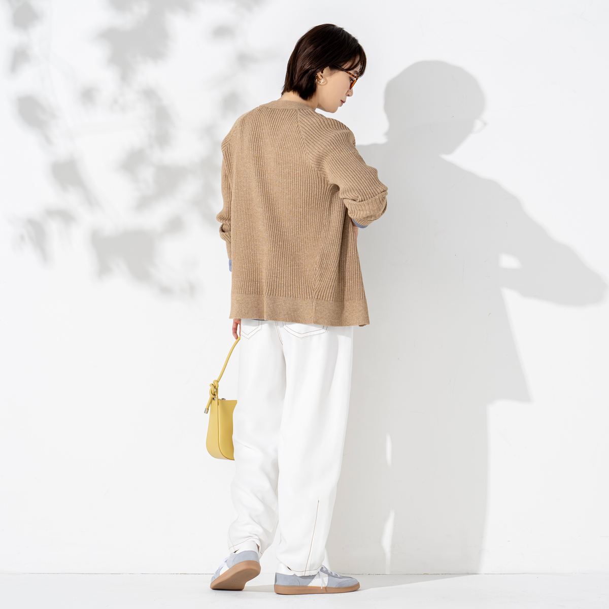 スタイリッシュなVネックデザイン。リブの縦畝を活かしたラグランスリーブで、肩周りをすっきり見せてくれます