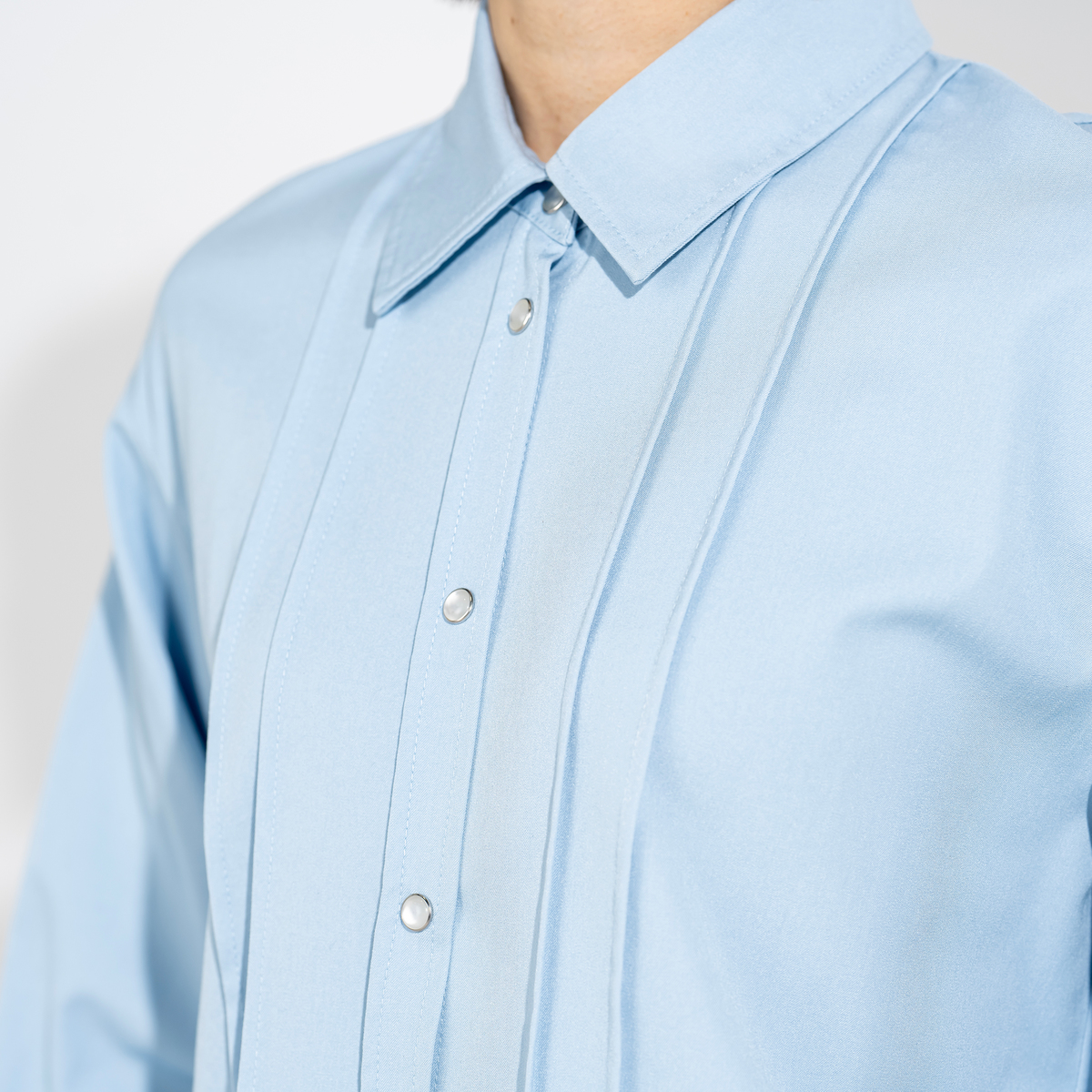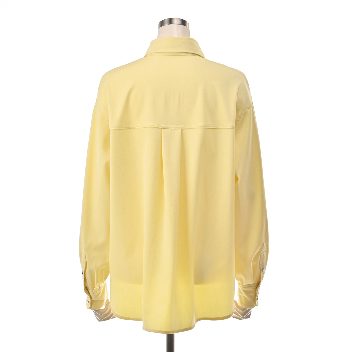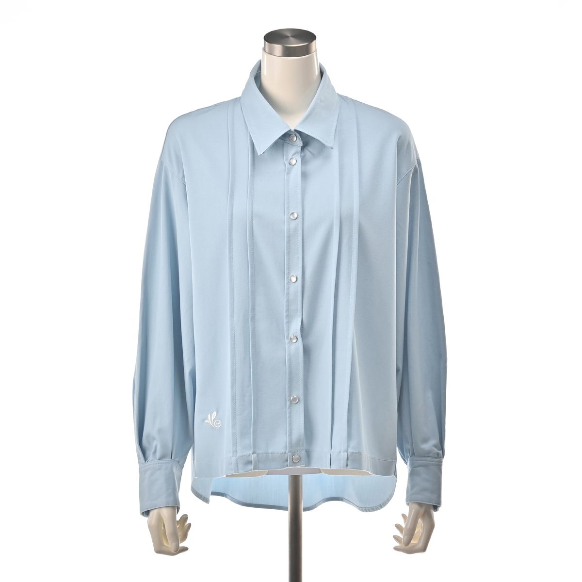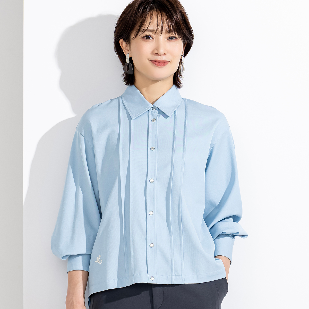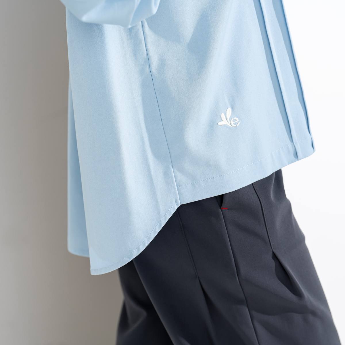 爽やかな表面感が魅力のシャツ。メランジ調のシャンブレーツイル素材を使用し、程良い肉感とトロンと落ちるドレープ、滑らかなツヤが特徴です。ナチュラルストレッチが効いているため着心地も快適。前裾にはハートとブランドロゴのeを組合せた刺繍を施し、控えめながらもほどよいポイントになります
