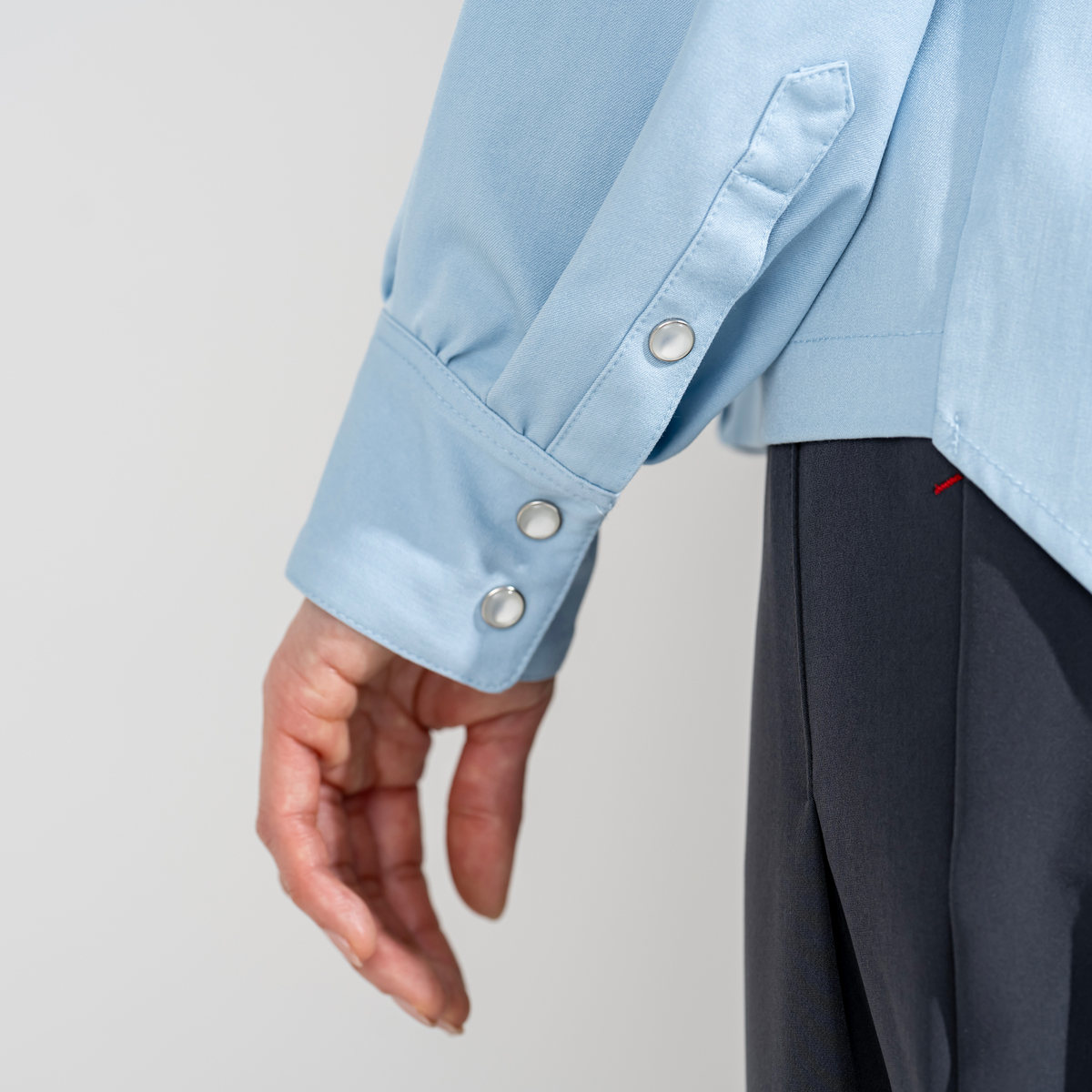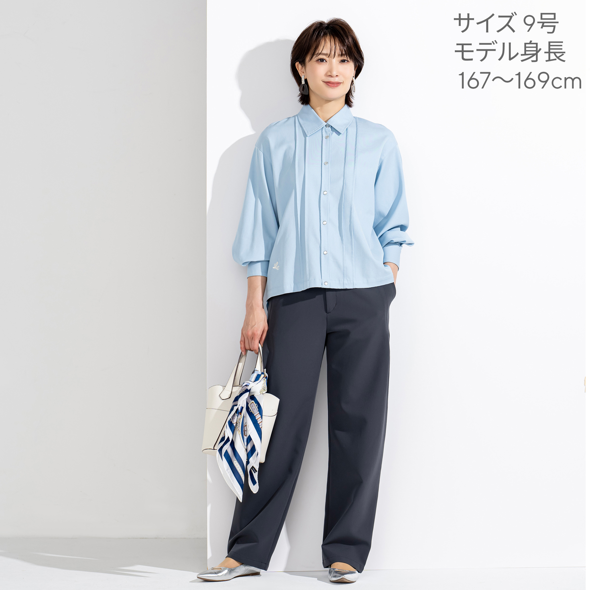 ゆったりした二面体パターンで、ドロップショルダーと好相性のリラクシーなシルエット。前後のタックで縦ラインを強調し、袖はギャザー入りのバルーンスリーブで手元をすっきり演出。後ろ丈は長めでヒップをカバーし、前は短めの水平カットにすることで、前だけインしなくてもバランスよく着こなせます
