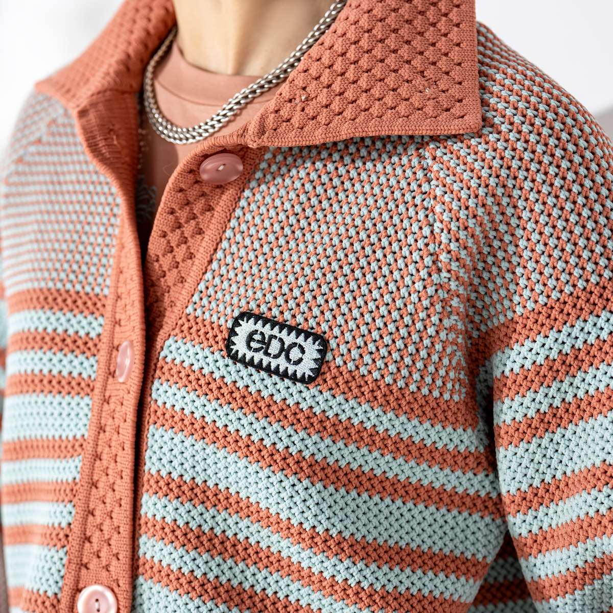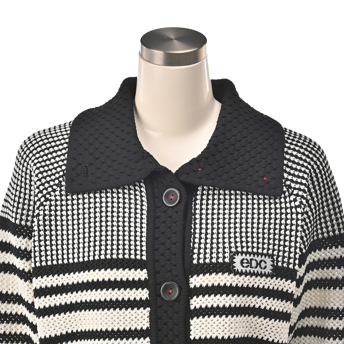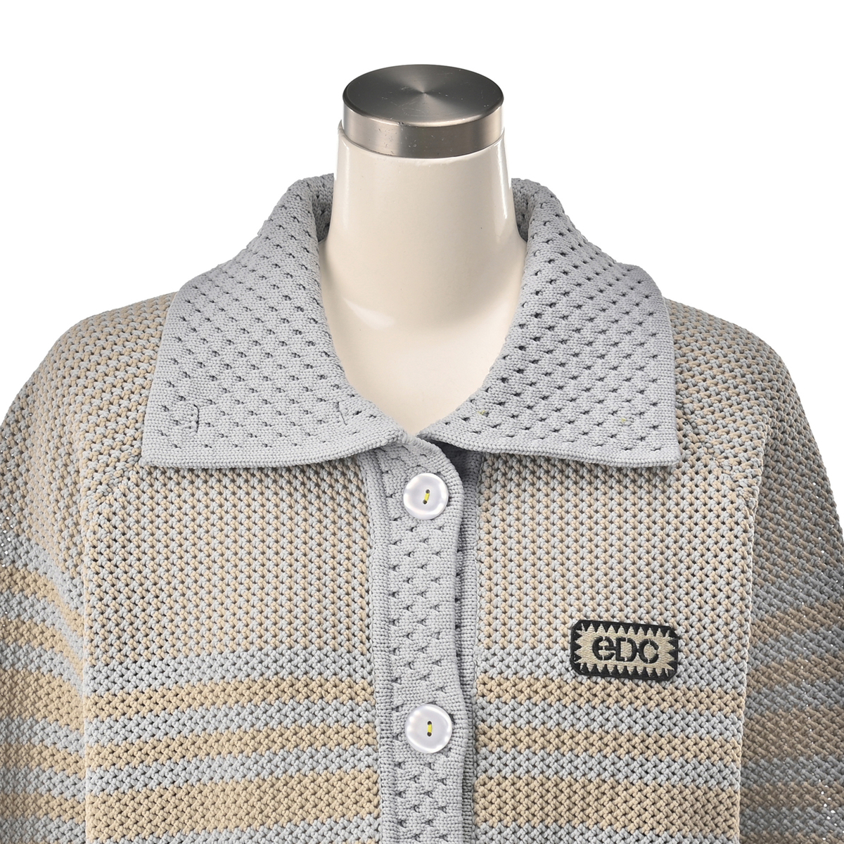 ポリエステル糸を使用することで軽く仕上げ、適度な厚みとやや弾力感を持たせた着心地の良い素材。5ゲージ糸8本取りでボリューム感のあるモスステッチ編みが、表面感を引き立てます