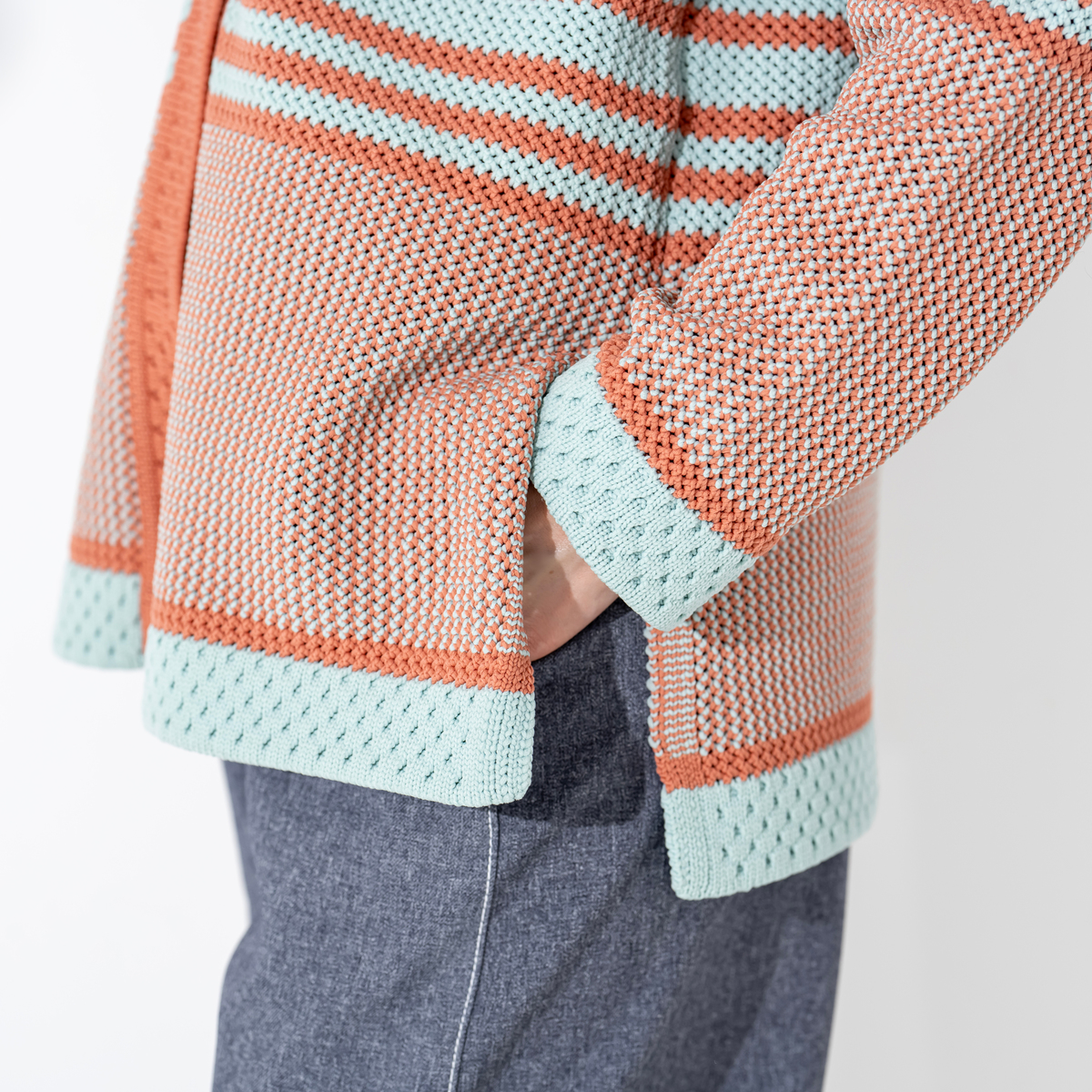 2色の糸を使用したバイカラーのニットカーディガン。バスケット編みにボーダーをアクセントとして加え、1枚で変化の感じられる仕上がりに。ラグランスリーブはシャープな袖付線でデザインし、程よいゆとりのボックスシルエットで裾にはスリットが入っています