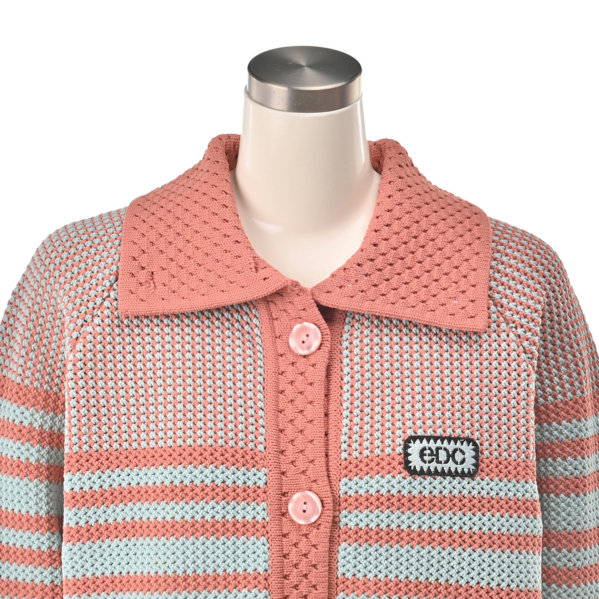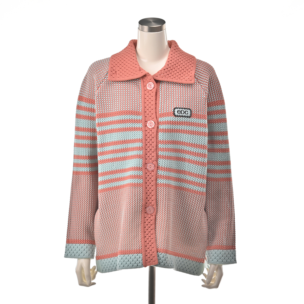 ステンカラー見えの衿付きデザインに2箇所のボタンを配し、ハイネックとしても着用可能。飴玉のような透明感のある変形ボタンを縫い付けたボタン開き仕立てがキュートな表情に。また左胸のブランドロゴ入りの刺繍ワッペンがトラッドな雰囲気をプラスしています