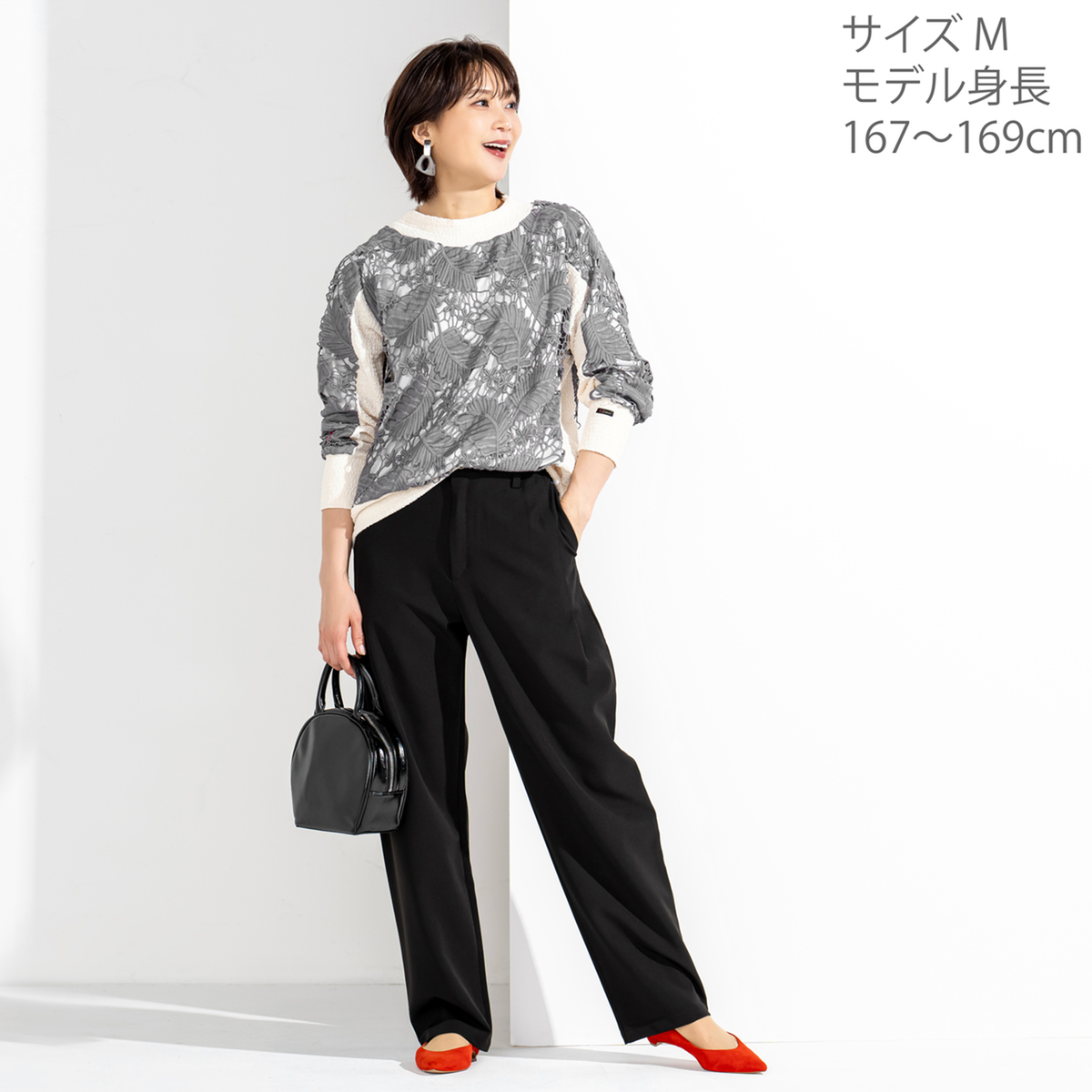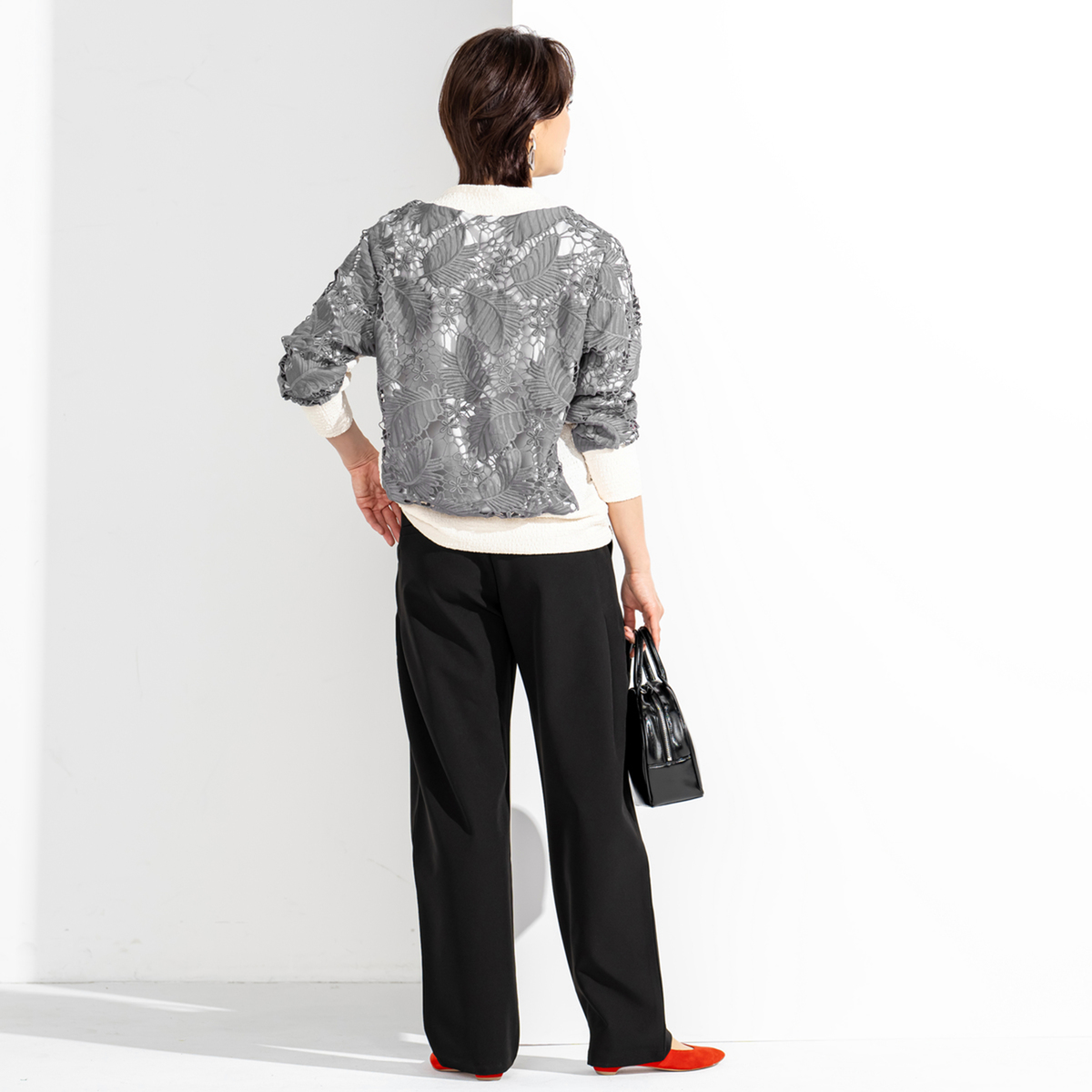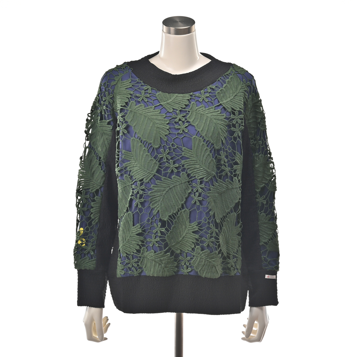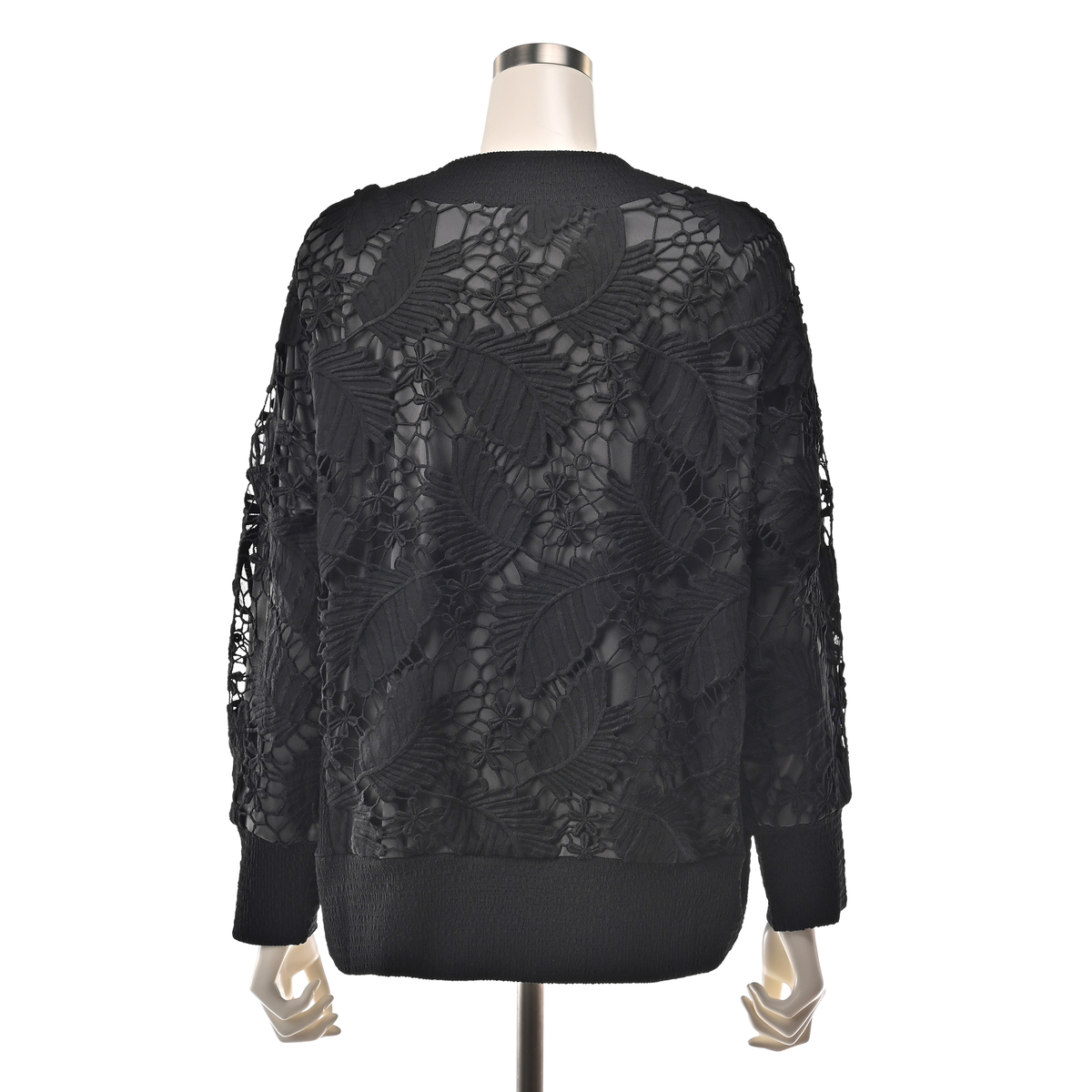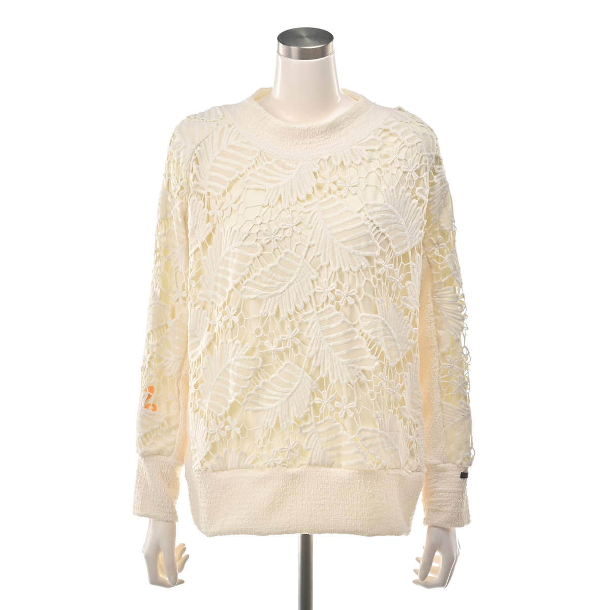平織り生地にカットワークと繊細な刺繍を組合せ、高級感のあるリーフ柄レースに仕上げました。ストレッチ裏地付きで一枚でも着やすく、カジュアルなスエットイメージのデザインにレースを使用する事で、大人の小慣れたエレガンスな着こなしを目指せる1枚に。衿ぐり、袖口、裾、脇をカットソー使いにし、着脱やラフな着こなしをアシストするディテールにしています