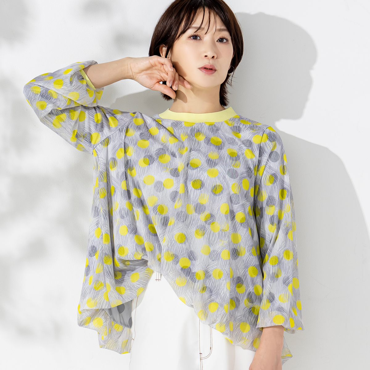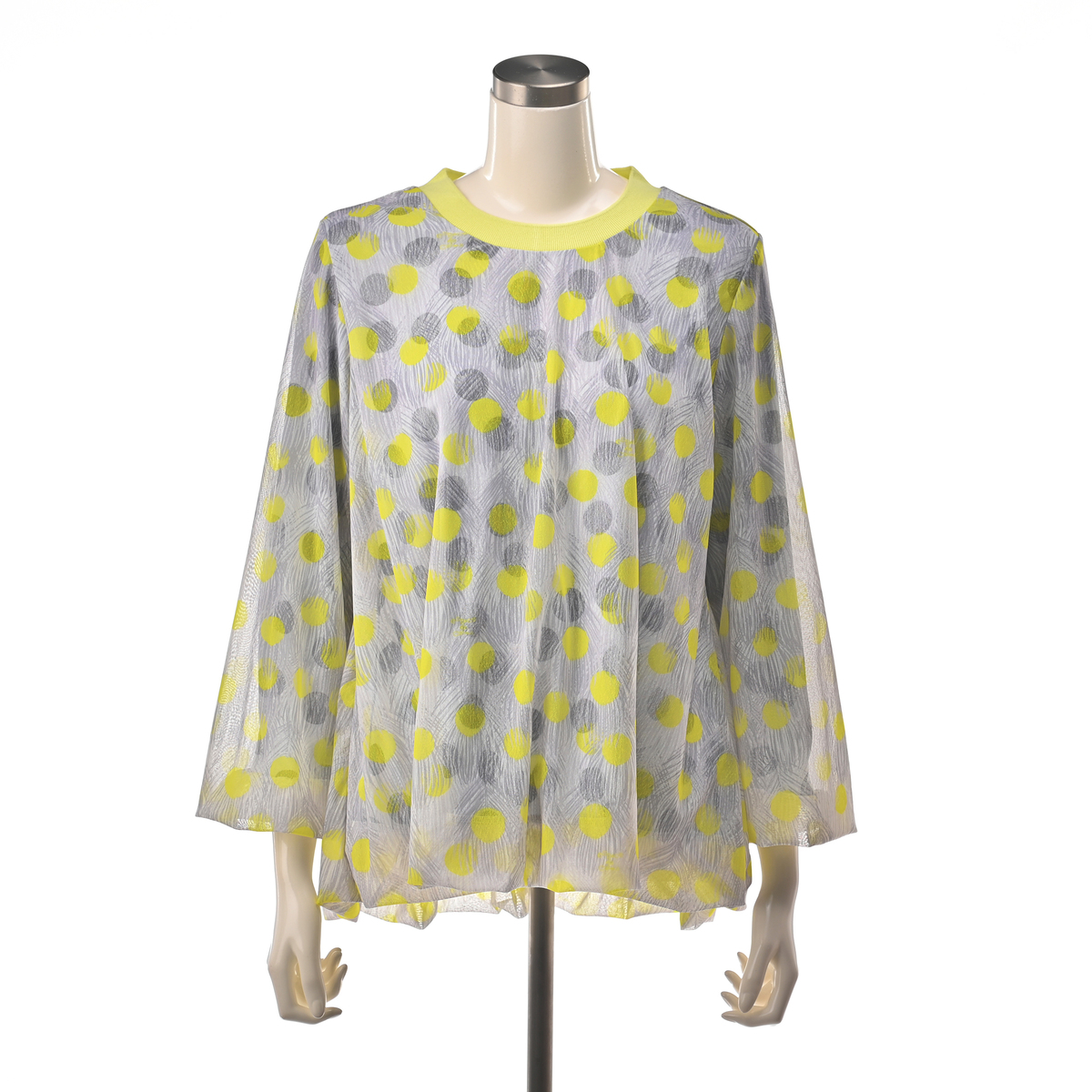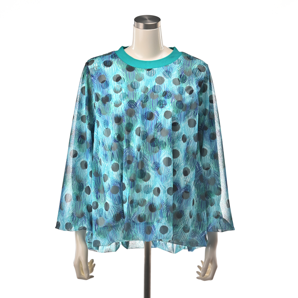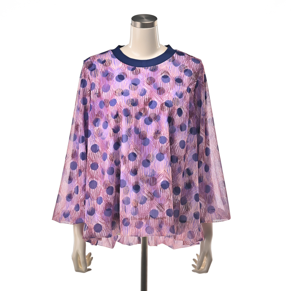 透明感のある薄手のパワーネット素材にオリジナルのピーコック柄をプリントしたチュニック。裏地には透けて見えるようにドット柄をプリントし、奥行き感が楽しめます