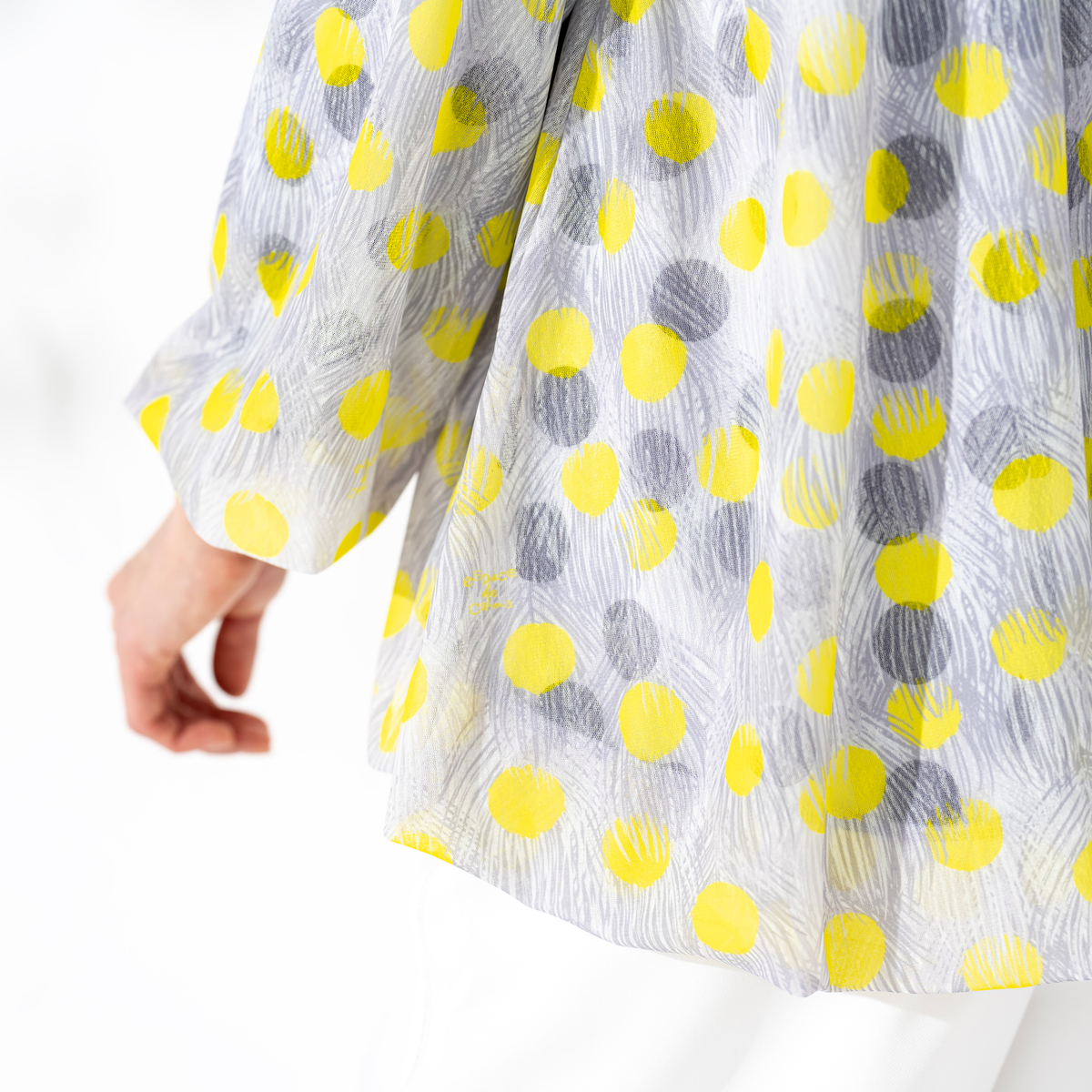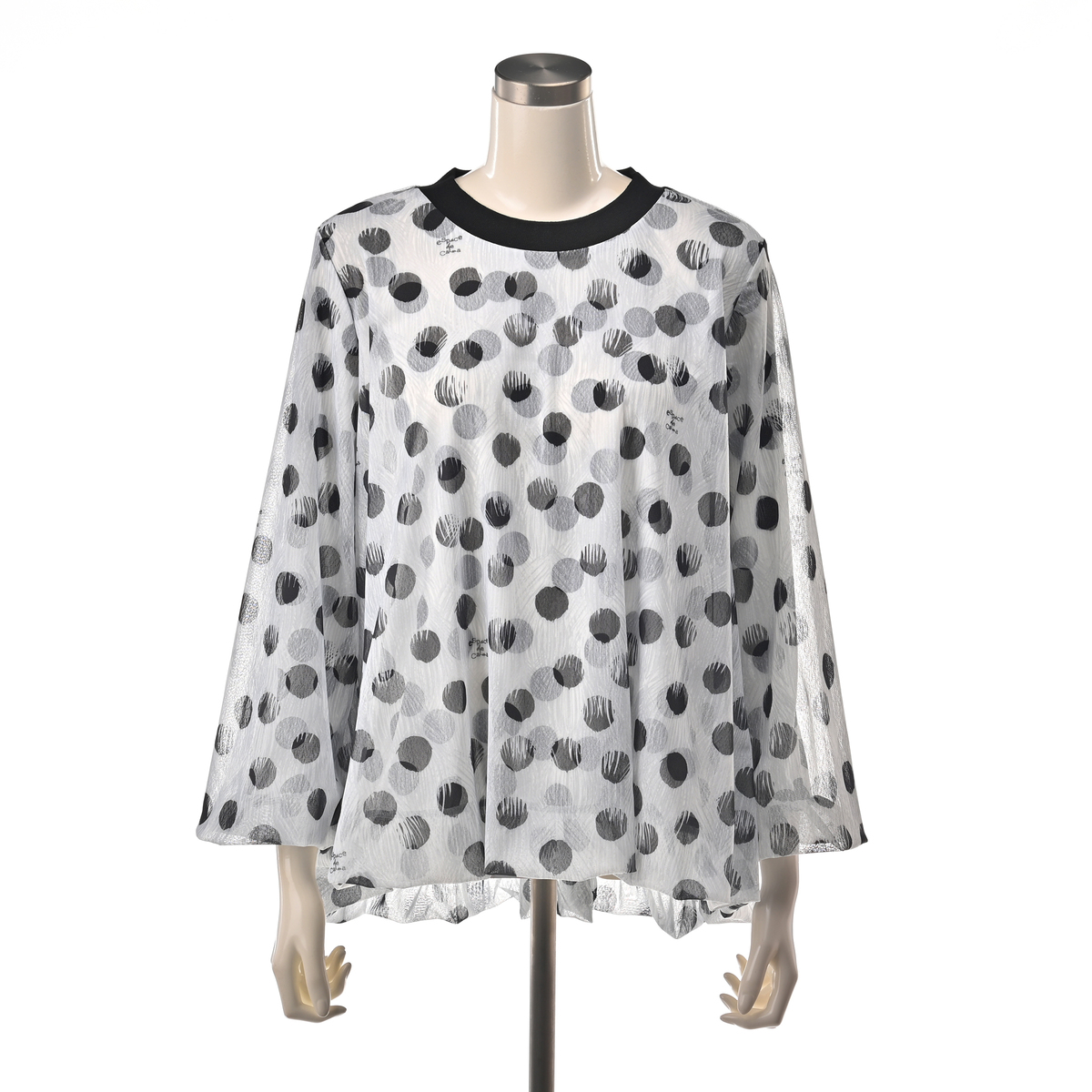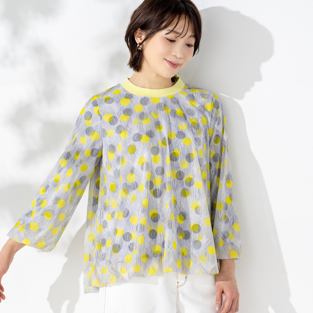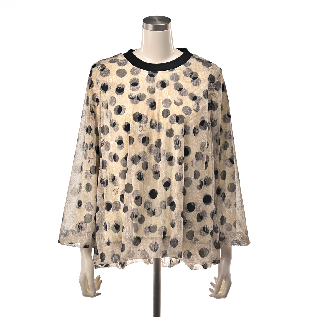 透明感のある薄手のパワーネット素材にオリジナルのピーコック柄をプリントしたチュニック。裏地には透けて見えるようにドット柄をプリントし、奥行き感が楽しめます