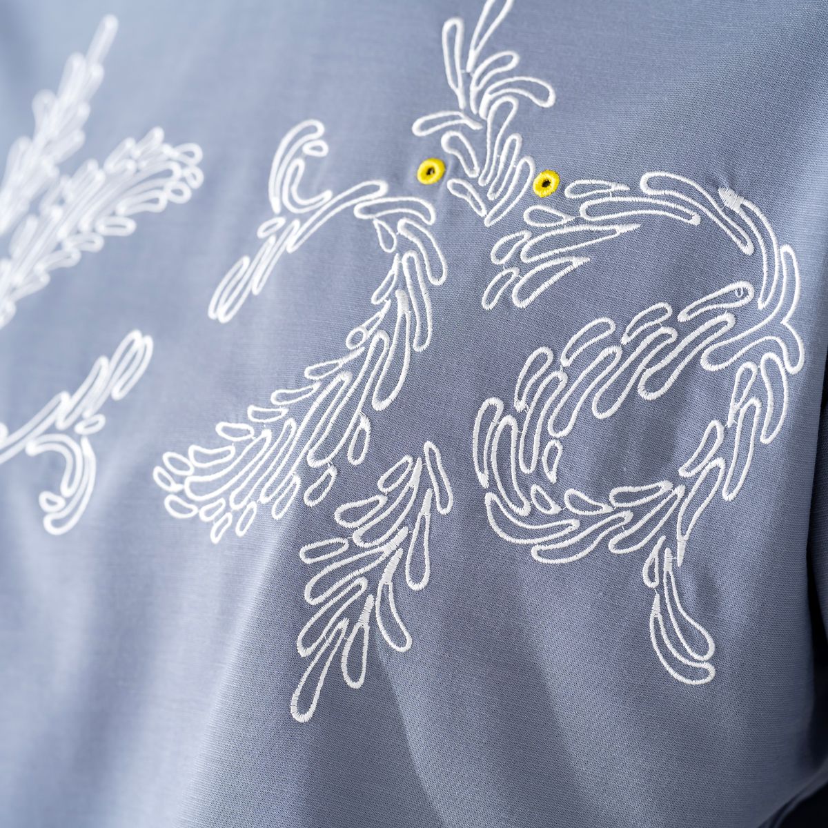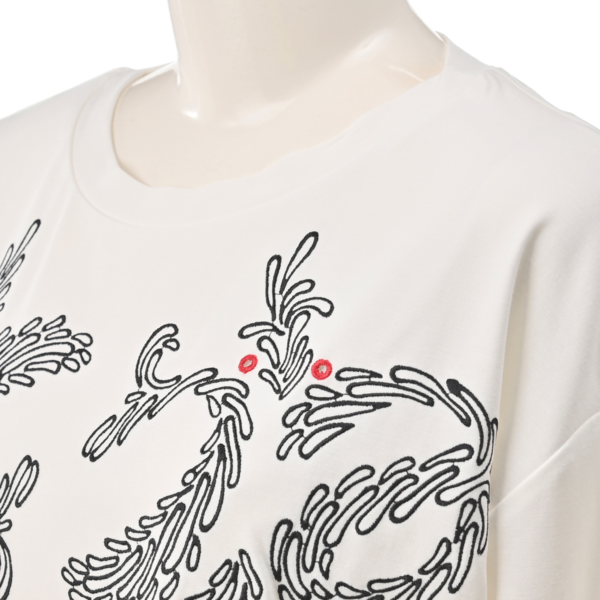 上質な印象でシルキーな肌触りと艶のある、細番手の滑らかなポンチを使用。前身頃にはリーフ柄をイメージしてデザイナーが描いたモチーフの刺繍を全面に施し、左胸には配色糸の菊穴も。直接肌に当たらない様に刺繍部分にはストレッチの裏地付きです