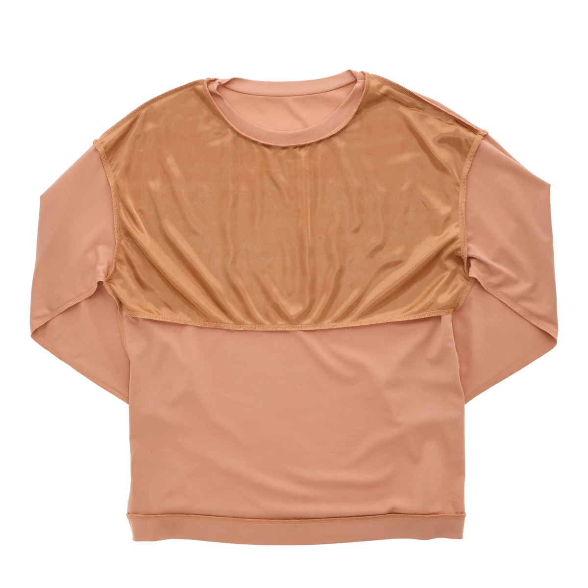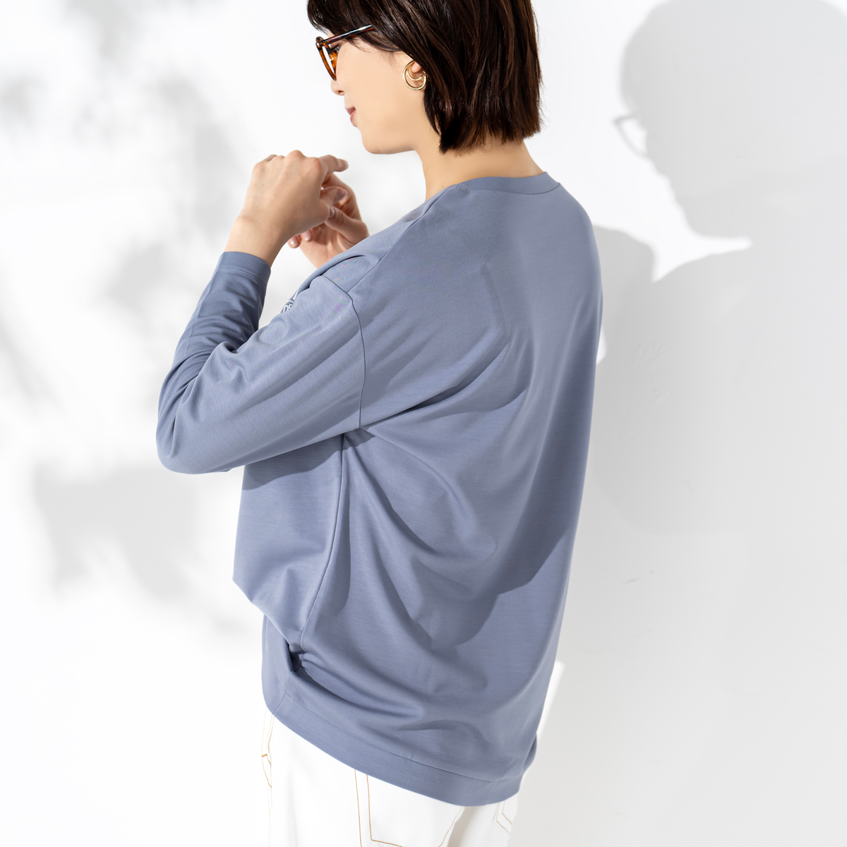 左右のネックポイントをVの字に接ぐことで、衿が跳ね上がらず美しくデコルテに沿うように工夫した仕立て。ゆったりとしたバスト幅、カービーなシルエットを作るため、ウエスト部分を若干シェイプした立体のシルエットです