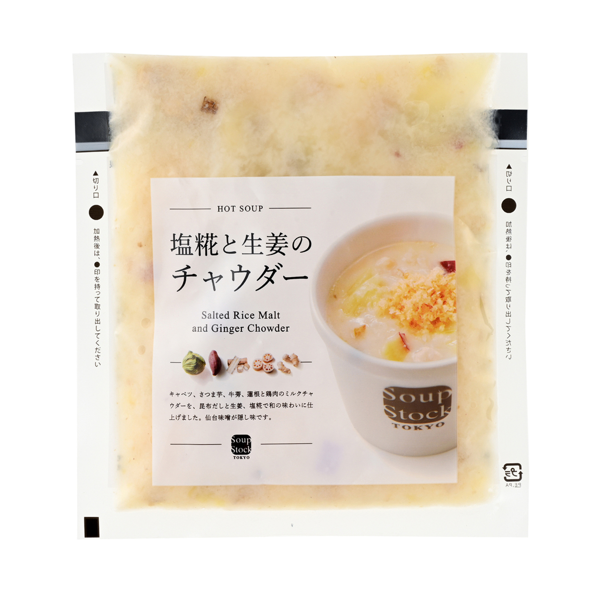 キャベツ、さつま芋、牛蒡、蓮根と鶏肉のミルクチャウダーを、昆布だし(昆布エキス)と生姜、塩糀で和の味わいに仕上げました。味噌が隠し味です