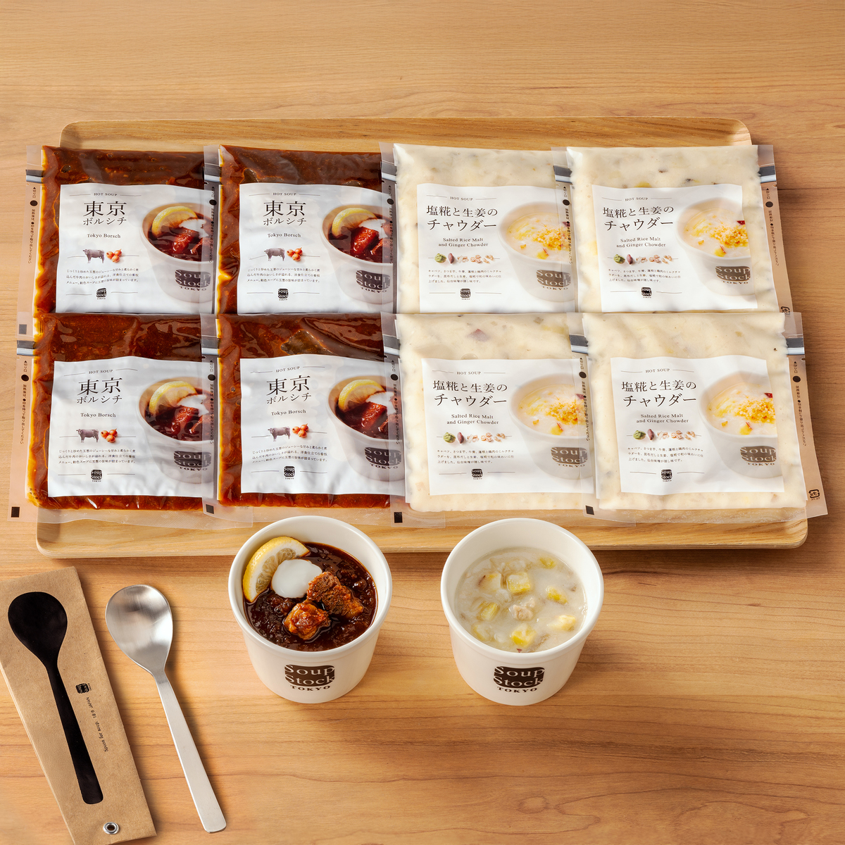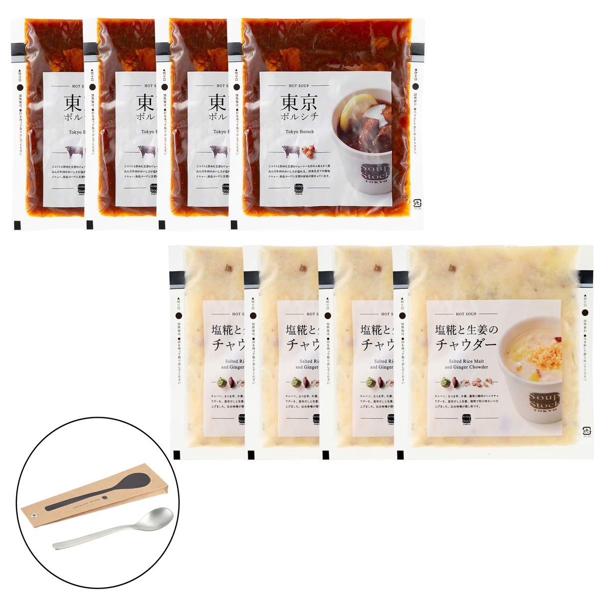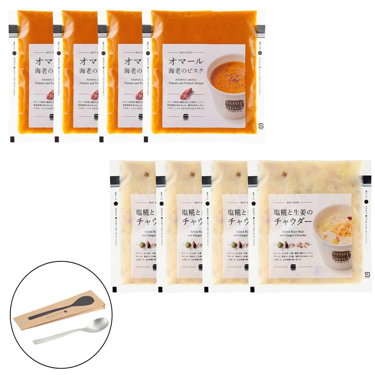 [アレルギー物質特定原材料8品目] 小麦、乳、えび、かに ※オマール海老のビスク:はちみつを使用しておりますので、1歳未満のお子様には与えないでください。 [セット内容]※以下よりお選びください <オマール海老のビスク&オニオンクリームポタージュ> ・各180g×4 2種計8袋 ・スプーン <東京ボルシチ&塩糀と生姜のチャウダ―> ・各180g×4 2種計8袋 ・スプーン <オマール海老のビスク&塩糀と生姜のチャウダ―> ・各180g×4 2種計8袋 ・スプーン [賞味期限] 出荷時点で賞味期限まで180日以上ある商品をお届けします [保存方法] 開封前:冷凍(ー18℃以下)で保存してください 開封後:開封後はすぐにお召し上がりください [お召し上がり方] 電子レンジで温める場合 ・凍ったまま開封せずに蒸気吹出口を上にしてお皿にのせ、電子レンジに入れ、500w:4分30秒、600w:4分(オニオンクリームポタージュ500w:4分、600w:3分30秒)を目安に加熱してください ・加熱中は、袋が膨らみますが、一定以上に膨らむと蒸気が吹き出し口から抜けてしぼみます ・加熱終了後はお皿に袋をのせたまま取り出し、蒸気吹き出し口を上にして、切り口部を開封してください 湯煎での加熱方法 ・凍ったまま開封をせずに袋ごと、沸騰したお湯の中で約5分間温めてください。鍋にフタはしないでください [注意事項] ※加熱しすぎると品質が劣化、分離する場合があります ※商品は冷凍室(ー18℃以下)で保存してください ※一度解凍したものを再冷凍しないでください ※開封後はすぐにお召し上がりください ※開封時に袋のフチで手を切らないようにご注意ください ※写真は盛り付け例とイメージです <オマール海老のビスク> ※はちみつを使用しておりますので、1歳未満のお子様には与えないでください [原料原産地] 東京ボルシチ:ソテー野菜〔野菜(玉葱、人参、セロリ、にんにく)、牛脂、菜種油〕(国内製造) オマール海老のビスク:オマール海老ブイヨン〔オマールエビヘッド、野菜(玉葱、人参、セロリ、にんにく、パセリ)、トマトペースト、ワイン、トマト・ピューレーづけ、ブランデー、オリーブ油、大豆油、酢漬けタラゴン、食塩、香辛料〕(国内製造) オニオンクリームポタージ:クリーム(国内製造) 塩糀と生姜のチャウダー:牛乳(国内製造) [原産国]日本 <スプーン> [サイズ]約縦18×横4cm [重量]約45g [材質]ステンレス [注意事項] ※電子レンジのご使用は不可となります ※食器洗浄機対応可 【日本製】 [原材料] 東京ボルシチ:ソテー野菜〔野菜(玉葱、人参、セロリ、にんにく)、牛脂、菜種油〕(国内製造)、牛肉、トマトペースト、ビーフエキス、チキンブイヨン、食塩、醤油、香辛料 / カラメル色素、(一部に小麦・牛肉・大豆・鶏肉を含む) オマール海老のビスク:野菜(玉葱、人参、セロリ、にんにく)、オマール海老ブイヨン〔オマールエビヘッド、野菜(玉葱、人参、セロリ、にんにく、パセリ)、トマトペースト、ワイン、トマト・ピューレーづけ、ブランデー、オリーブ油、大豆油、酢漬けタラゴン、食塩、香辛料〕(国内製造)、牛乳、クリーム、トマトペースト、ワイン、澱粉、ホタテブイヨン、バター、豚脂、カニブイヨン、食塩、はちみつ、ブランデー、香辛料、(一部に乳成分・えび・かに・大豆・豚肉を含む) オニオンクリームポタージュ:クリーム(国内製造)、ソテーオニオン(玉葱、菜種油、バター)、マッシュポテト、さつま芋ペースト、野菜(玉葱、にんにく)、チキンブイヨン、ソテーマッシュルーム(マッシュルーム、菜種油)、ソテーリーキ(ポロ葱、菜種油)、バター、ブランデー、食塩、ビーフエキス、大豆油、澱粉、香辛料、(一部に乳成分・小麦・牛肉・大豆・鶏肉を含む) 塩糀と生姜のチャウダー:野菜(玉葱、キャベツ、さつま芋、ごぼう、れんこん、生姜、にんにく)、牛乳(国内製造)、ルー(小麦粉、パーム油)、鶏肉、塩こうじ、澱粉、チキンブイヨン、米みそ、魚醤加工品(魚醤、昆布エキス、食塩、酵母エキス)、大豆油、食塩、豚脂、香辛料、醸造酢、(一部に乳成分・小麦・大豆・鶏肉・豚肉を含む)