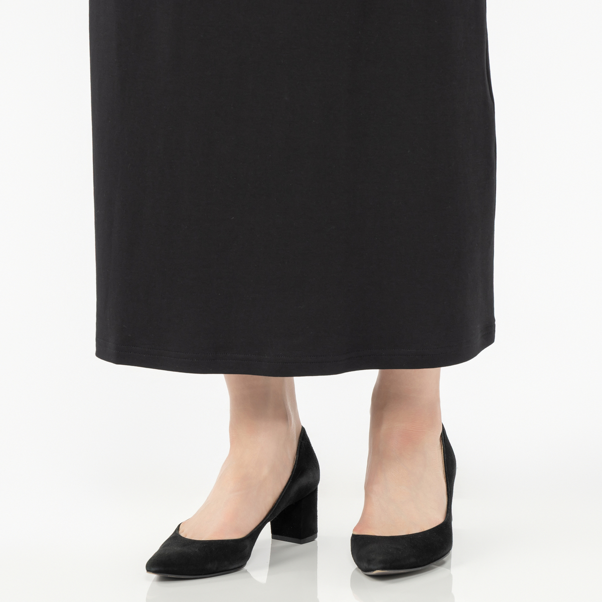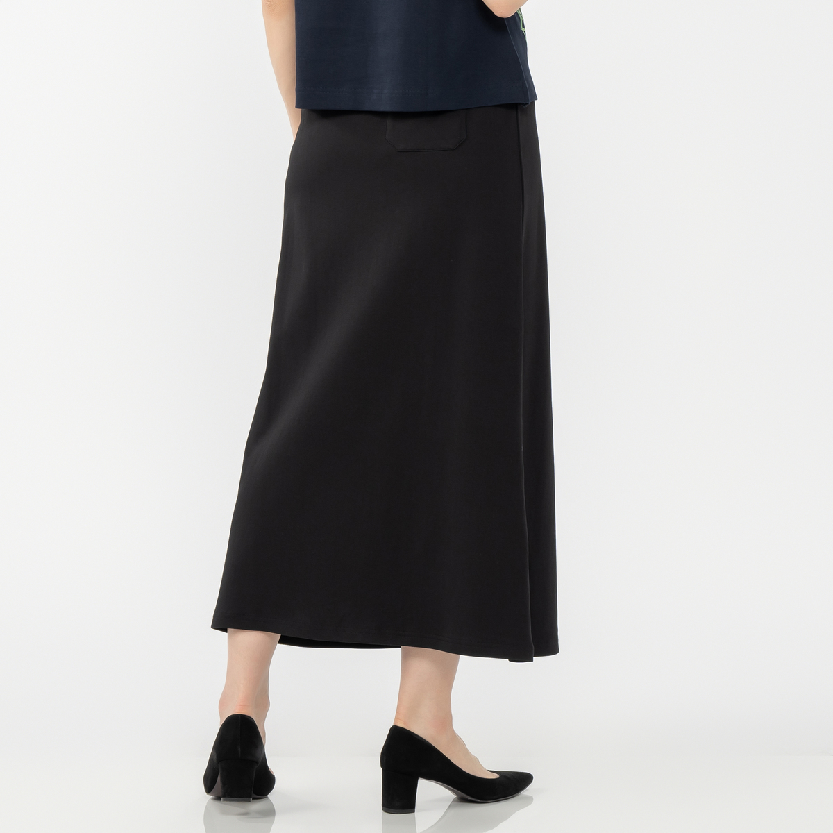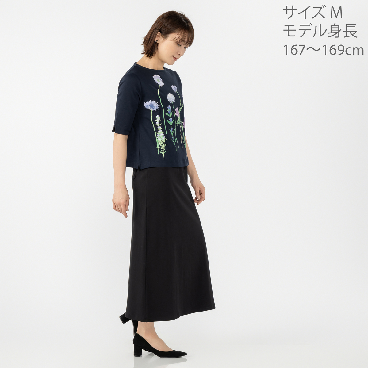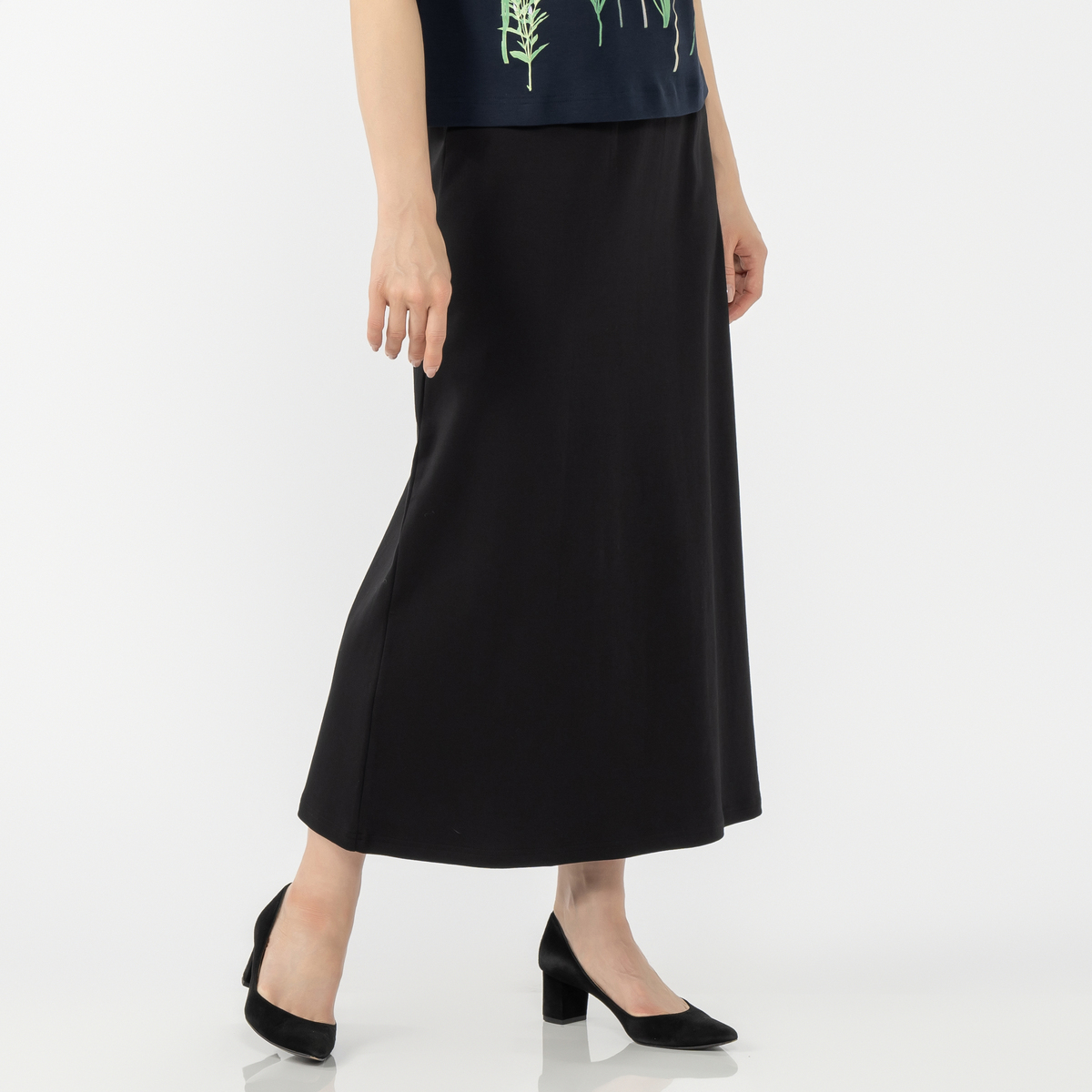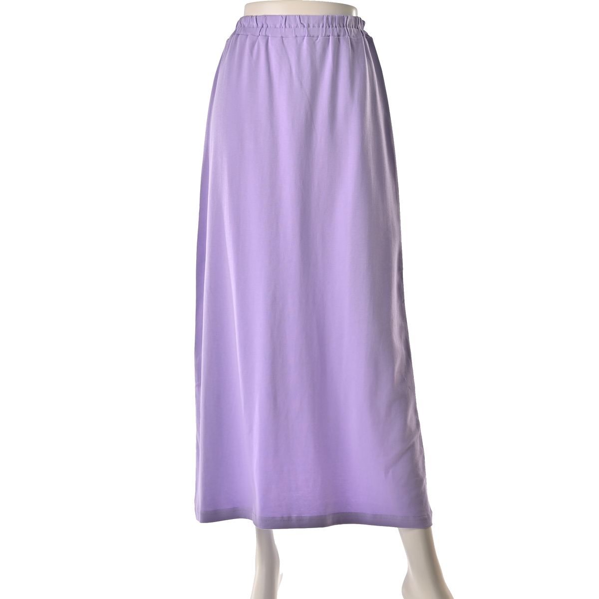 ロング丈で気になるお腹やヒップ、足元までしっかりカバーするスカート。綿100%の生地で、シルケット加工とバイオ加工で毛羽立ちが抑えられ、生地色やプリントがきれいに映ります。ストレッチ性があり動きやすく、ウエストは総ゴム仕様です