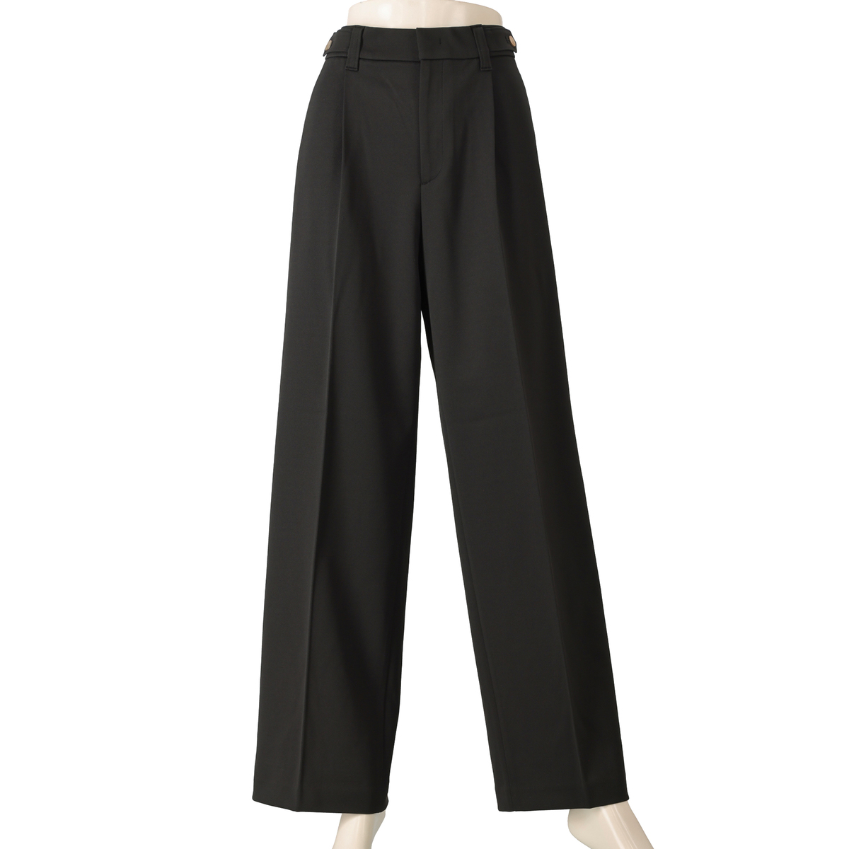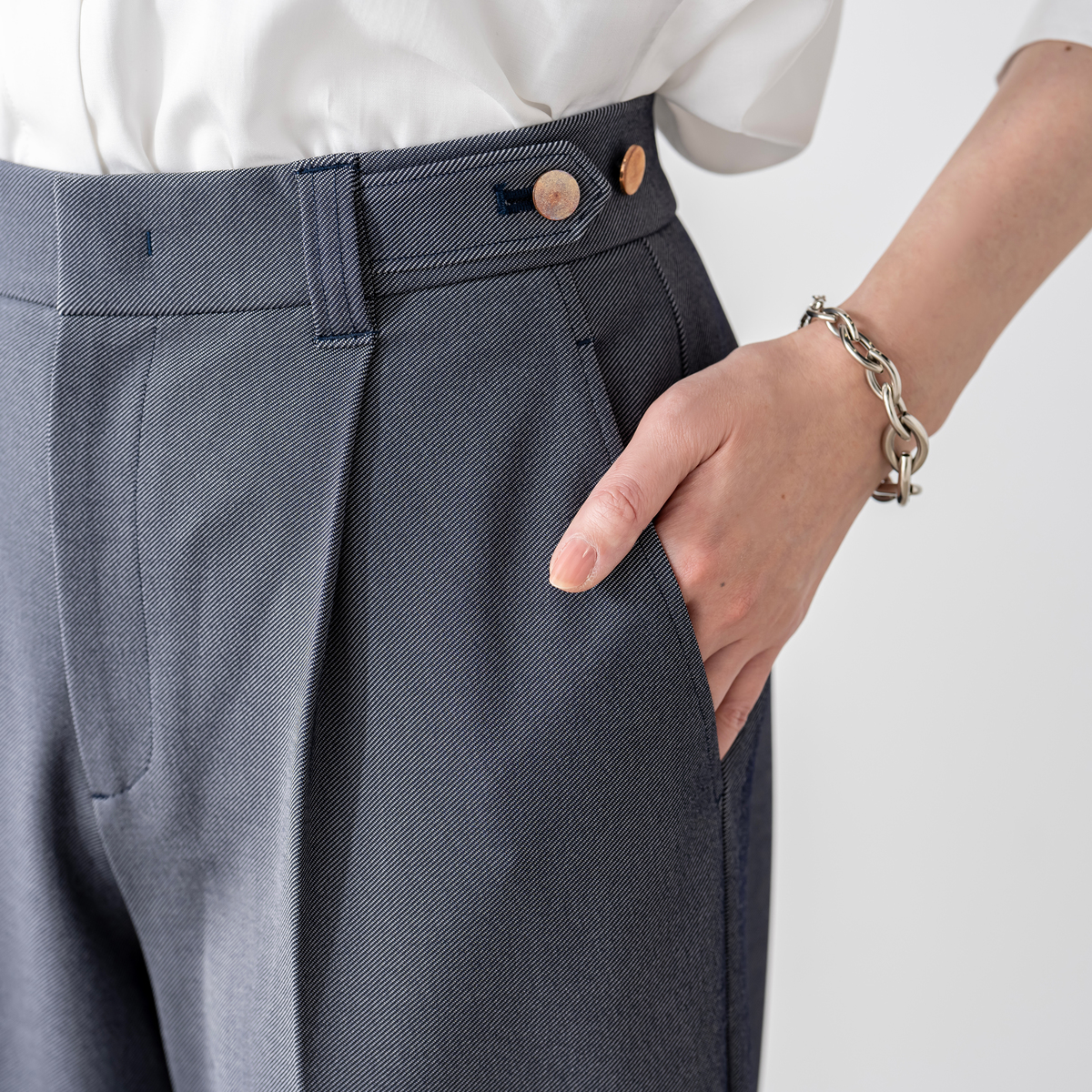 ウエストの両サイドにあるボタンの付いたタブがさりげないアクセントに。少しウエストを絞りたいときにフィット感を調節できる仕様です