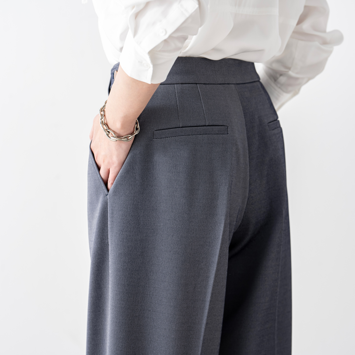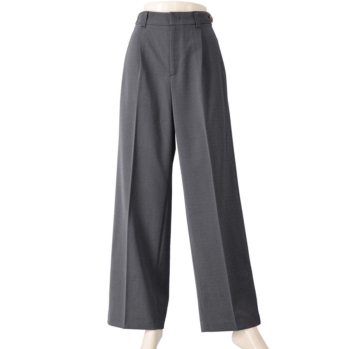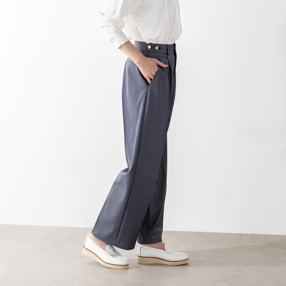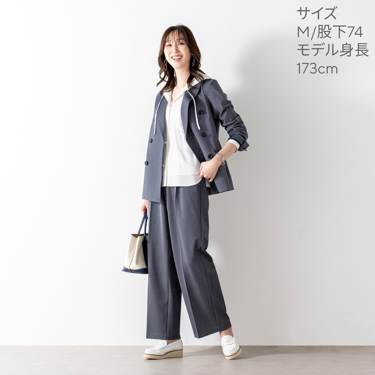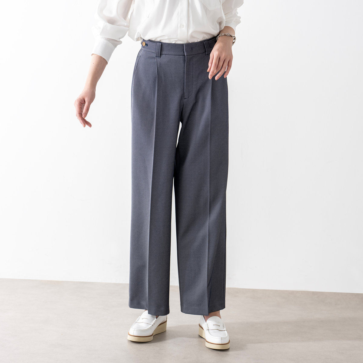 きれいめにもカジュアルにも合わせやすいワイドパンツ。太ももやヒップのラインを拾いにくく、センタープレスの縦ラインによりスタイルアップ効果が期待できます