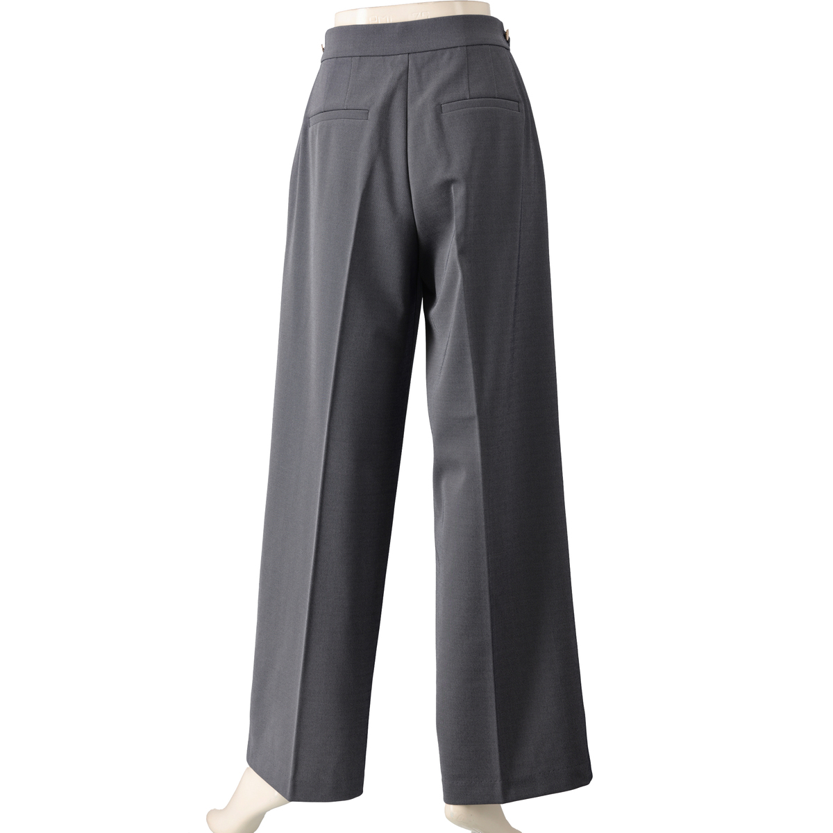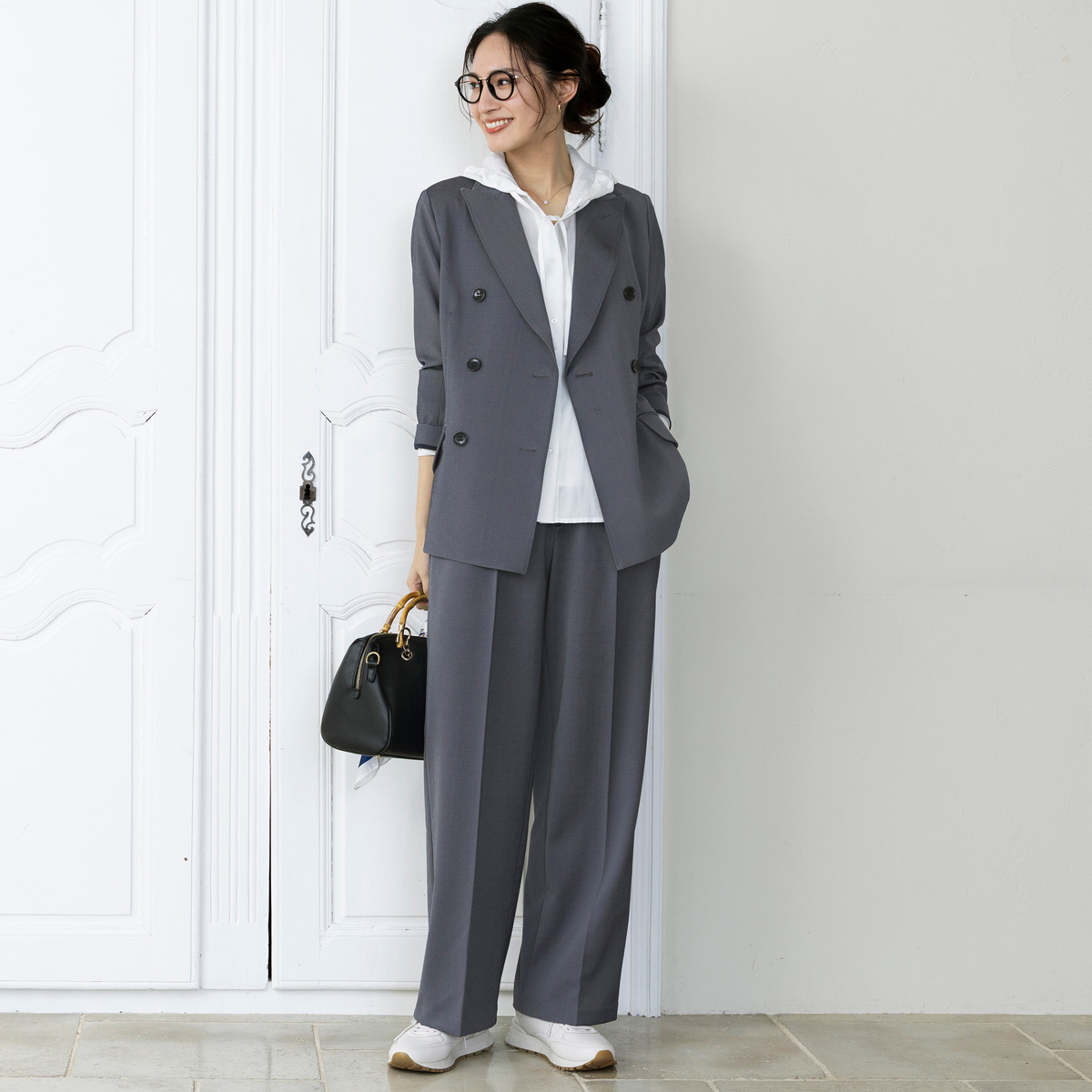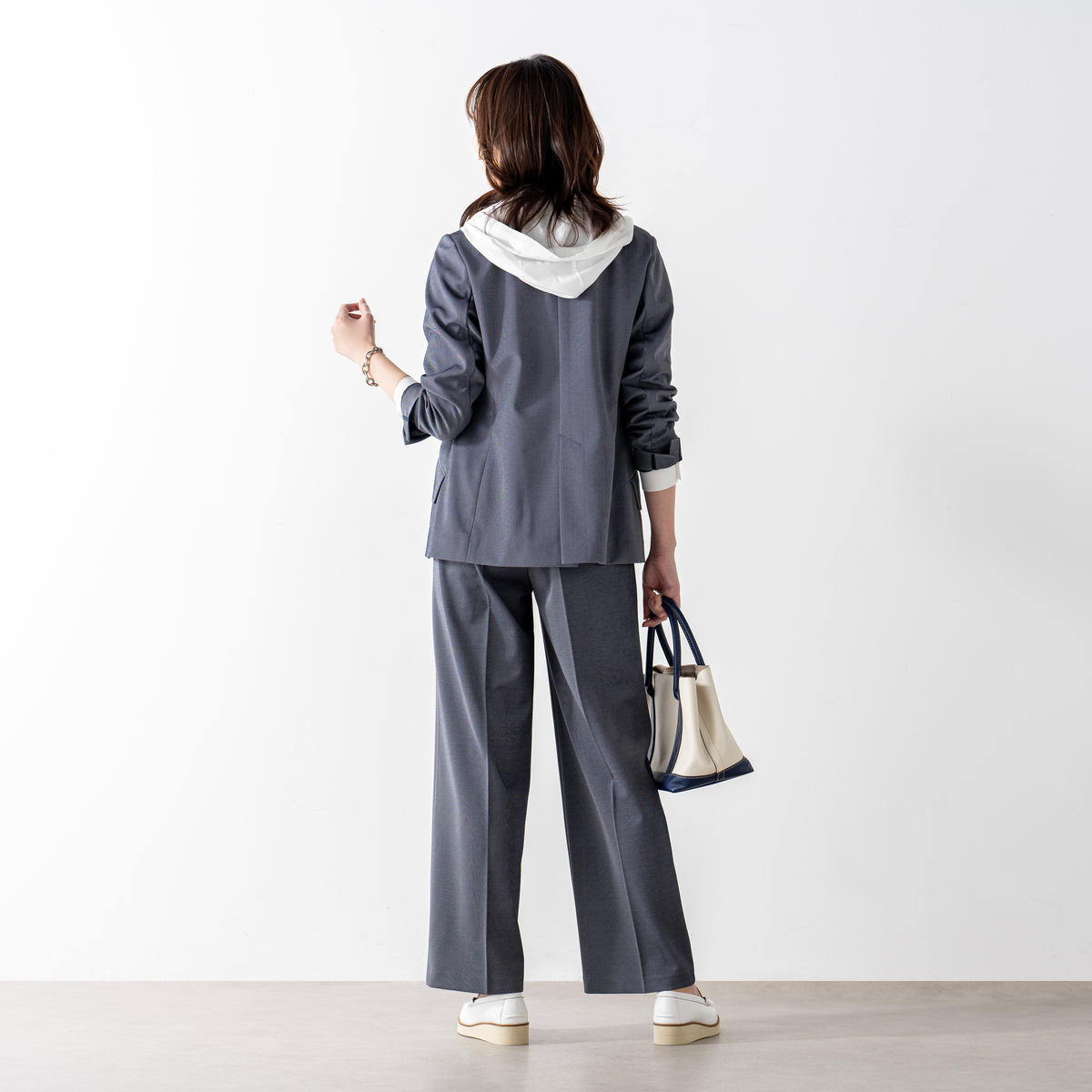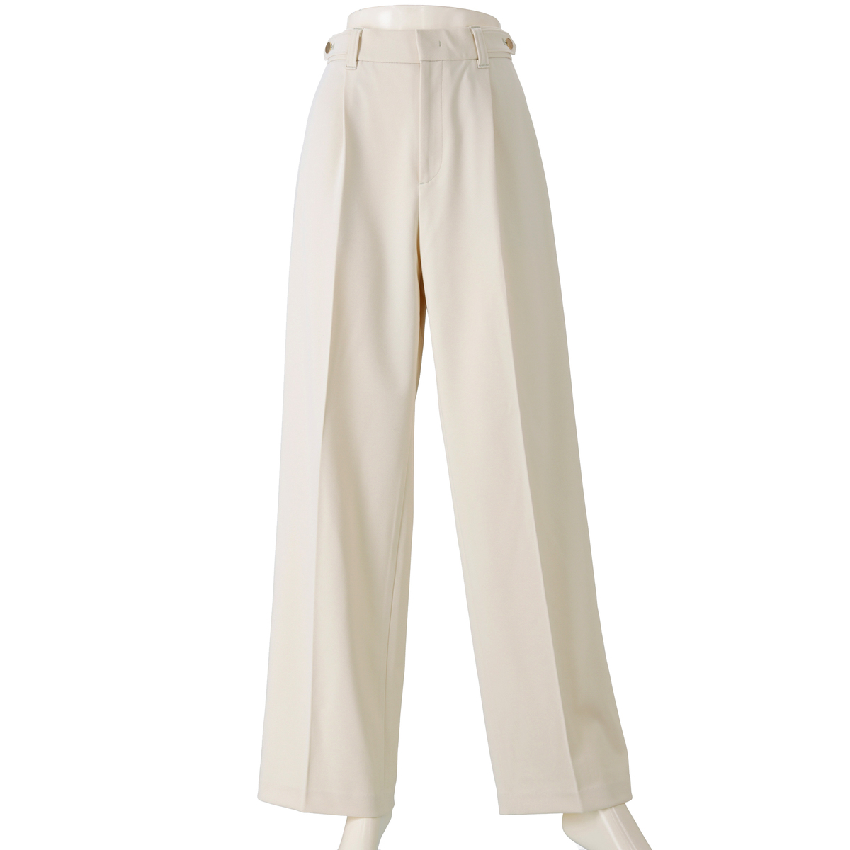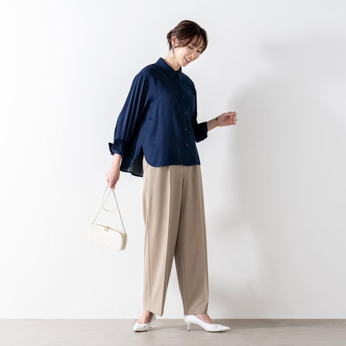 きれいめにもカジュアルにも合わせやすいワイドパンツ。太ももやヒップのラインを拾いにくく、センタープレスの縦ラインによりスタイルアップ効果が期待できます