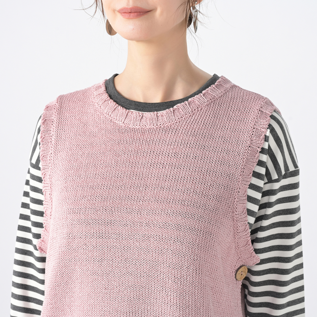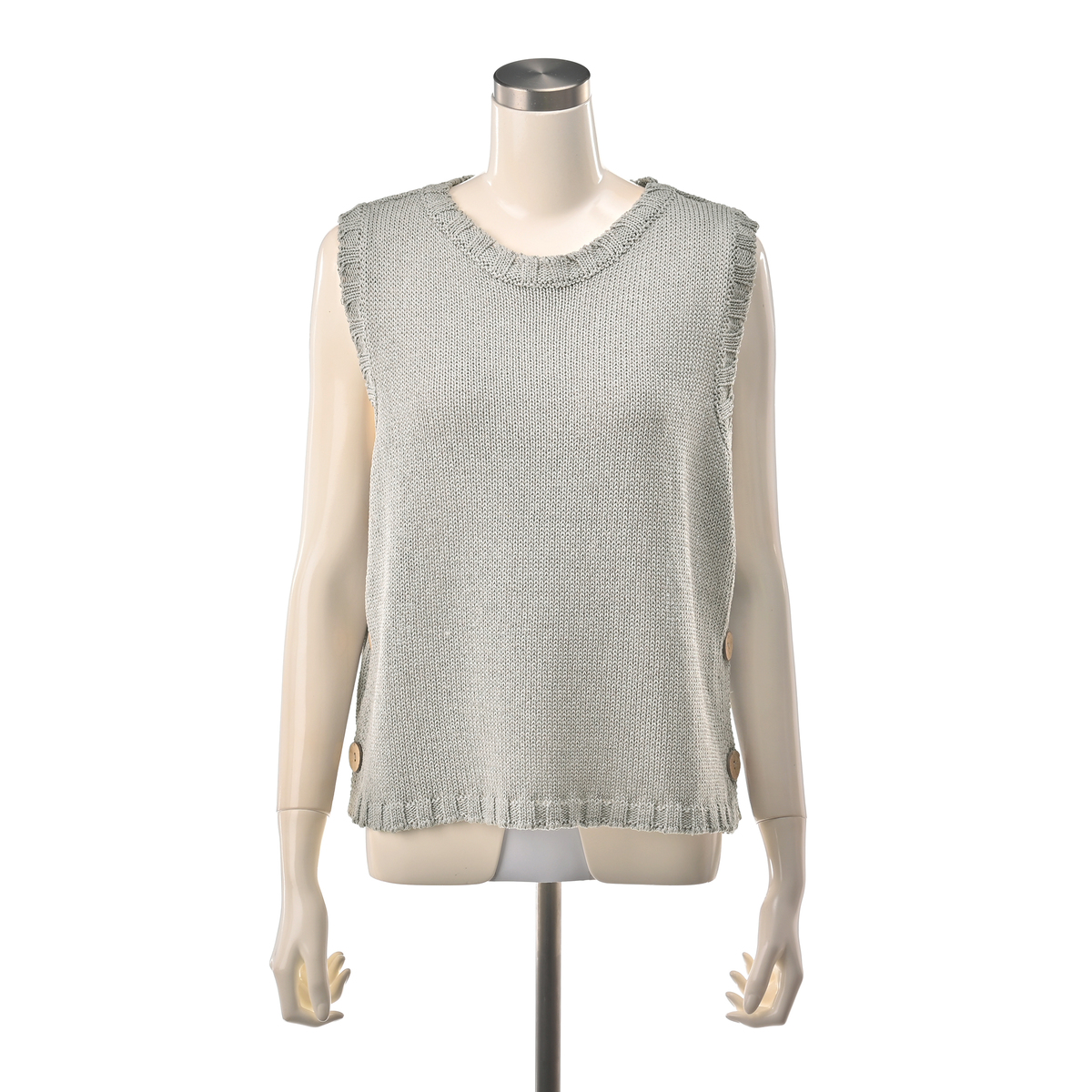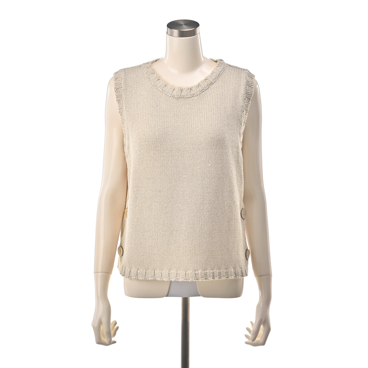 両脇の大きめボタンが特徴のニットベスト。Tシャツやブラウス、ハイネックインナーなどを重ねるだけで、着こなしに変化がうまれるアイテムです。身頃の両脇が大きく開いており、ボタンの開閉でニュアンスを調整可能。ローゲージならではのほどよい存在感が、レイヤードスタイルをまとめやすくしてくれます