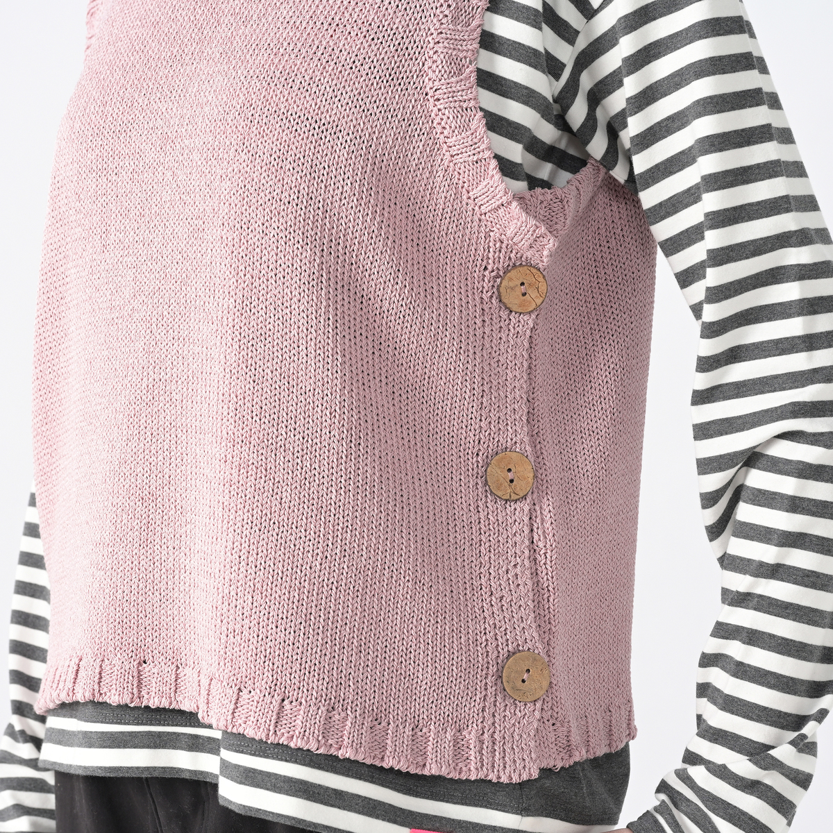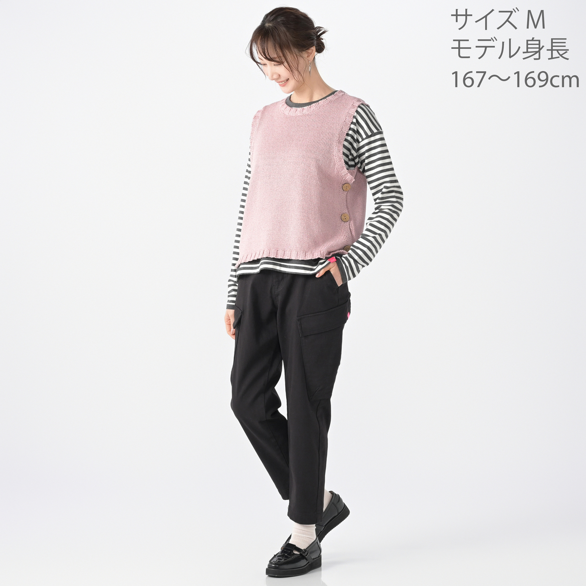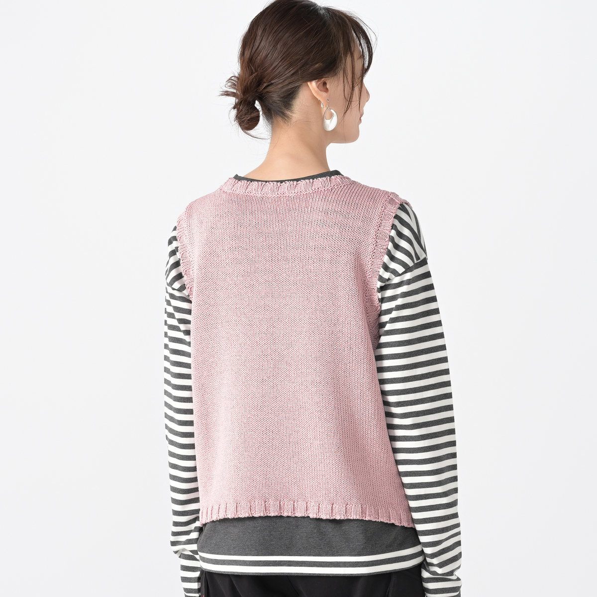 両脇の大きめボタンが特徴のニットベスト。Tシャツやブラウス、ハイネックインナーなどを重ねるだけで、着こなしに変化がうまれるアイテムです。身頃の両脇が大きく開いており、ボタンの開閉でニュアンスを調整可能。ローゲージならではのほどよい存在感が、レイヤードスタイルをまとめやすくしてくれます