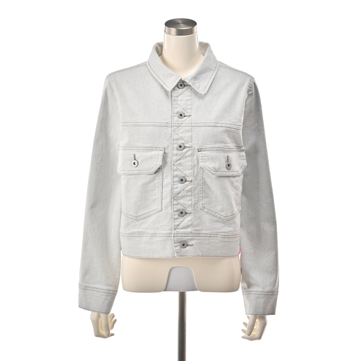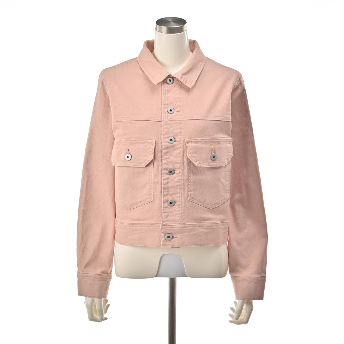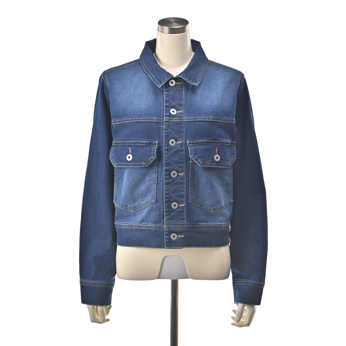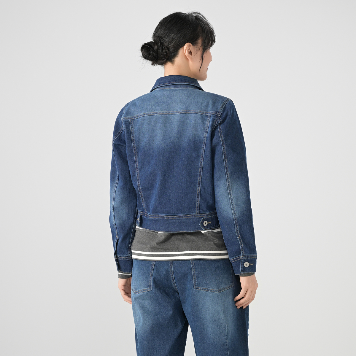 大きめのポケットがポイントのデニムジャケット。コンパクトなシルエットでスタイルアップ効果が期待できます