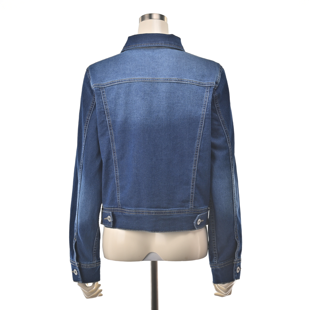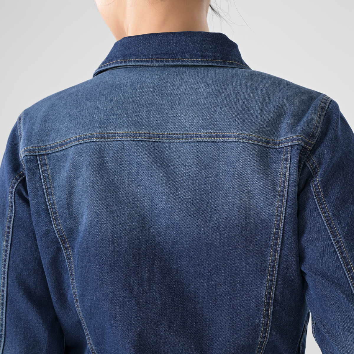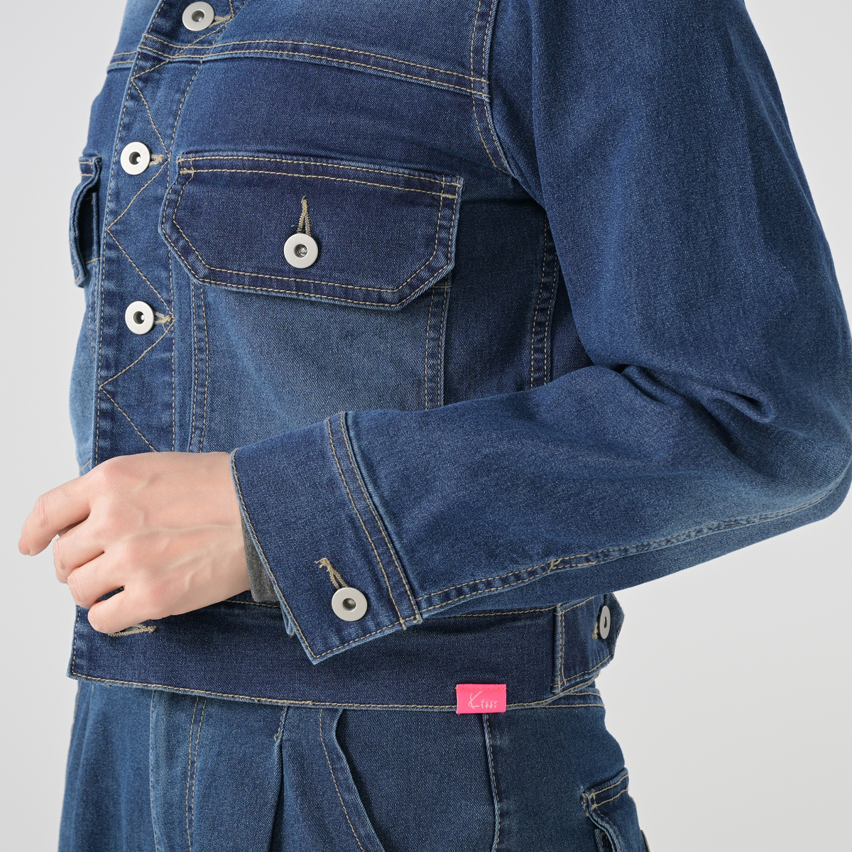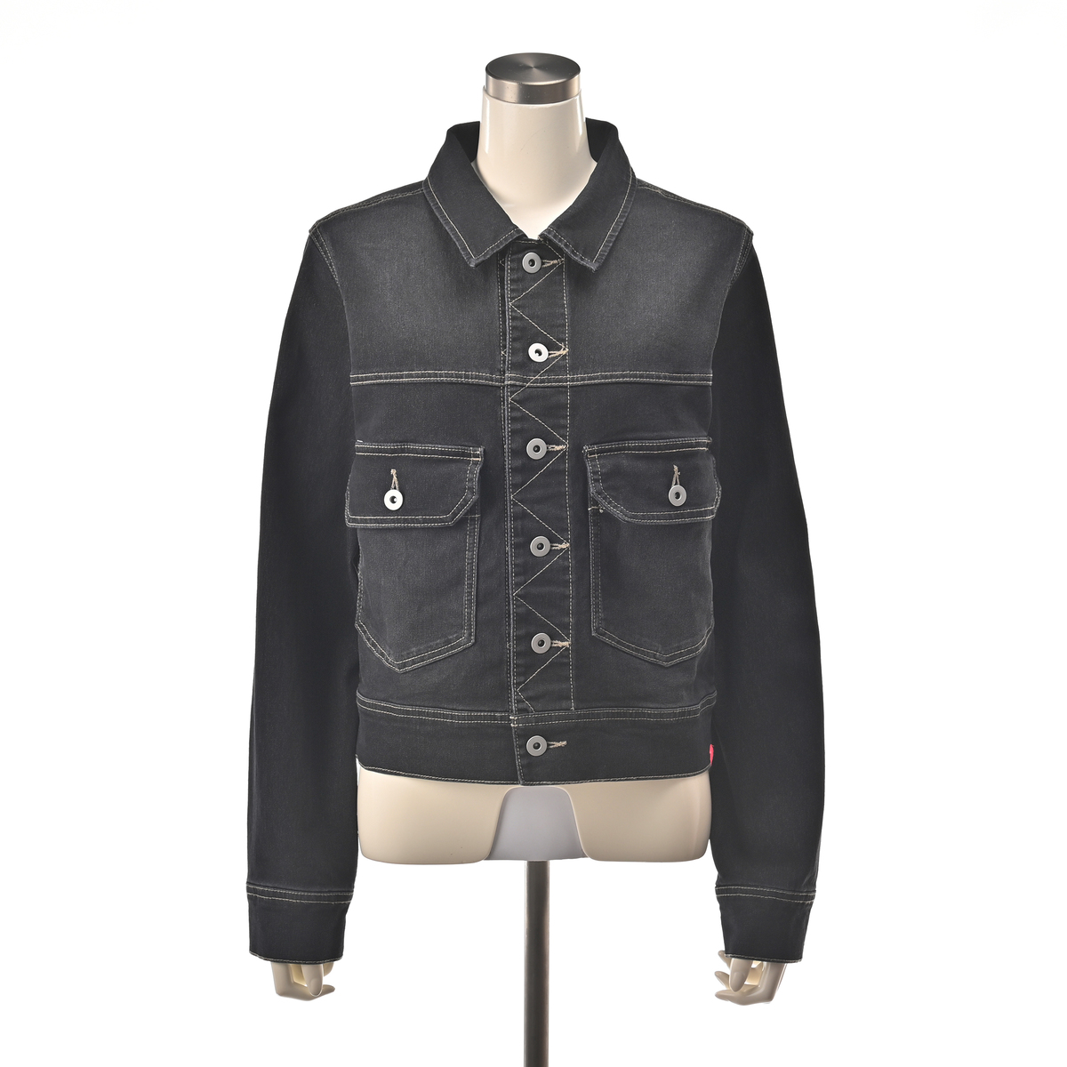 大きめのポケットがポイントのデニムジャケット。コンパクトなシルエットでスタイルアップ効果が期待できます
