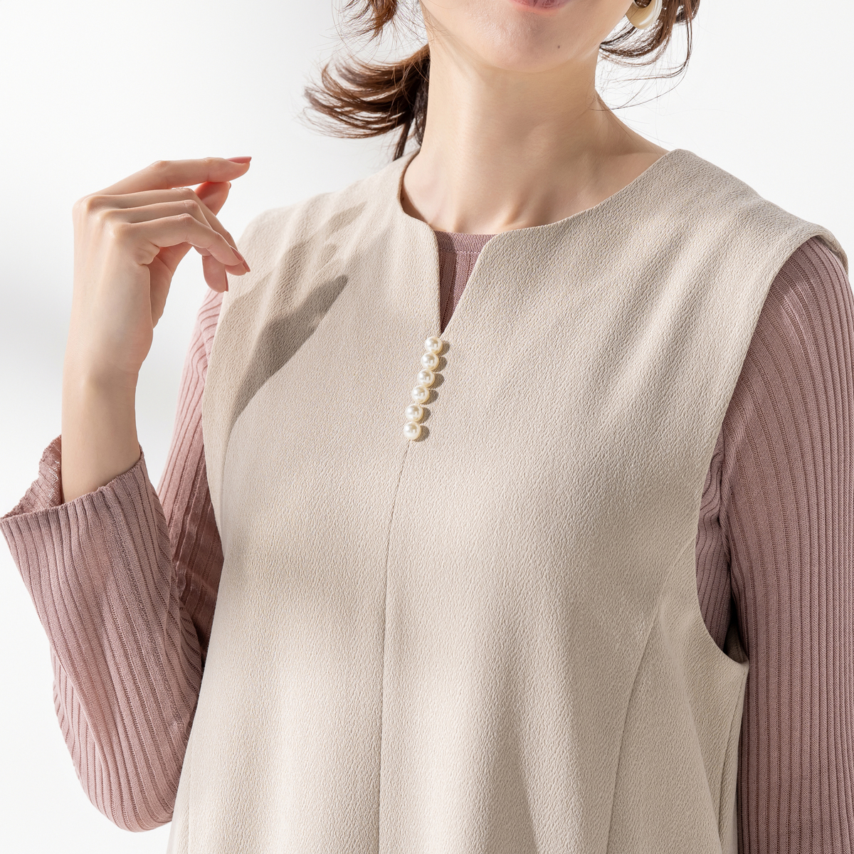Vネック仕様で様々なトップスと合わせやすく、フロントにあしらったパール調の飾りが上品なアクセントになっています