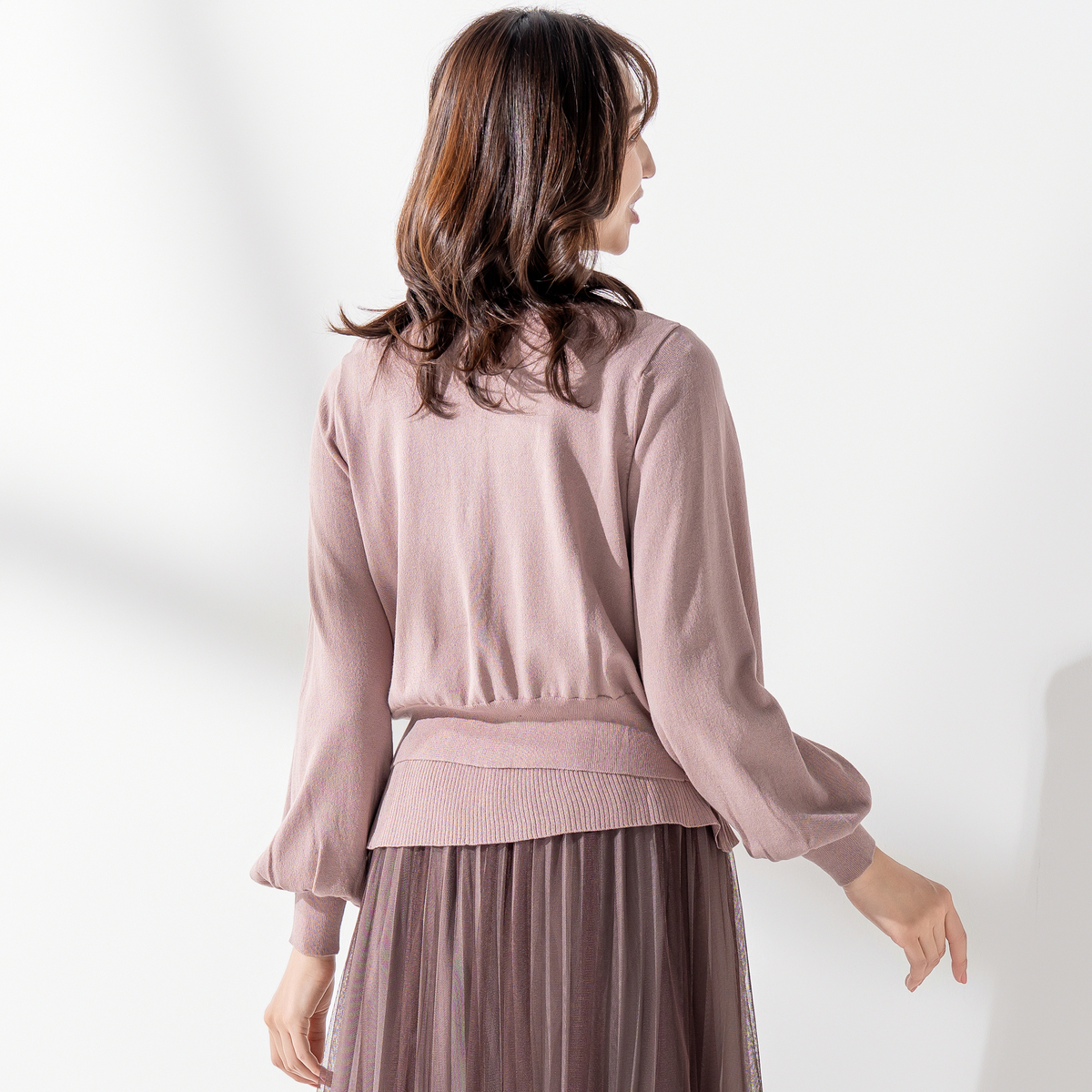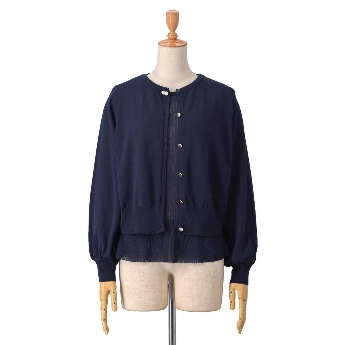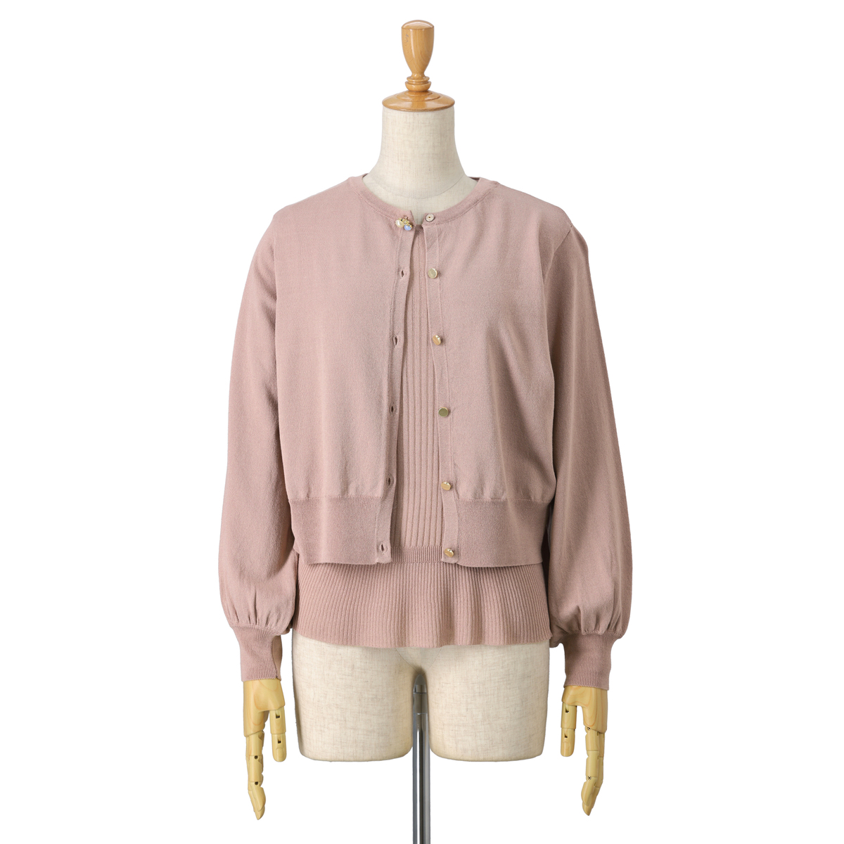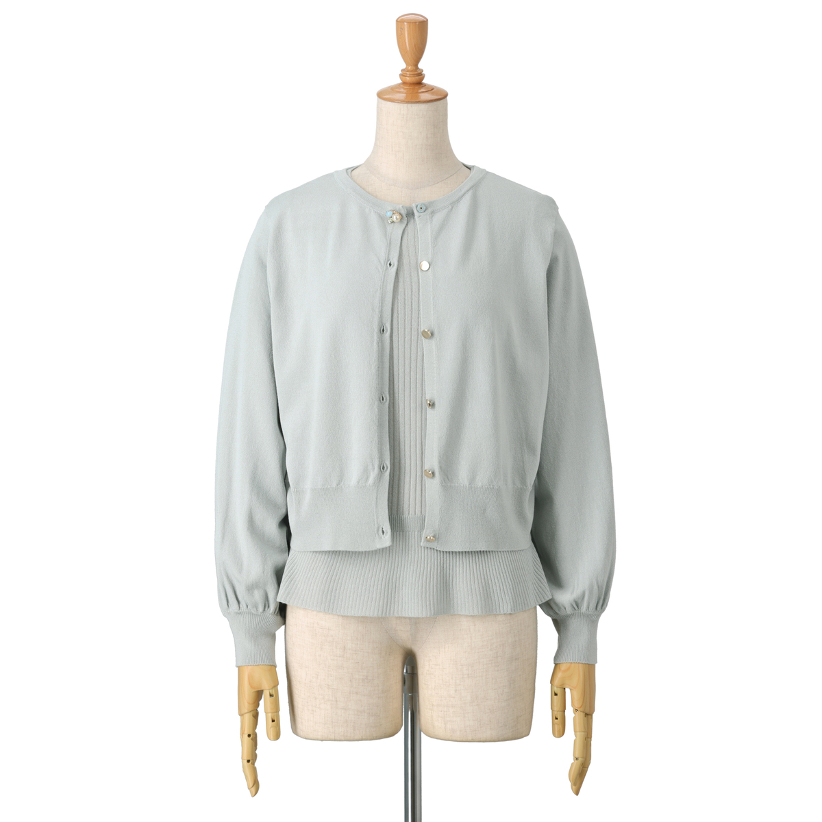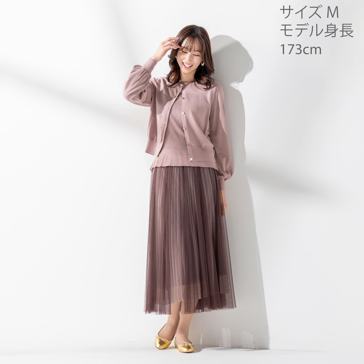 着回し自在なアンサンブル。セットで着ればコーデがすぐ整い、単品でも幅広い装いに活躍します。インナーはパンツやスカートと相性がよく、カーディガンは羽織りとしても便利で、メタル調ボタンと第一ボタンにあしらったビジューとパール調の飾りボタンが、上品な輝きを添えます