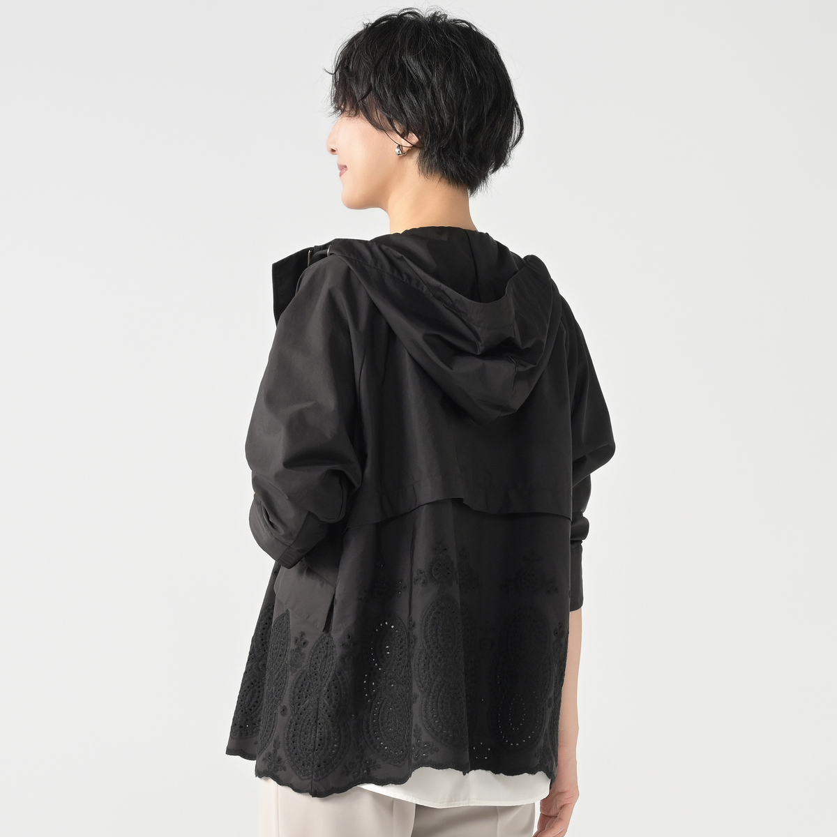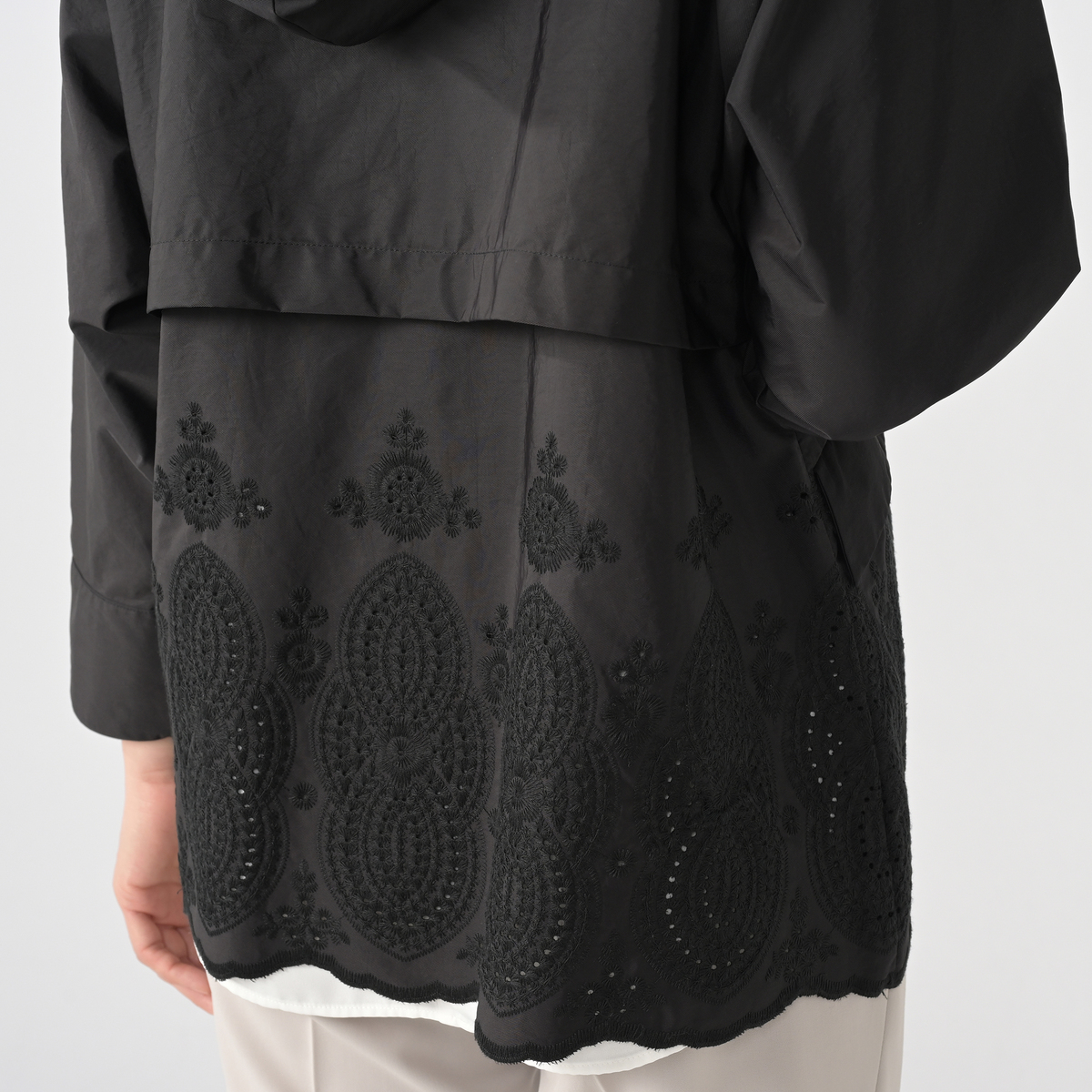 繊細な刺繍が美しく映えるマウンテンパーカー。スポーティな表情に、前後へ広がる大きめの刺繍が動きに合わせて豊かな表情を添えます。カジュアルながらも羽織るだけで装いがフェミニンに華やぐ一着です