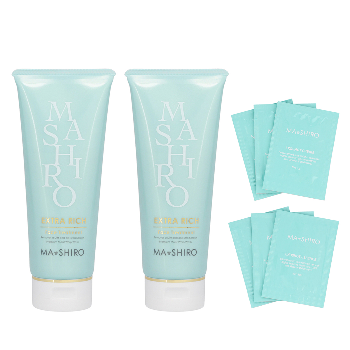 [商品内容] ・マ・シロ エクストラリッチ フェイストリートメント 200g×2 ・マ・シロ エクソショットクリーム1g(パウチ)×3 ・マ・シロ エクソショットエッセンス1ml(パウチ)×3 [使用方法] <フェイストリートメント> ・毎日(朝・夜)ご使用いただけます ・メイクオフした後に適量を手に取り、濡れた顔全体に薄く伸ばします。30秒から1分程度おいた後、マッサージするように泡立てながら水又はぬるま湯で洗い流してください。洗い残しがないように丁寧に洗い流してください <エクソショットクリーム> ・洗顔後、化粧水等でお肌を整えたあとに、適量(パール1粒大程度)を手に取り、お肌全体に優しくなじませてください <エクソショットエッセンス> ・洗顔後、手に取り、お肌になじませてください。その後、普段のお手入れをしてください [注意事項] ※お肌に異常が生じていないかよく注意して使用してください ※お肌に合わない場合はご使用をおやめください ※目に入らないようにご注意ください。入った場合は、こすらずにすぐ洗い流してください。目に遺物感が残る場合は、眼科医にご相談ください ※傷やはれもの、湿しん等、肌に異常のある部位にはお使いにならないでください ※使用中、または使用後直射日光があたって、赤み・はれ・かゆみ・刺激・色抜け(白斑等)や黒ずみ等の異常があらわれたときは、使用を中止してください。そのまま使用を続きますと症状を悪化させることがありますので、皮膚科専門医等にご相談されることをおすすめします ※乳幼児の手の届かないところに置いてください ※直射日光のあたるところや、極端に高温・低温のところには置かないでください ※開封後はお早めにご使用ください <フェイストリートメント> ※使用後はしっかりキャップをしめ、湿気を避け、衛生的に保管してください <エクソショットクリーム、エクソショットエッセンス> ※お肌の弱い方は腕の内側の皮膚の弱い部分に少量を塗布し、赤味やかゆみが起きないことをご確認ください 【日本製】 [成分] MA・SHIROエクストラリッチフェイストリートメント200g:水、グリセリン、ステアリン酸、ミリスチン酸、水酸化K、ラウラミドDEA、ステアリン酸PEG-150、ココイルメチルタウリンNa、バクハン石、コカミドプロピルベタイン、プラセンタエキス、カオリン、セラミドEOP、セラミドNP、セラミドAP、セレブロシド、フィトスフィンゴシン、スクワラン、ヒアルロン酸Na、パルミチン酸アスコルビルリン酸3Na、 水溶性プロテオグリカン、水溶性コラーゲン、オリーブ果実油、リパーゼ、プロテアーゼ、パパイン、アルブチン、アルギニン、アスパラギン酸、グリシン、アラニン、セリン、バリン、イソロイシン、トレオニン、プロリン、ヒスチジン、フェニルアラニン、PCA-Na、PCA、乳酸Na、加水分解エラスチン、マンダリンオレンジ果実エキス、セイヨウキズタ葉/茎エキス、アルニカ花エキス、キュウリ果実エキス、セイヨウニワトコ花エキス、ゼニアオイ花エキス、パリエタリアエキス、 ヒメフウロエキス、ワイルドタイムエキス、コレステロール、フムスエキス、クズ根エキス、セイヨウオトギリソウ花/葉/茎エキス、クレマティス葉エキス、スギナエキス、セイヨウナツユキソウ花エキス、ヒバマタエキス、アロエベラ葉エキス、カミツレ花エキス、クロレラエキス、セイヨウトチノキ種子エキス、トウキンセンカ花エキス、ハマメリス葉エキス、他 MA・SHIROエクソショットクリーム:プラセンタエキス/BG/リンゴ酸ジイソステアリル/ペンチレングリコール/グリセリン/(アクリル酸Na/アクリロイルジメチルタウリン/ジメチルアクリルアミド)クロスポリマー/セチル2-グリセリルアスコルビン酸/水溶性プロテオグリカン/ハイドロキノン/グレープフルーツ果実エキス/ローズマリー葉エキス/セレブロシド/セラミドAP/セラミドNP/グルコシルセラミド/ナイアシンアミド/トコフェロール/水添レチノール他 MA・SHIROエクソショットエッセンス:プラセンタエキス/BG/グリセリン/ペンチレングリコール/ベタイン/3-O-エチルアスコルビン酸/テトラヘキシルデカン酸アスコルビル/3-ラウリルグリセリルアスコルビン酸/ハマナス花エキス/ロニセラカエルレア果汁/ヒマワリ種子油/メロン種子油/トコフェロール/ジイソステアリン酸ポリグリセリル-10/ラウリン酸ポリグリセリル-10/クエン酸Na他
