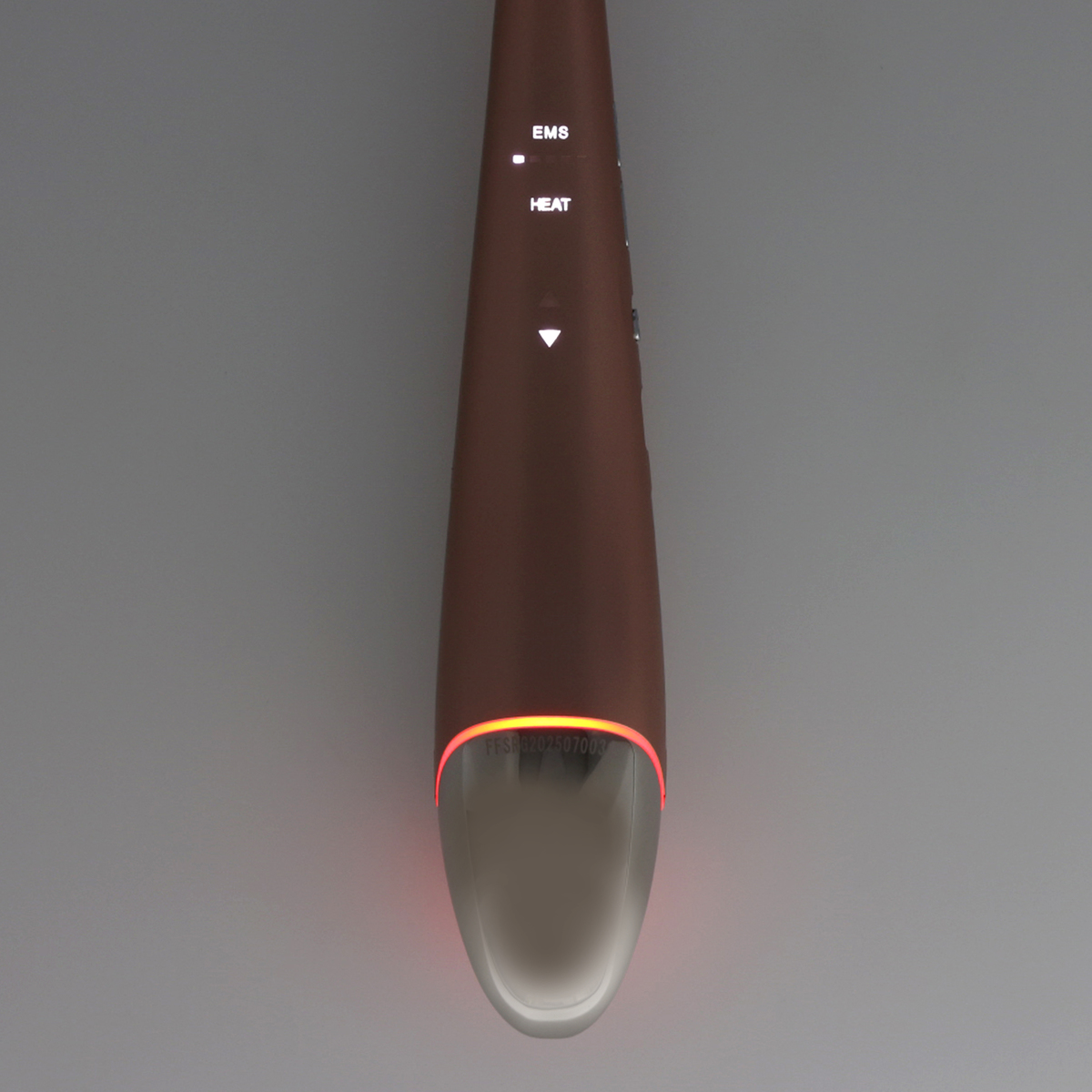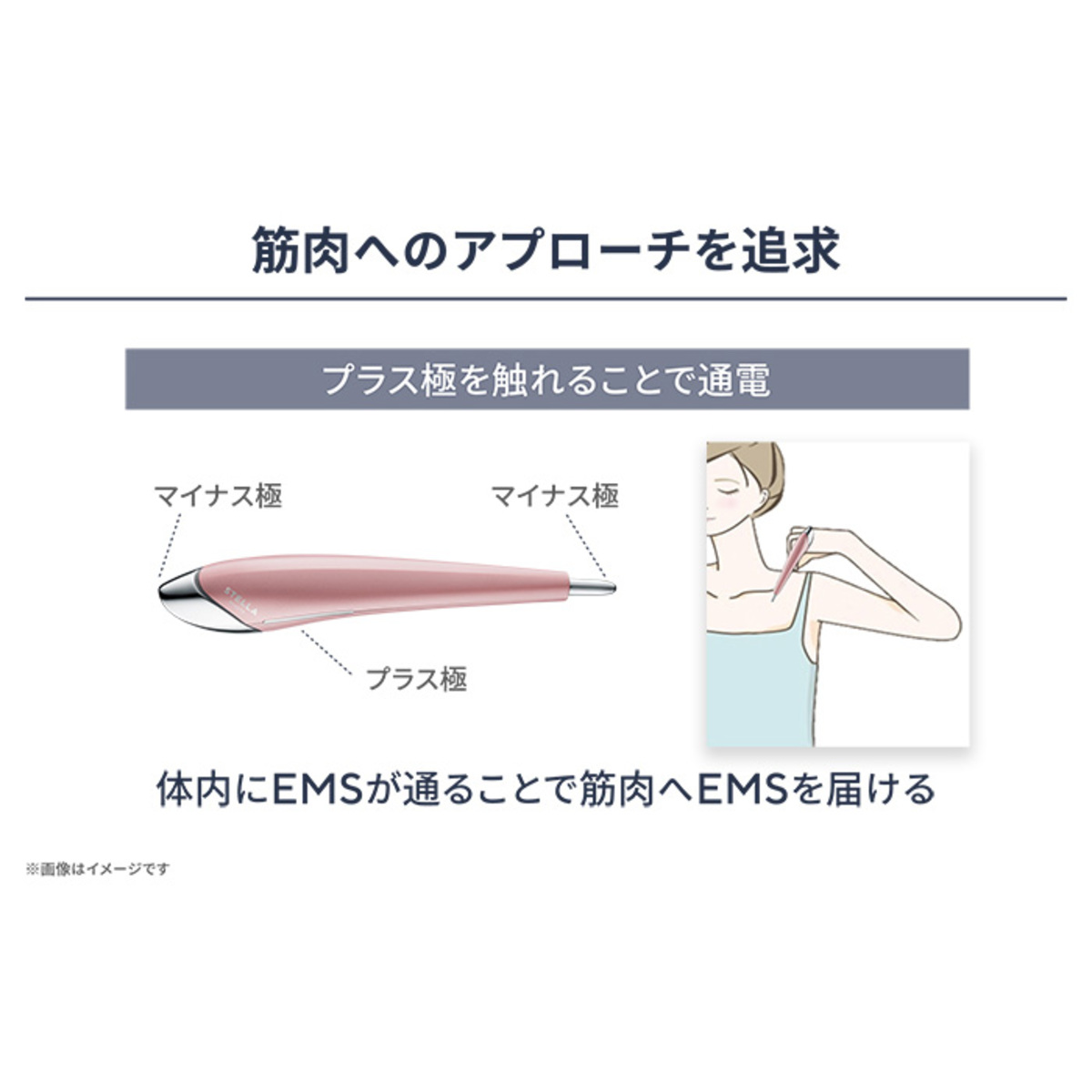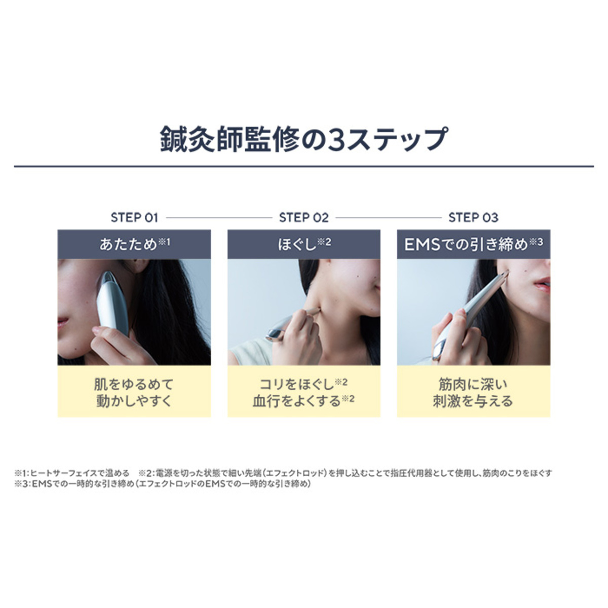 あたため・EMSで筋肉を鍛える・指圧代用器*1が1台で可能なスティック型の美顔器。EMSの電気刺激を表情筋に与え、筋肉を収縮させることにより表情筋をトレーニング。約41度の温めでお顔を温め、目の周りやフェイスラインなどお顔全体に使えます*2