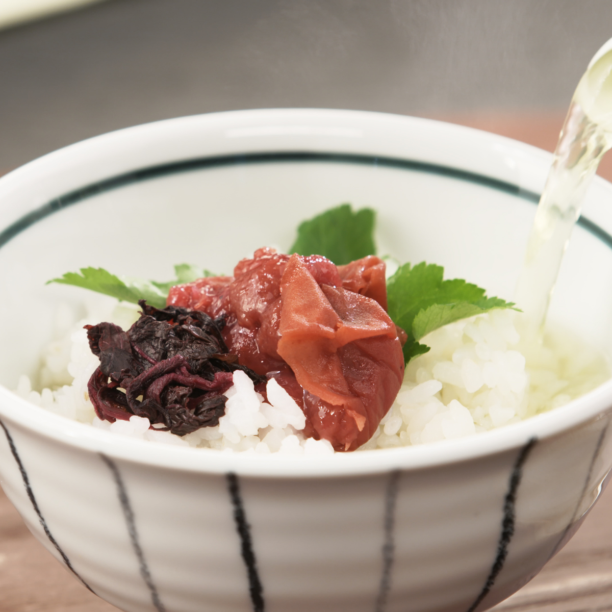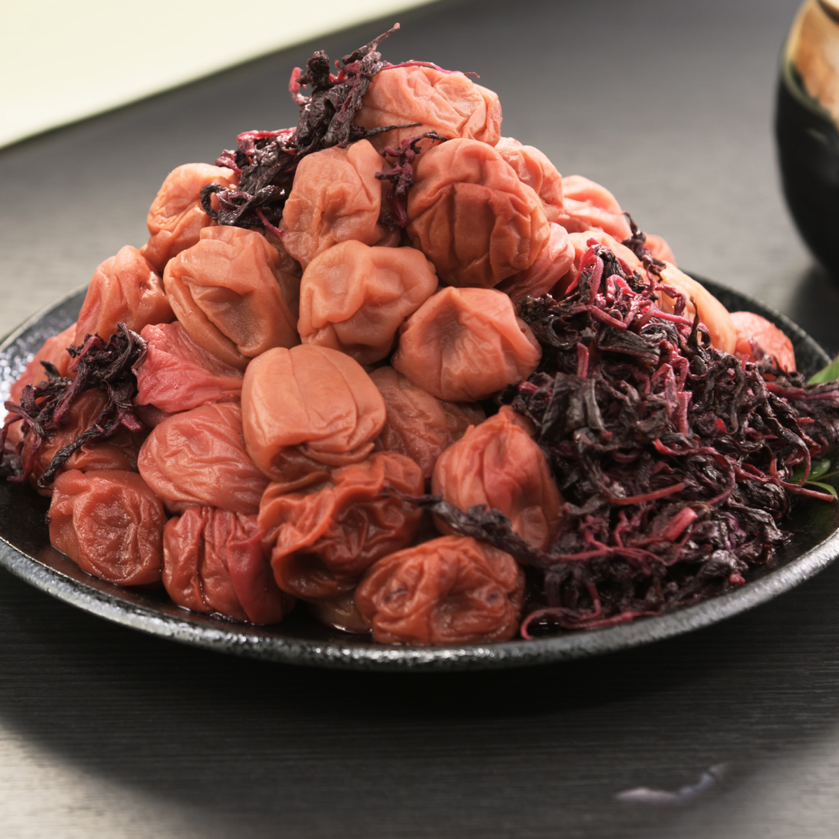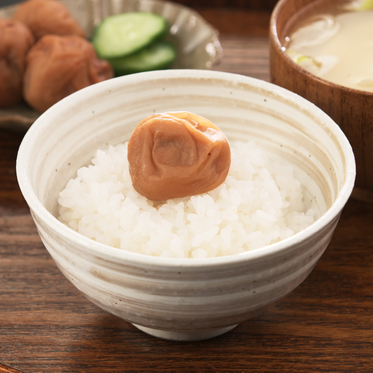 国産の赤しそ液を使って、じっくりと漬け込みました。適度な酸味でご飯ともよく合います。可食部100gあたり塩分約8%(*2)。ジューシーな果肉と、しそのさっぱり感を味わえる中粒2Lサイズの梅干しです