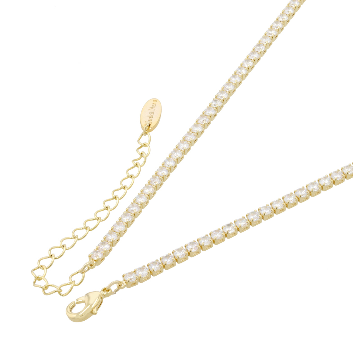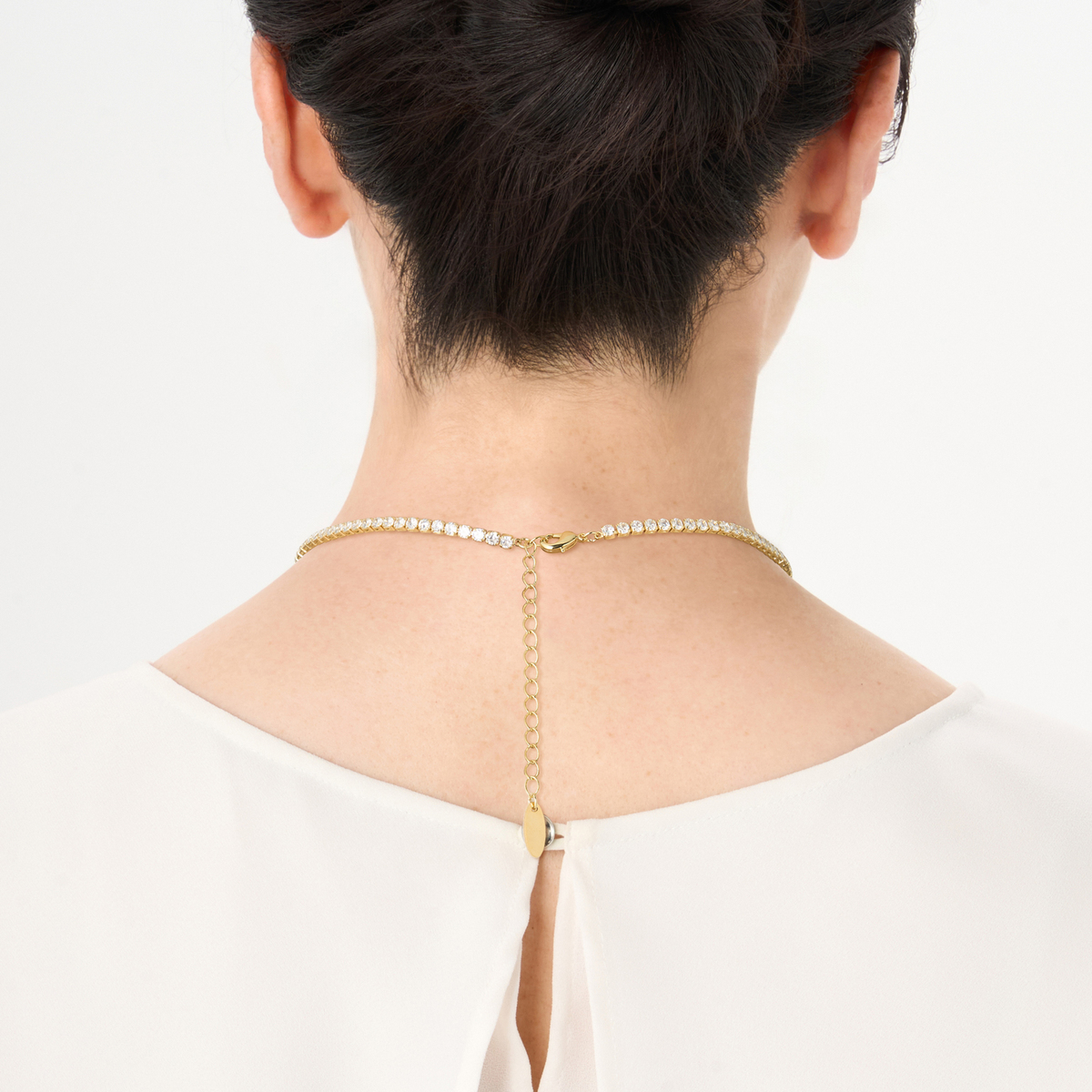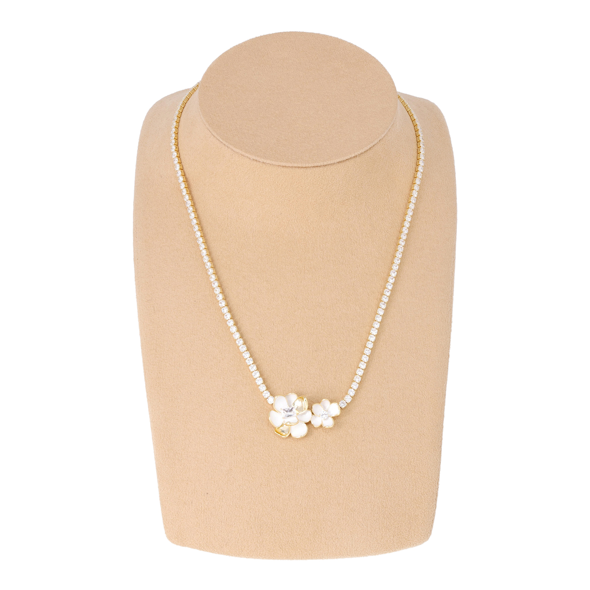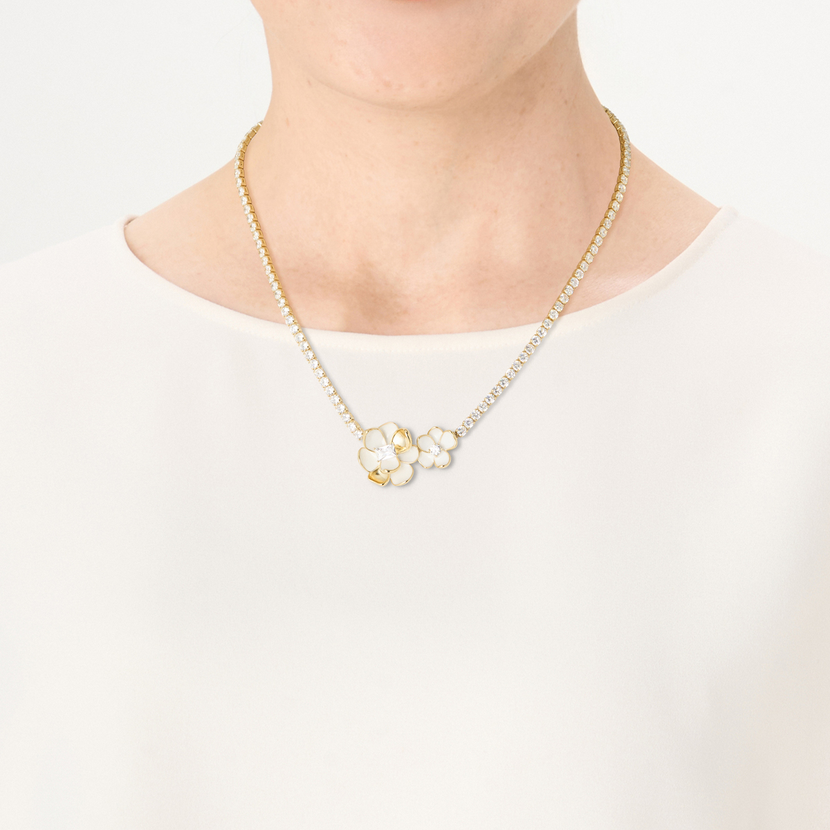 繊細な輝きが胸元を彩るネックレス。華奢なチェーンに散りばめられた110石以上のキュービックジルコニアが光を受けてきらめきます。中央にはホワイトとゴールドカラーのコントラストが美しいフラワーモチーフを2輪配置し、上品で優雅な印象に仕上げました