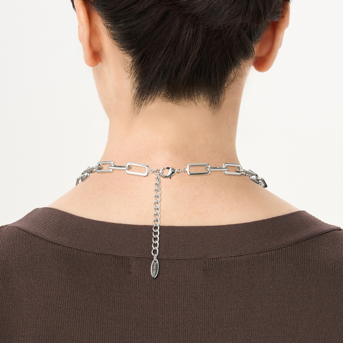 洗練された長方形チェーンが連なるネックレス。モダンなデザインに、290石以上のキュービックジルコニアが輝きを添えます。鏡面加工のメタルとのコントラストが上質感を演出し、カジュアルにもフォーマルにも合わせやすい一品です